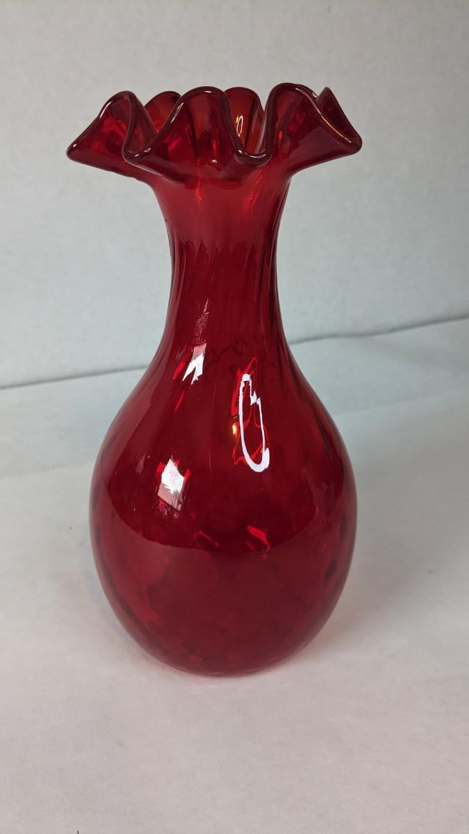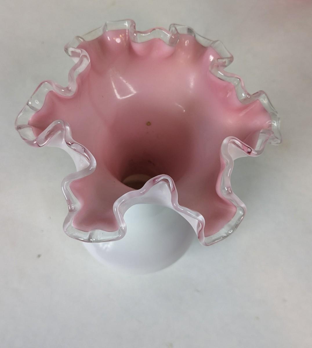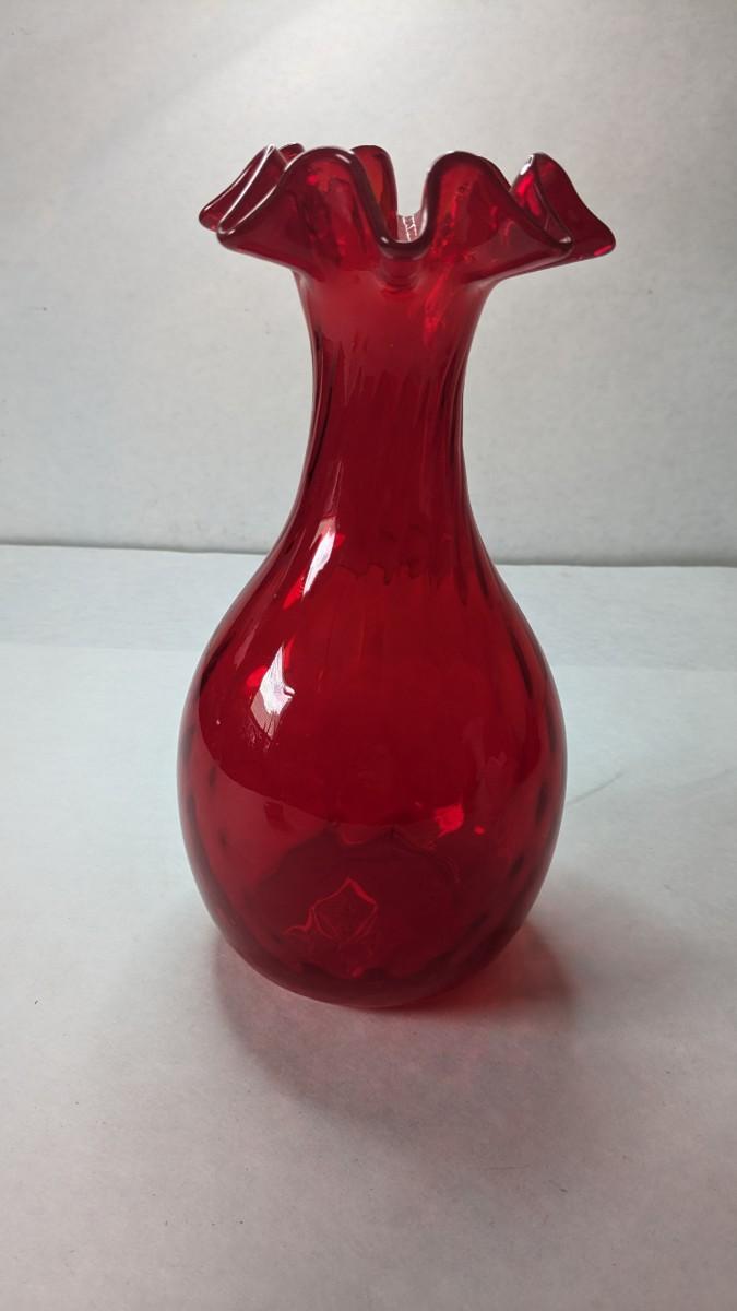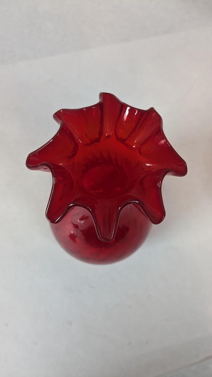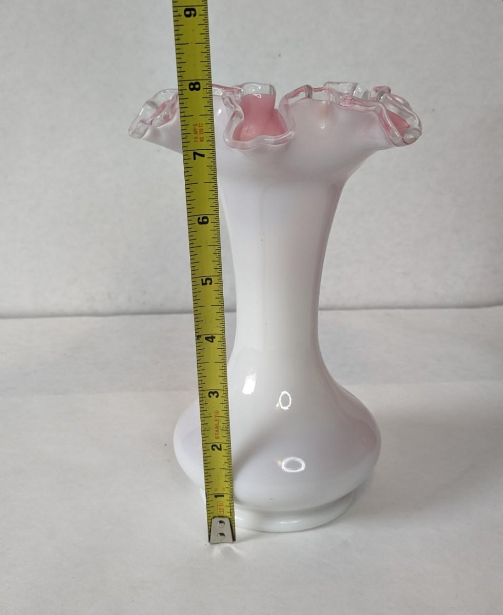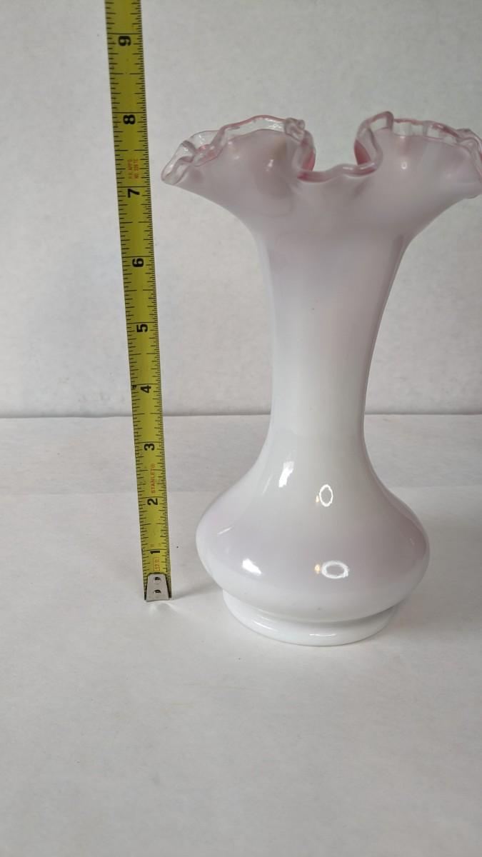 (4) gorgeous ruffle glass pieces varying in size and shape. Includes opalescent blue hobnail presumed Fenton piece. White with inner pink ruffle and solid red ruffle vases, as well as marked Fenton dish from Estes Park. All are in excellent condition with no flaws noted and just SO SO beautiful in person. Extra handling fees will apply.