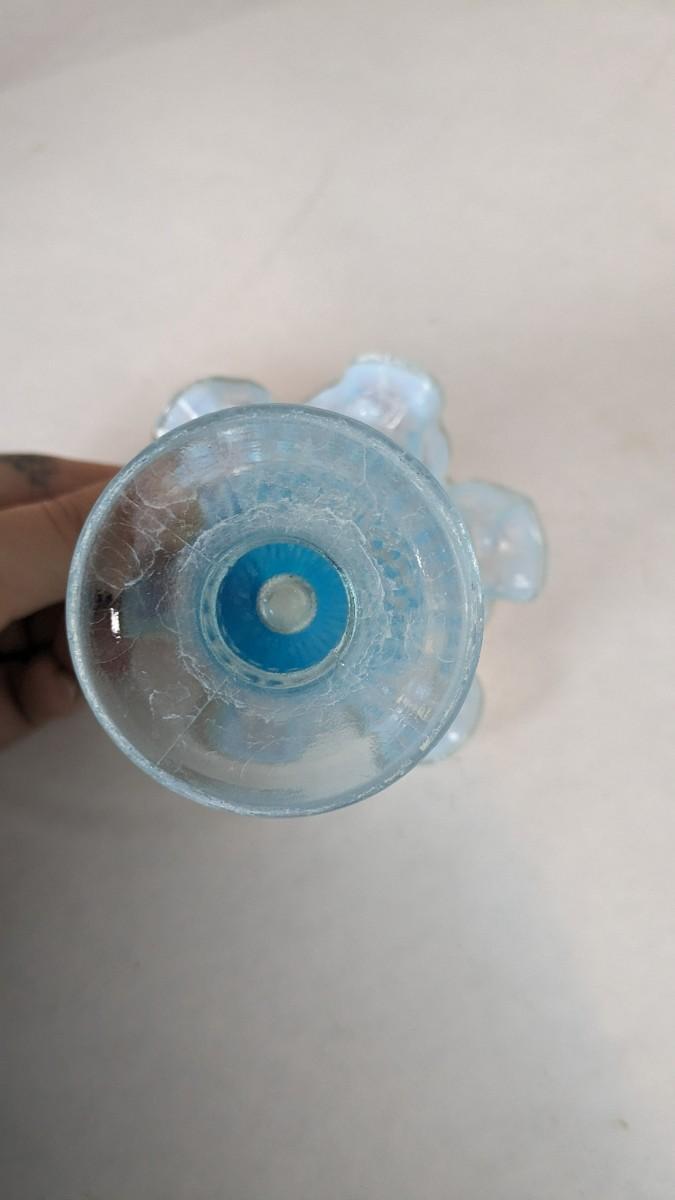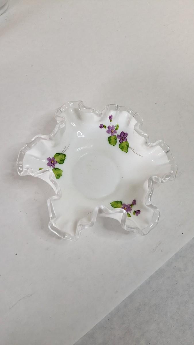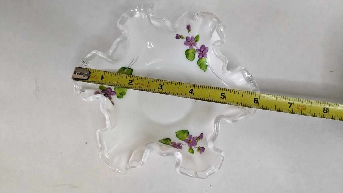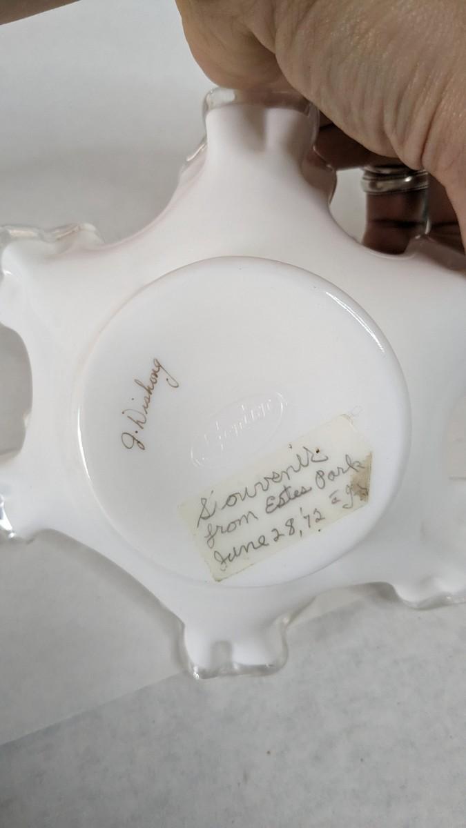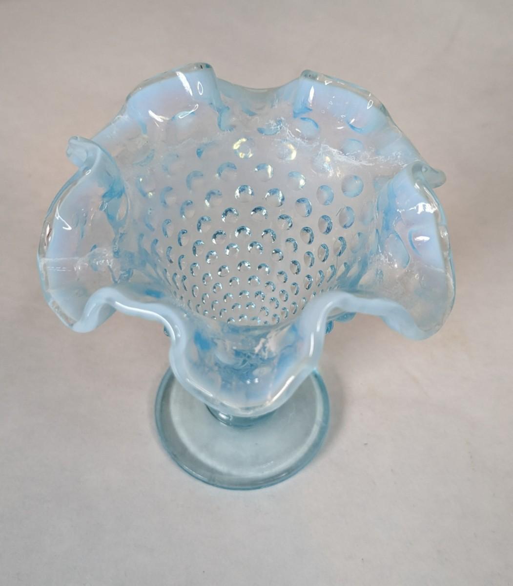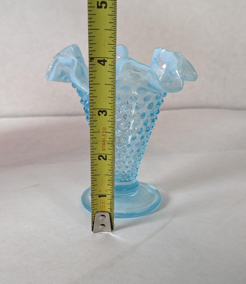 (4) gorgeous ruffle glass pieces varying in size and shape. Includes opalescent blue hobnail presumed Fenton piece. White with inner pink ruffle and solid red ruffle vases, as well as marked Fenton dish from Estes Park. All are in excellent condition with no flaws noted and just SO SO beautiful in person. Extra handling fees will apply.