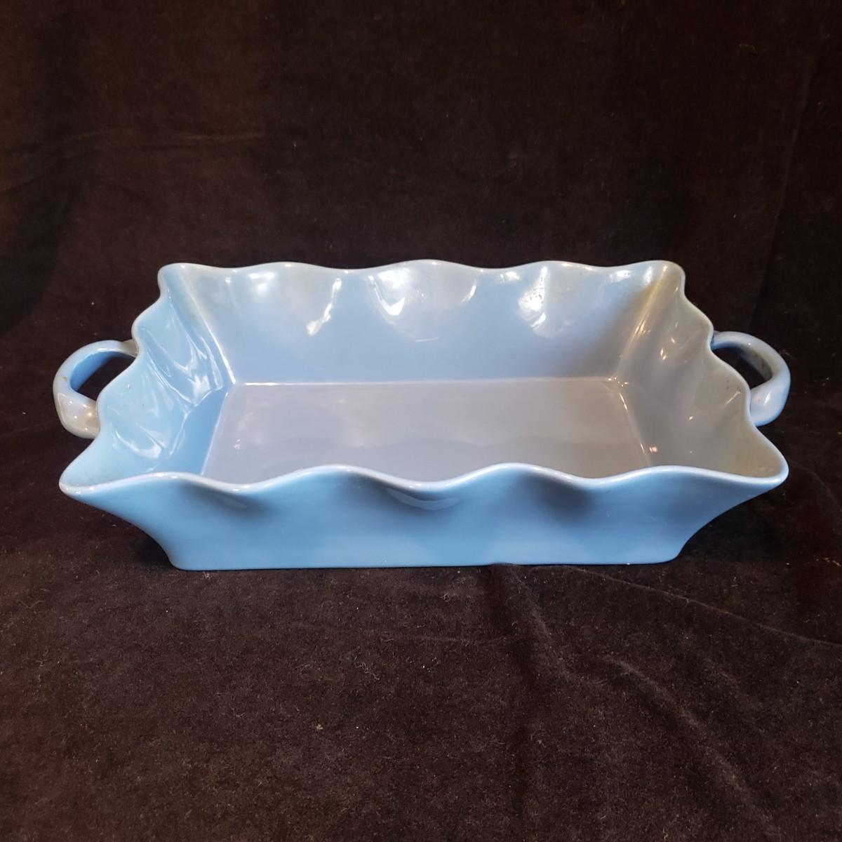 This two-piece ruffled bake ware is oven safe. The blue casserole dish measures 12" x 9". Both pieces are ready for your favorite recipes!