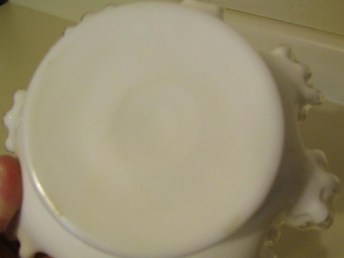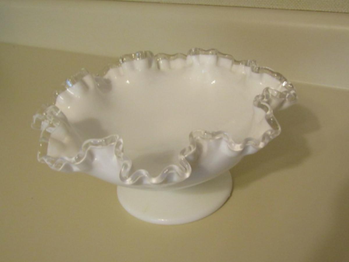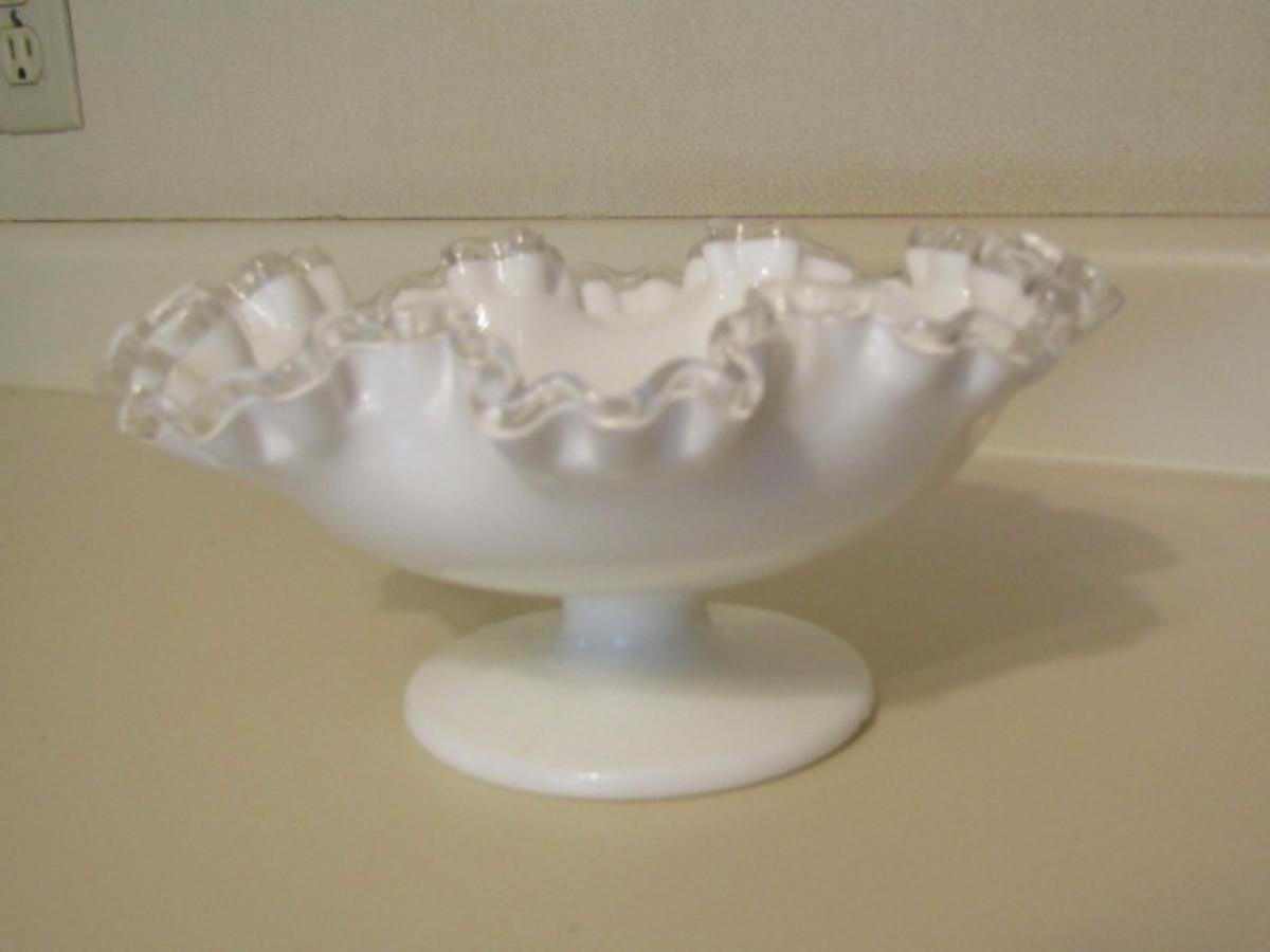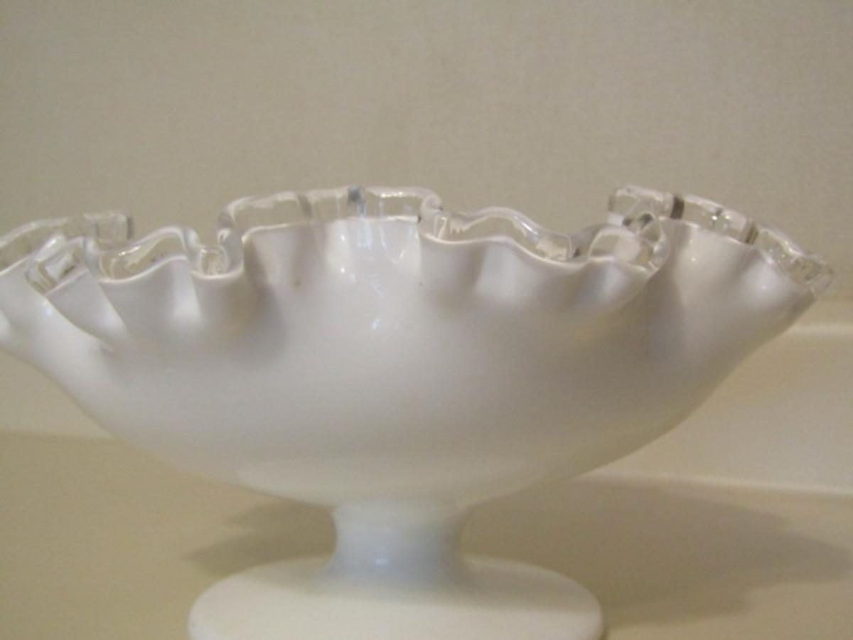 Ruffled Dish on Pedestal- White with Clear Trim- Possibly Fenton