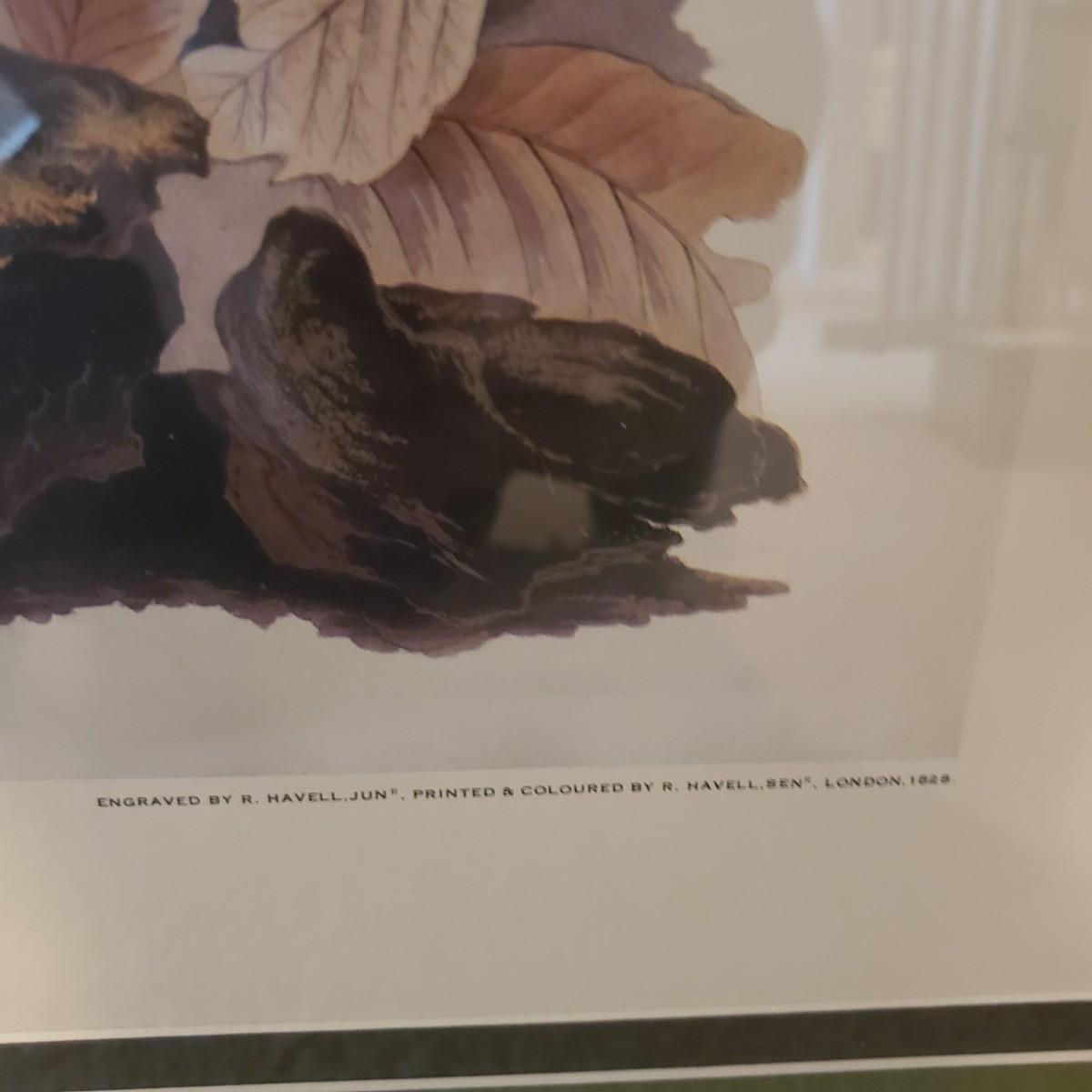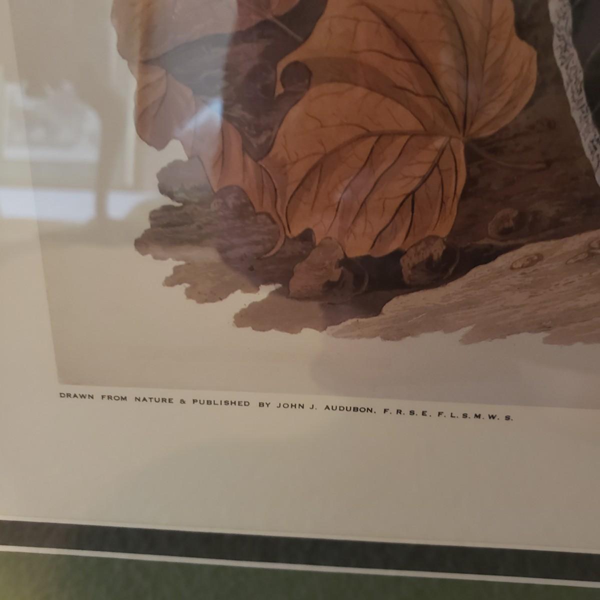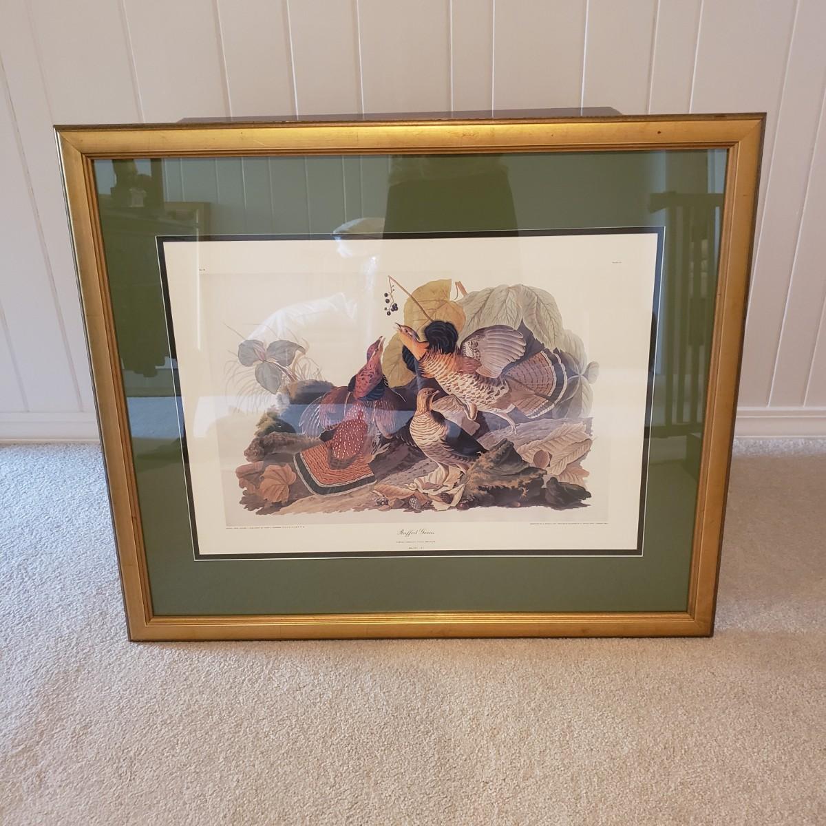 This 28" x 38"H Audubon print No. 9 is of a Ruffled Grouse. It is framed in glass with a gold/wooden frame. The gold crackle has hints of red showing through.