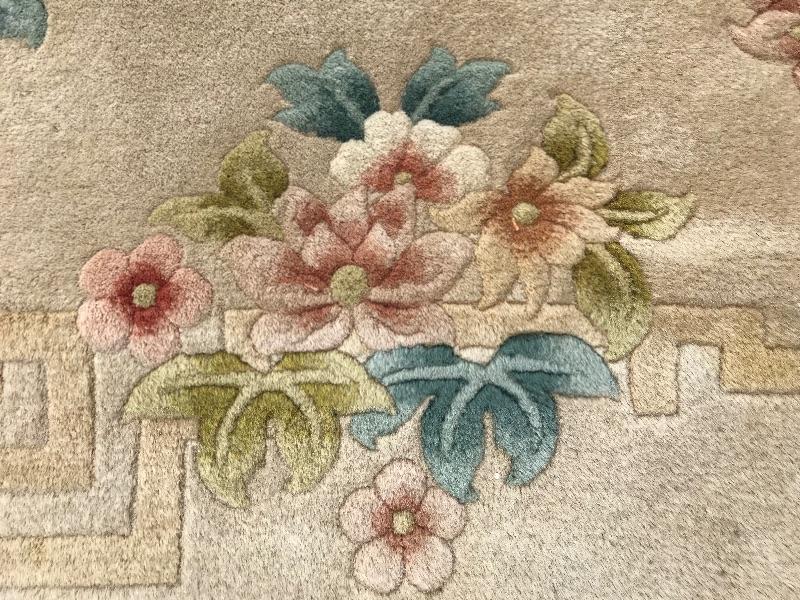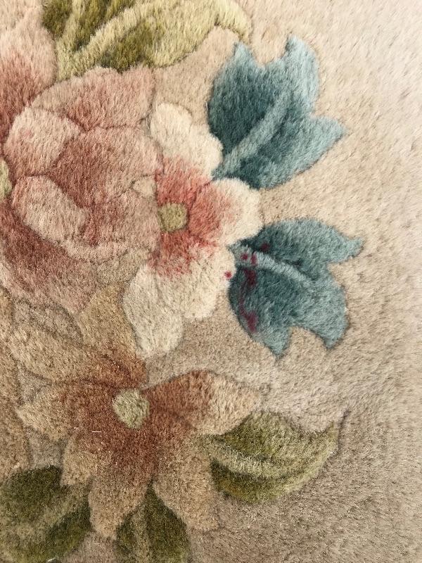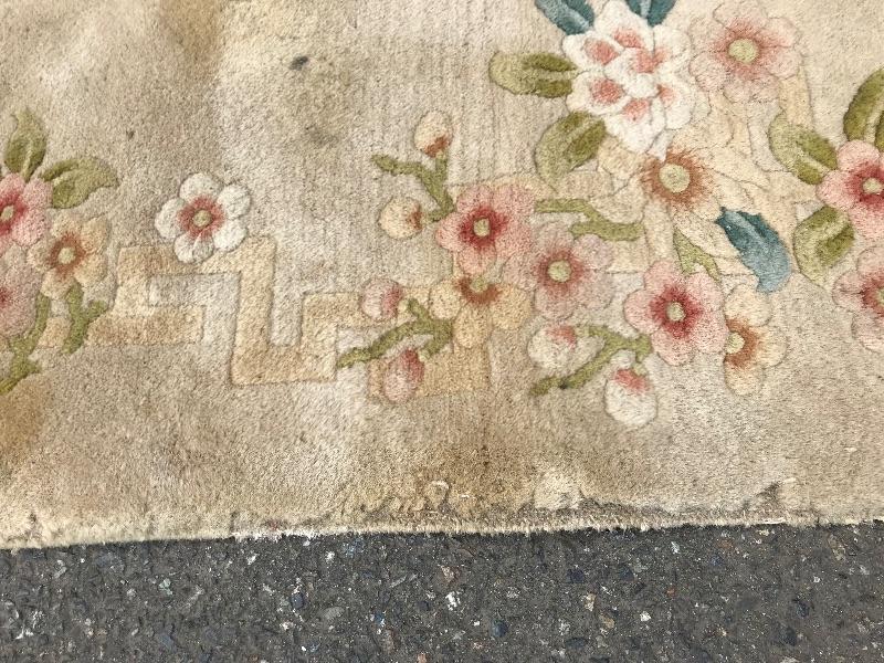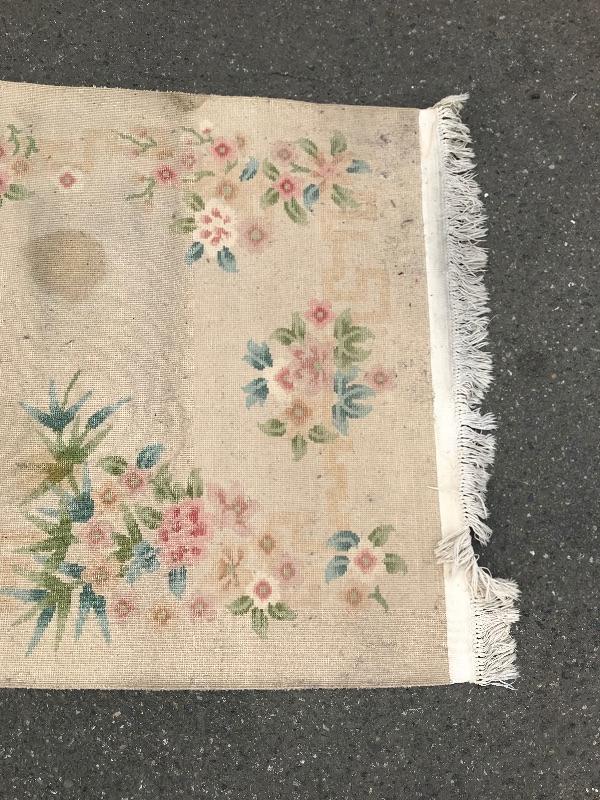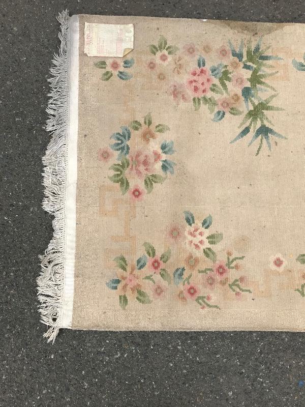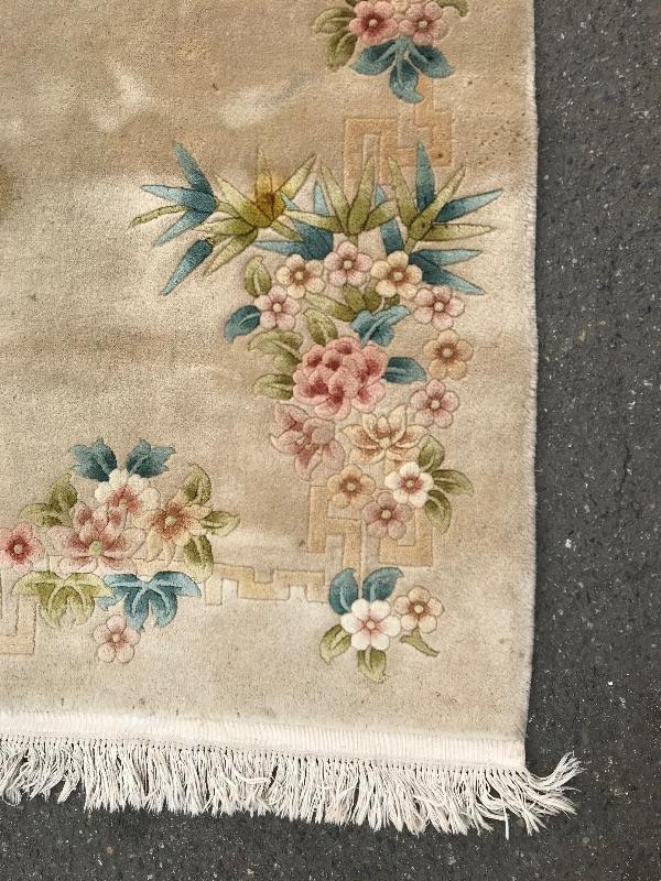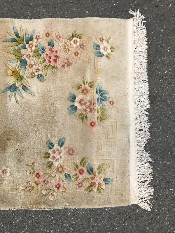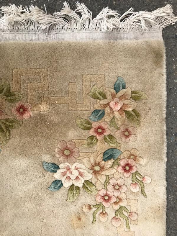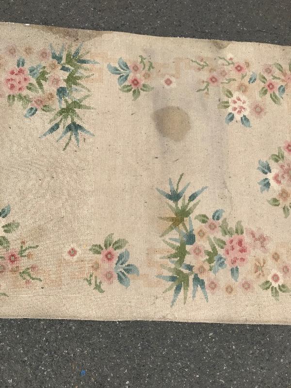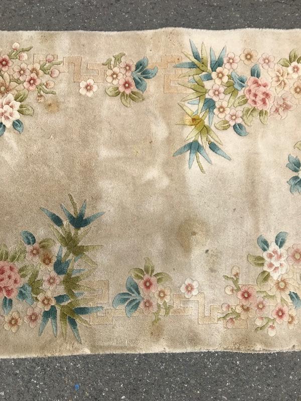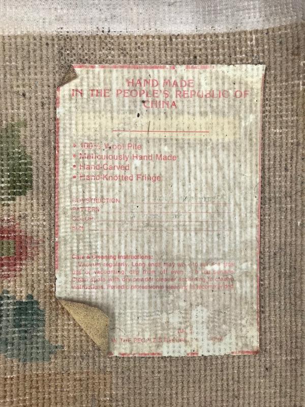 Handmade in the People's Republic of China. Features botanical details! There are some faint stains. No musty smell. Dimensions are 6ft x 3.5ft