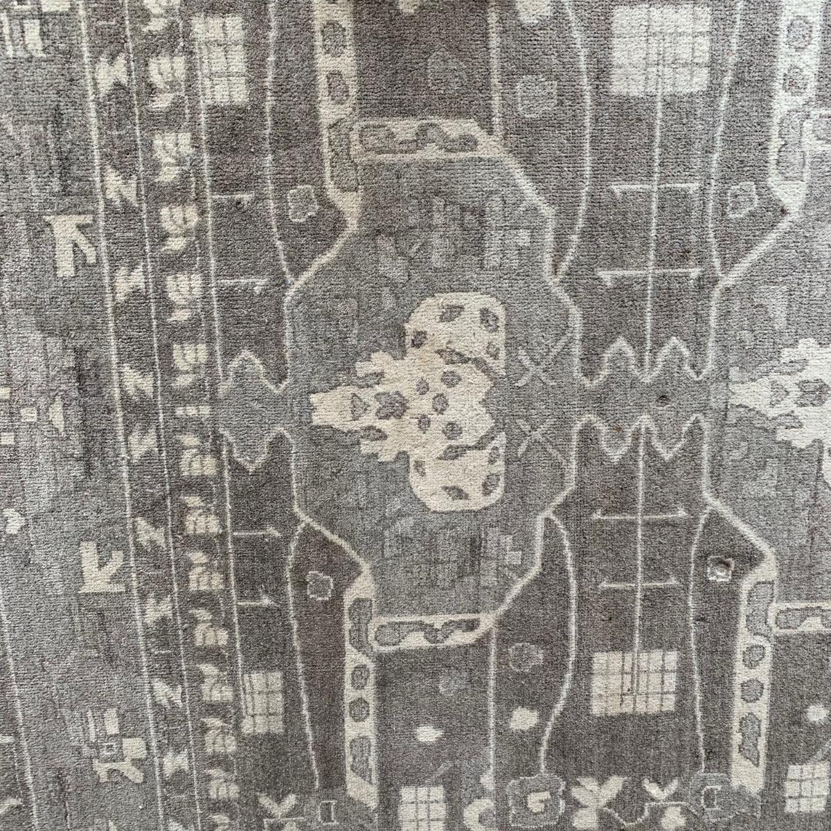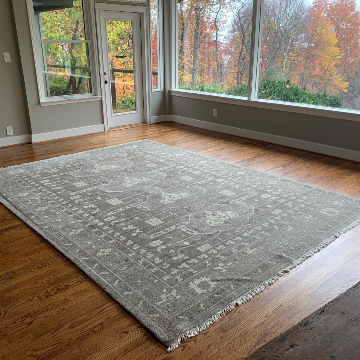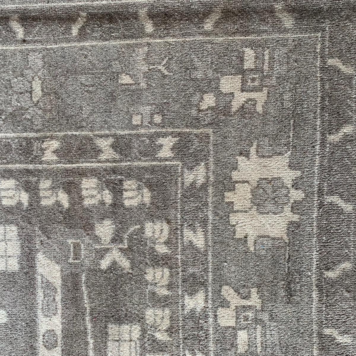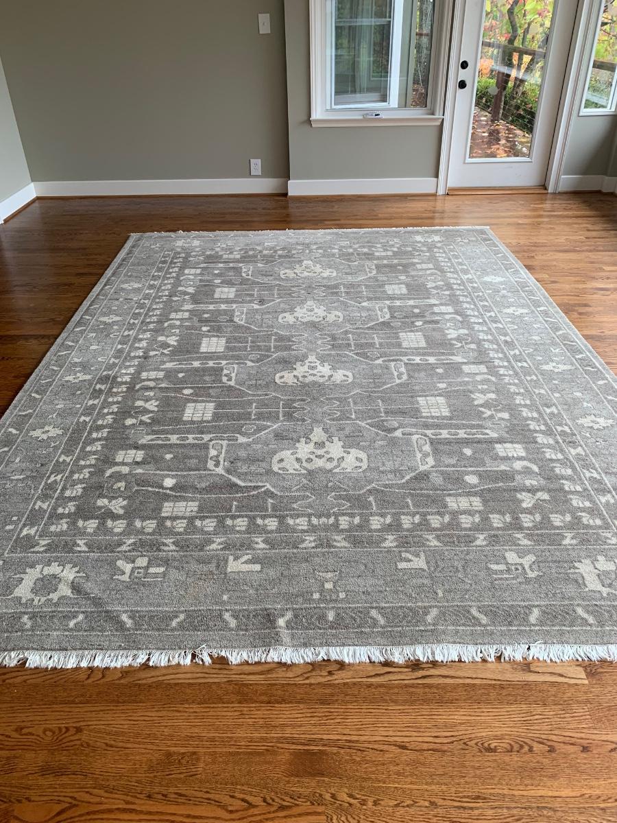 Large grey Rug & Home wool area rug with pad. Item measures 11’ x 8.5'. This rug has slight discoloration in one area that could likely be removed with cleaning. Otherwise this rug is in good condition. It features white designs against a grey background which creates a very clean look. Please see photos for additional details.