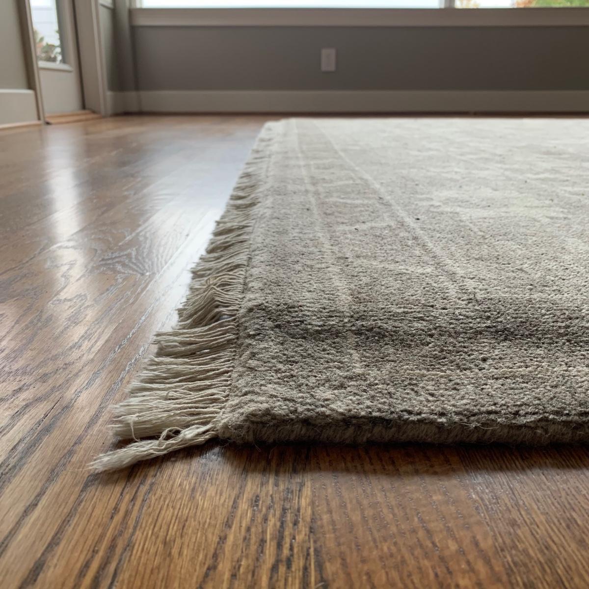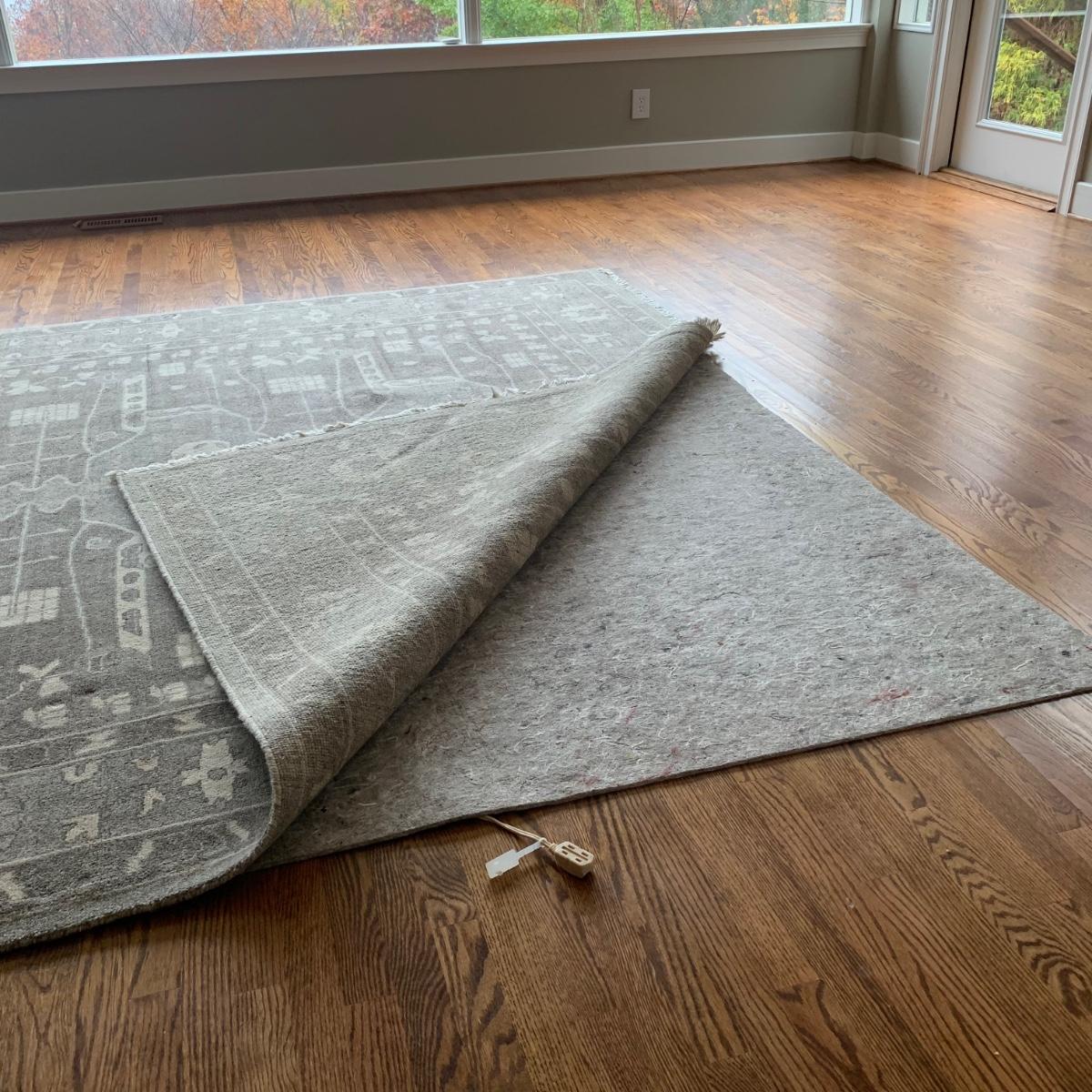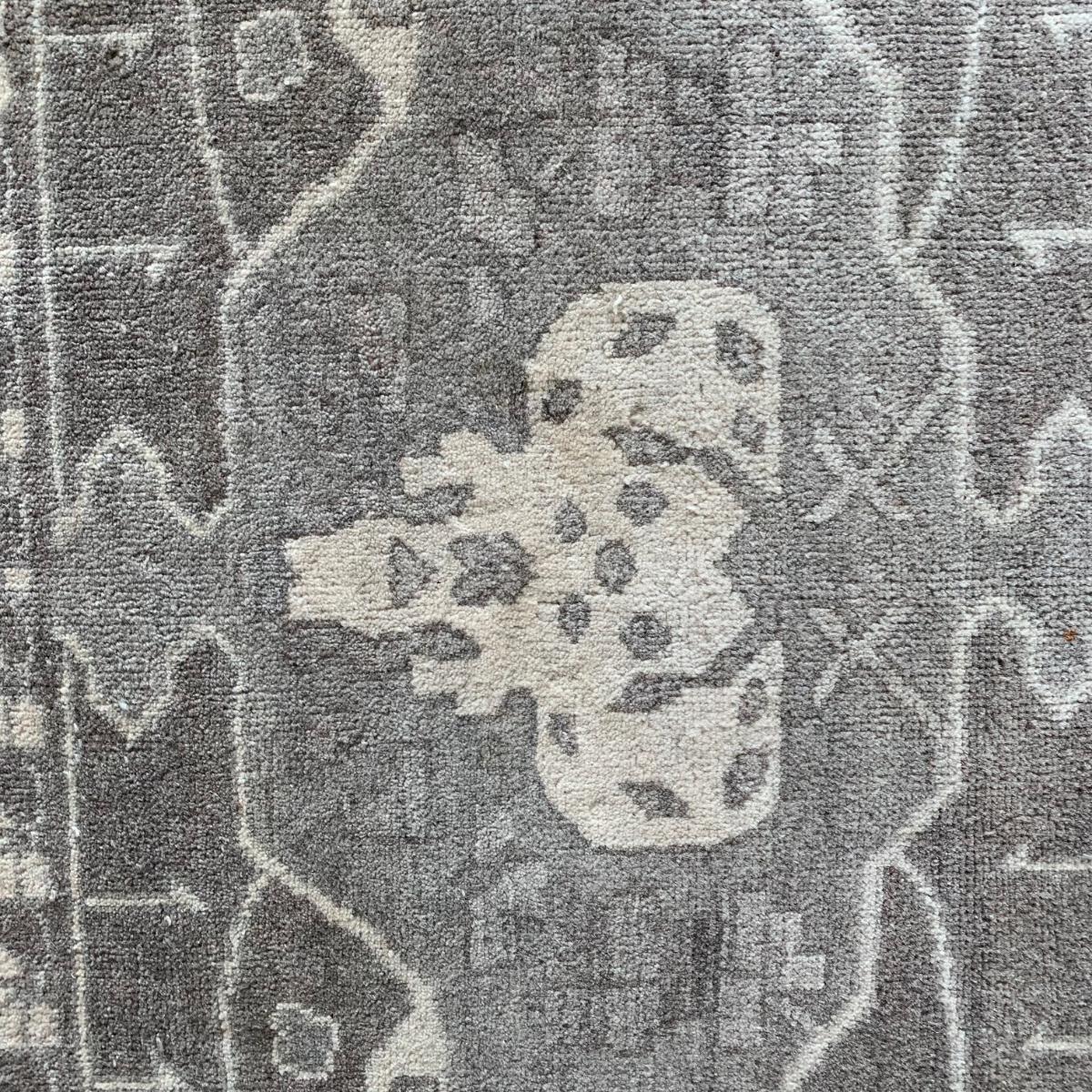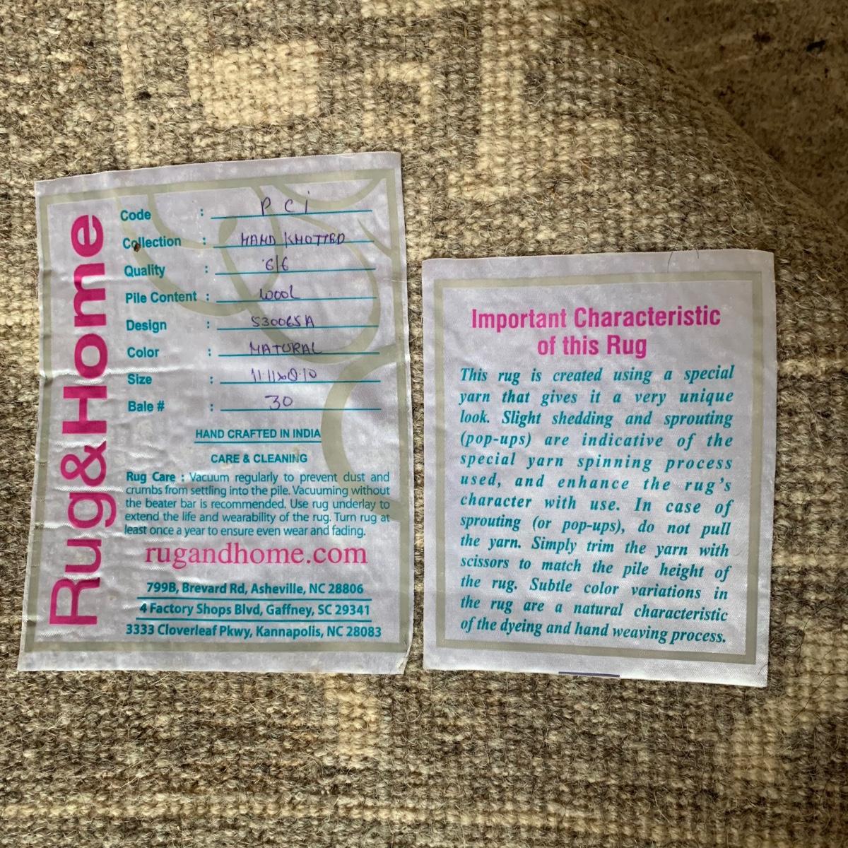 Large grey Rug & Home wool area rug with pad. Item measures 11’ x 8.5'. This rug has slight discoloration in one area that could likely be removed with cleaning. Otherwise this rug is in good condition. It features white designs against a grey background which creates a very clean look. Please see photos for additional details.