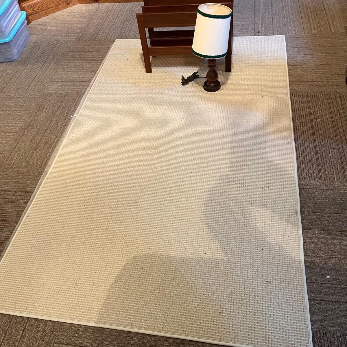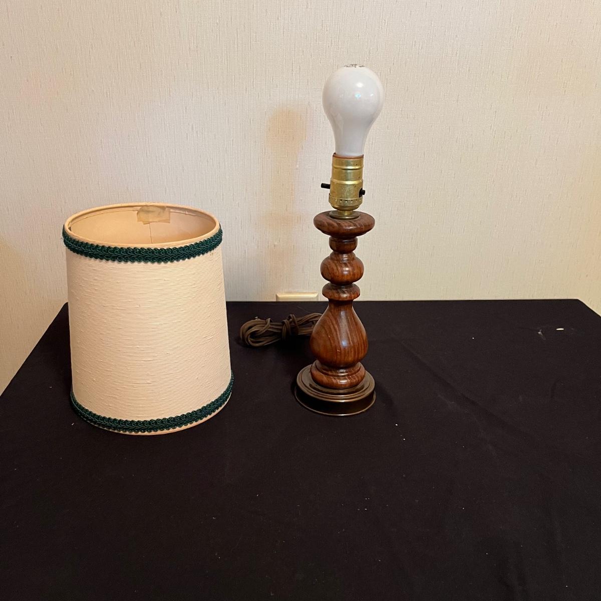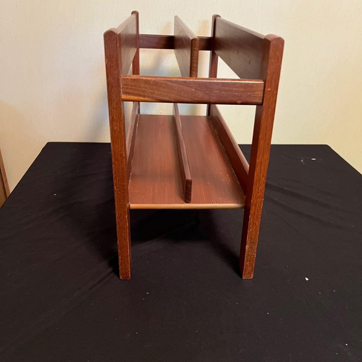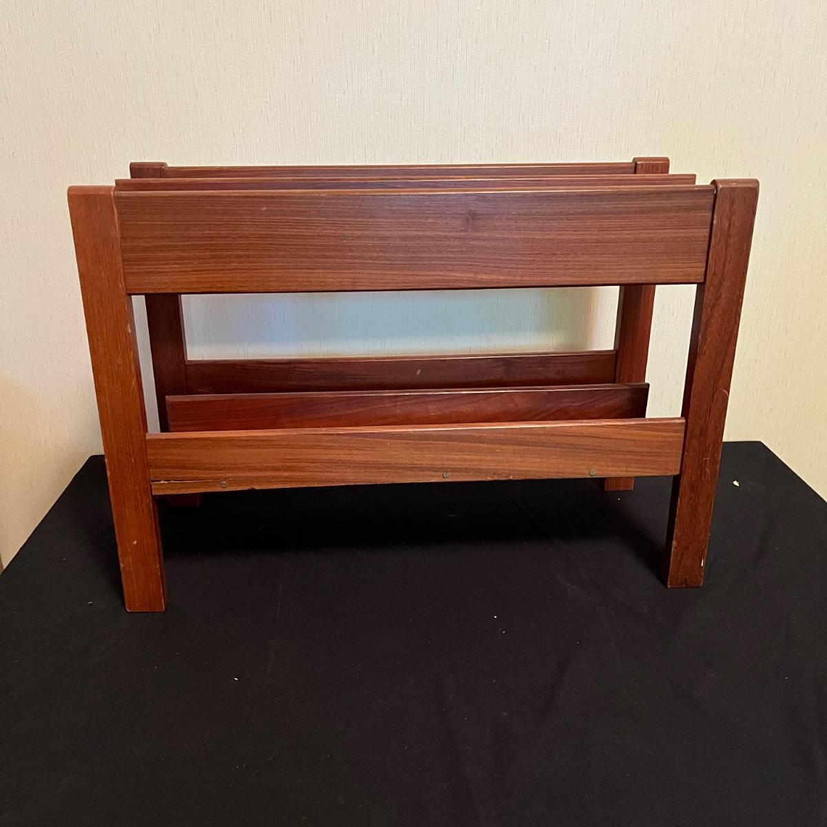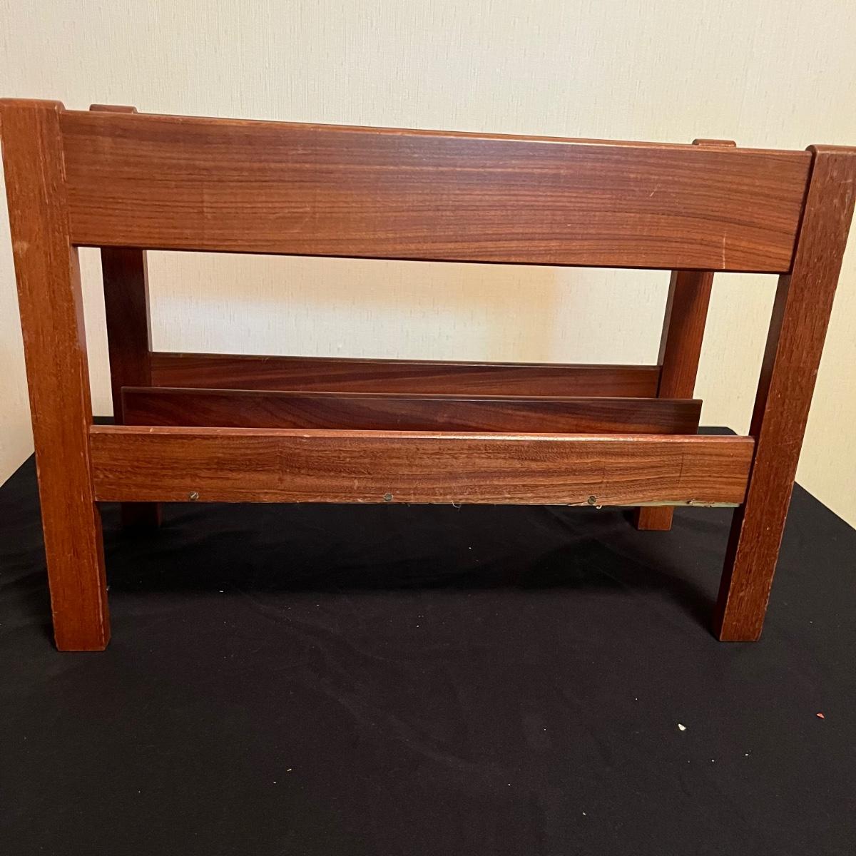 Lot includes a wooden magazine rack, wooden and metal table lamp and a cream colored Berber style area rug that measures 43” x 74”. Magazine rack measures 8” x 20” x 14”and also has a small split , see pictures.
