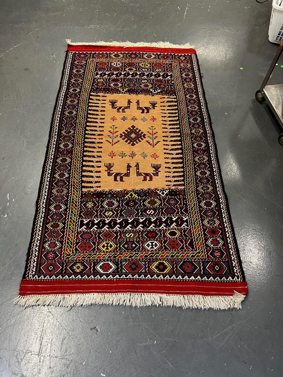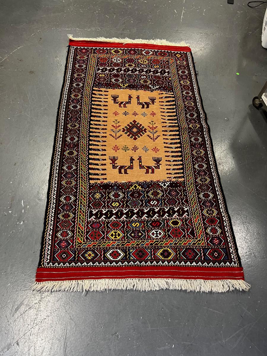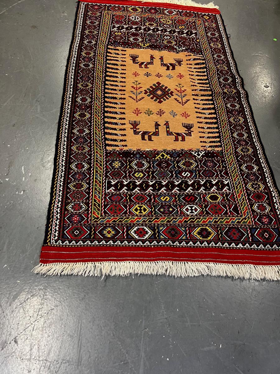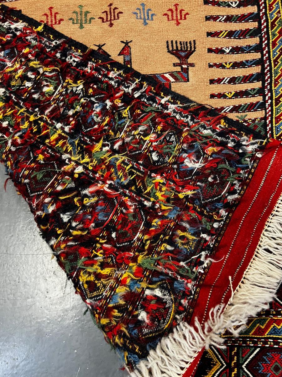 Measures 35 X 64 Woolen Fabric Hand knotted. COOL! North African? South American? NOT SURE ??