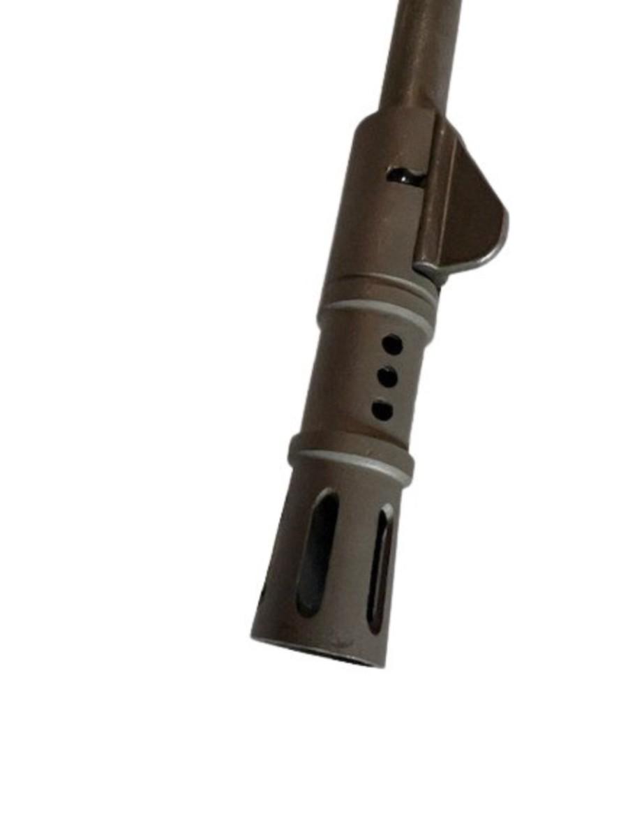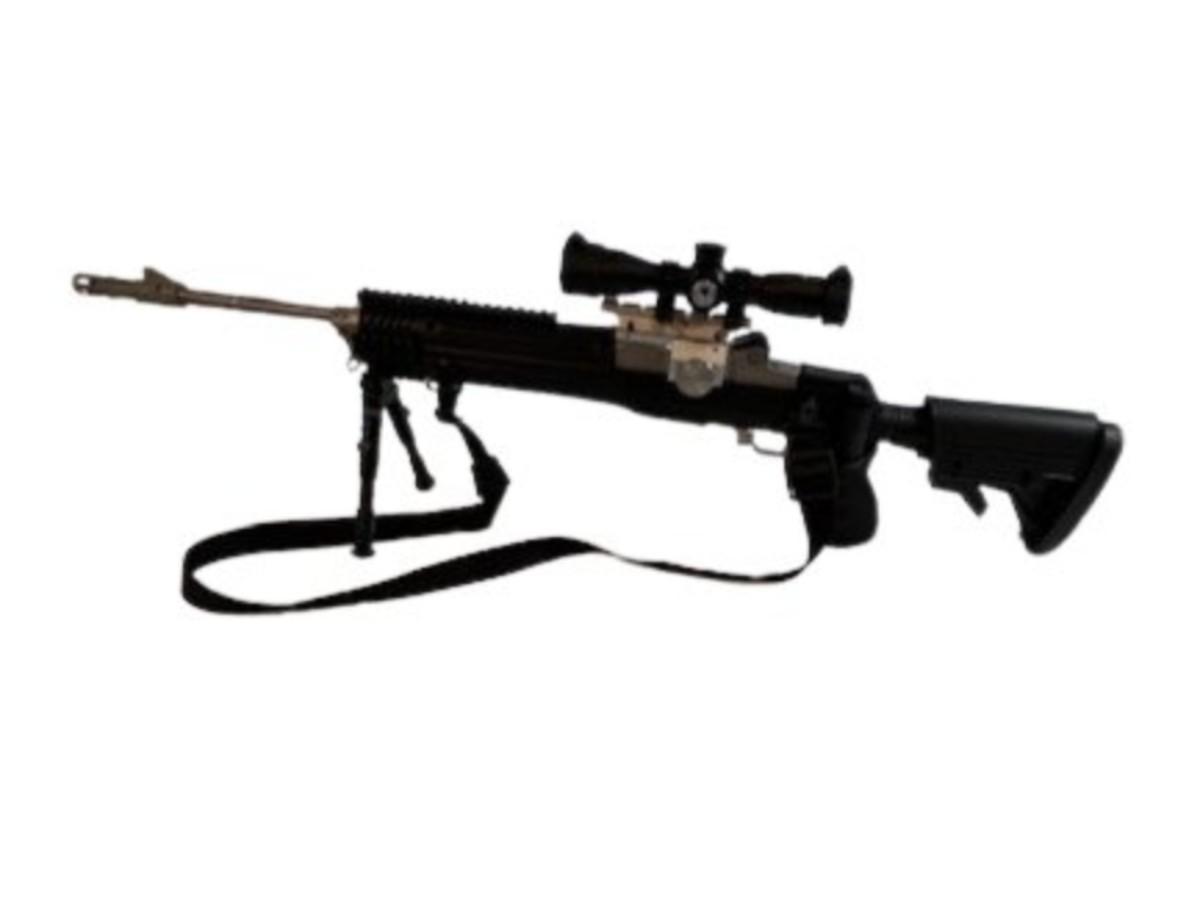 Chambered in .223. Has a detachable bipod, pistol grip, Barska optic, Weaver and Pic rails, two 20-round magazines, one 5-round magazine, and a flash suppressor. Includes original wood stock. Serial number 19673000. Not tested. [LF]