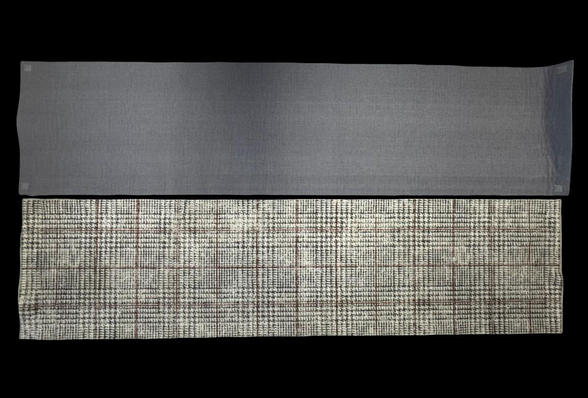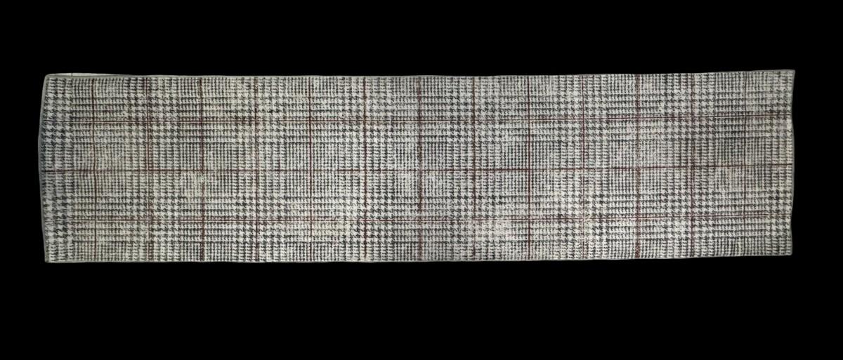 This is a two-piece washable rug system, comprised of a rug cover and rug pad. It has a built-in waterproof barrier. It is stain resistant, water resistant, and machine washable. Glen Plaid pattern. Age related wear. Measurement: 120”L x 30”W. [RS]
