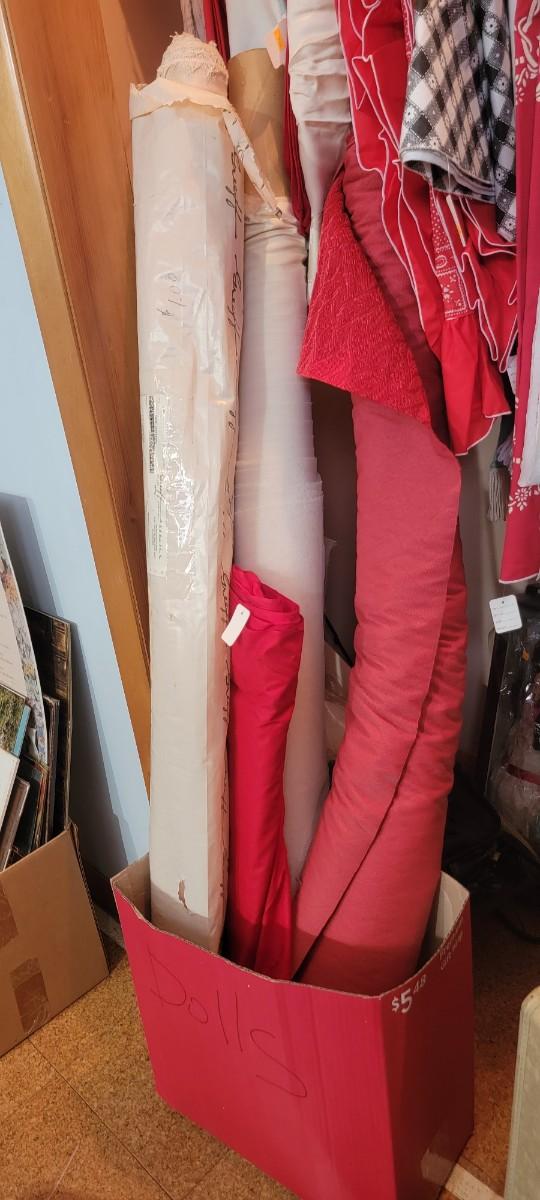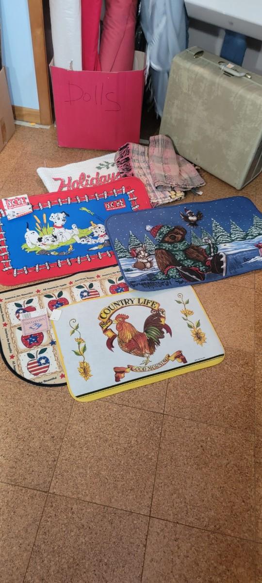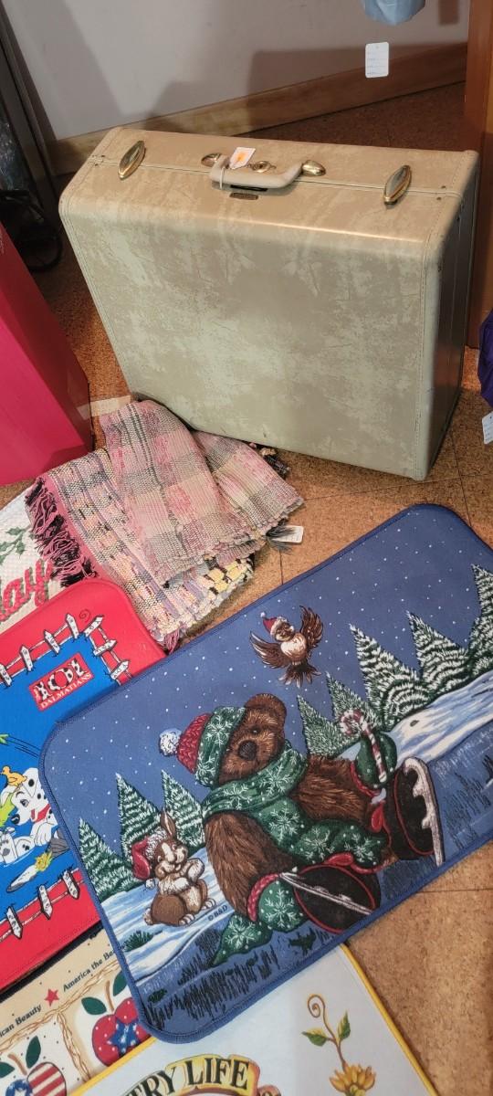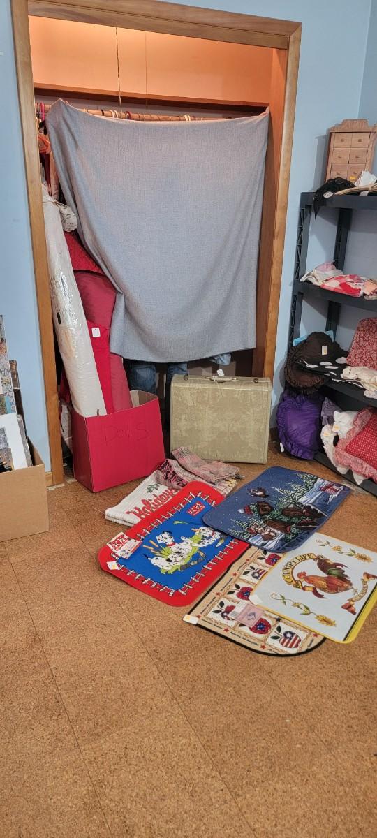 Fun floor rugs, vintage suitcase, fabric rolls. Does not include items on the shelf.