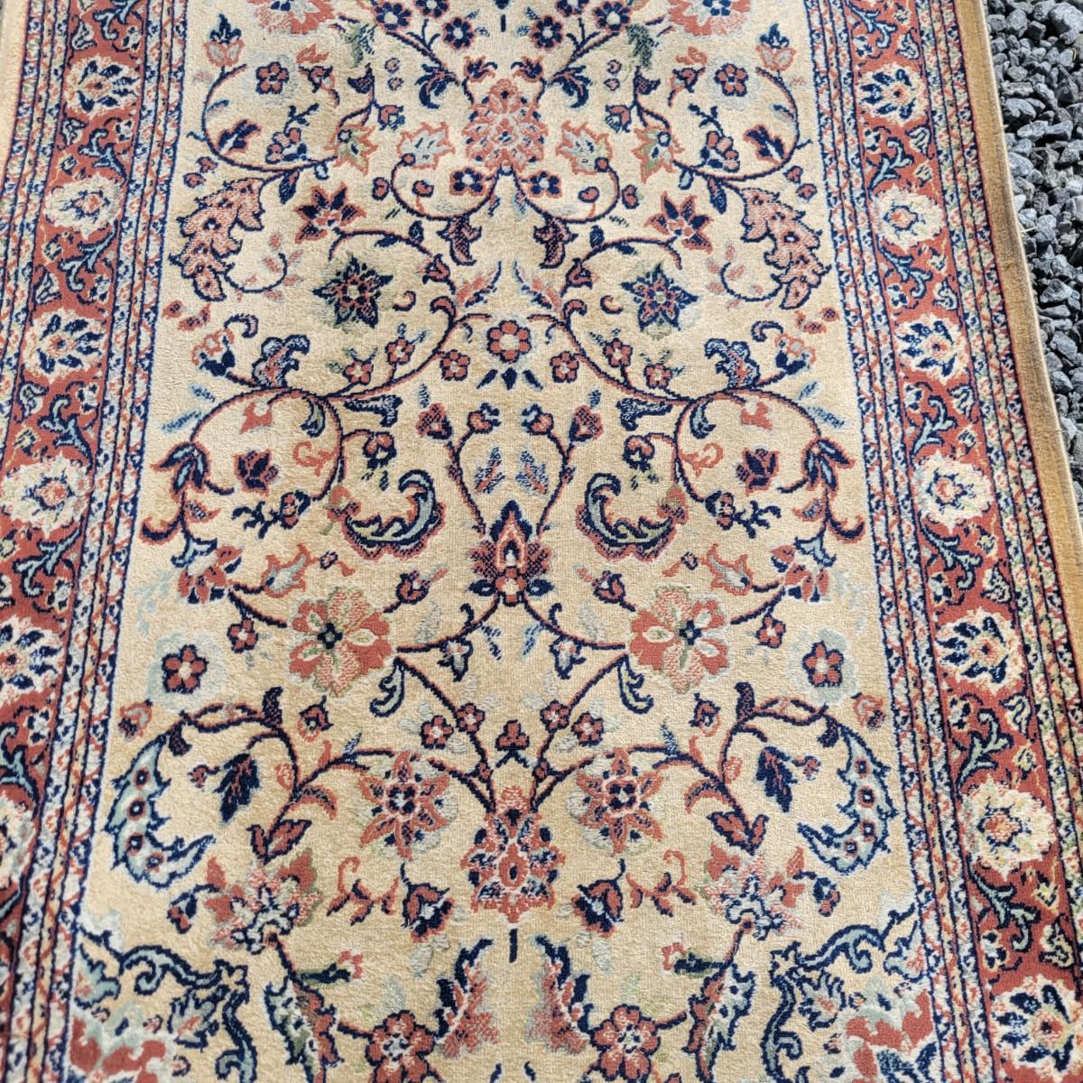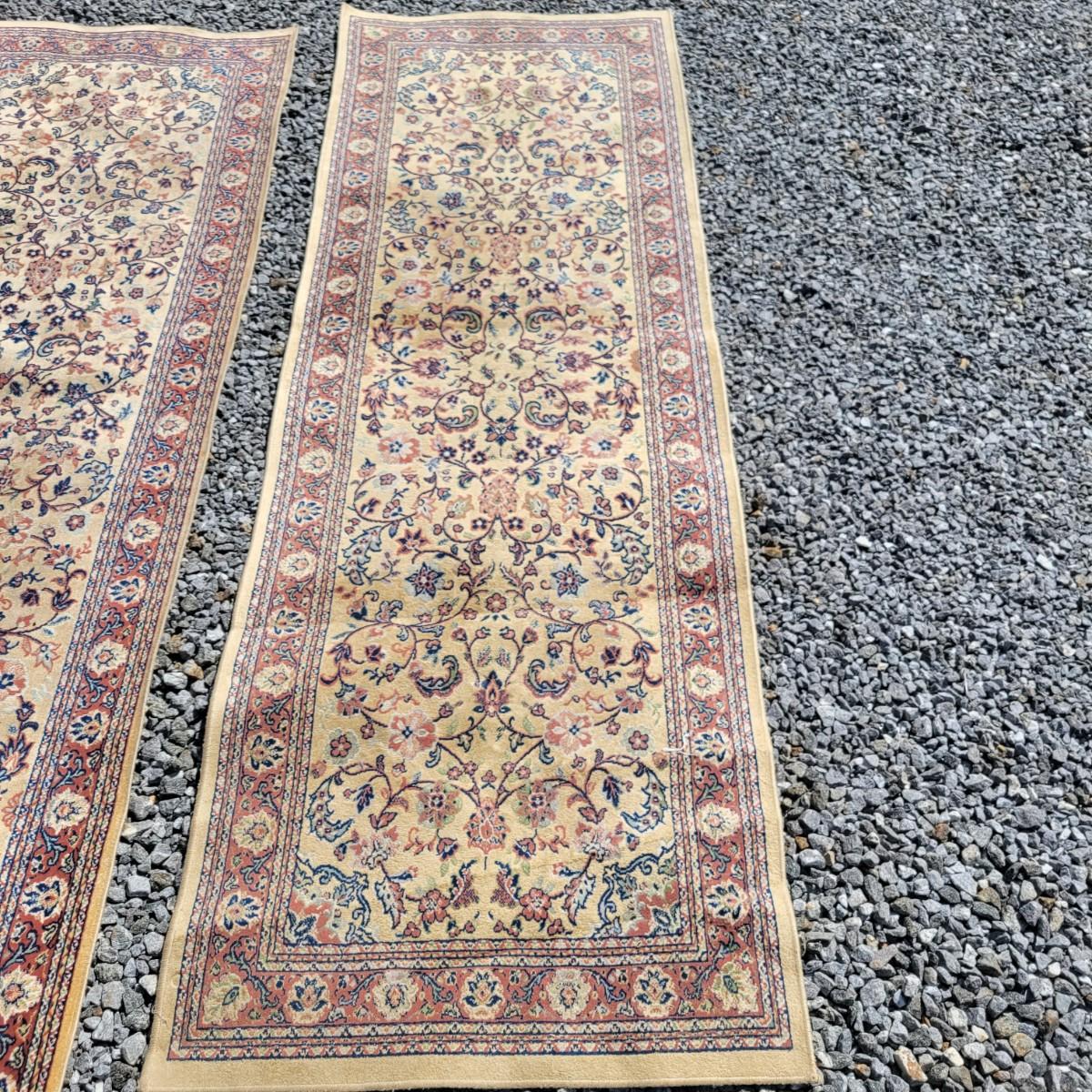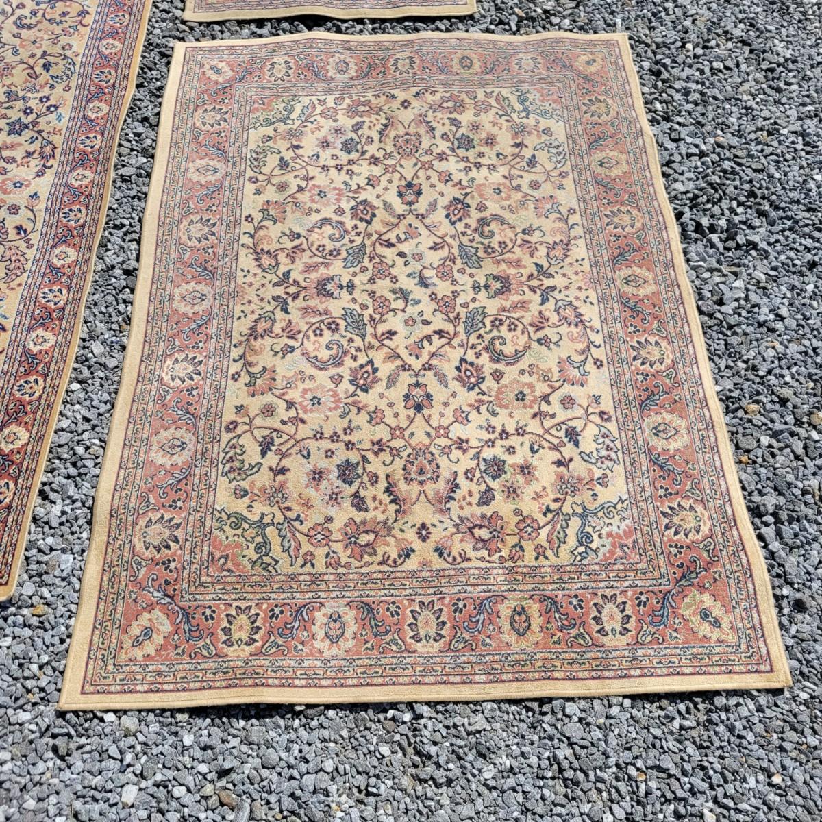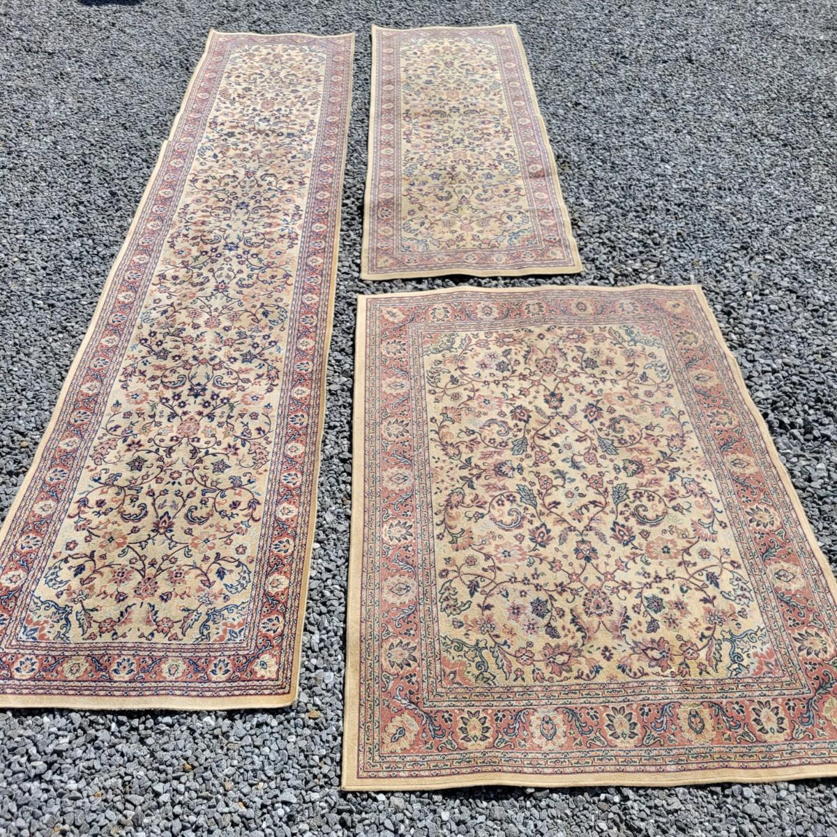 A set of three matching rugs that have a floral pattern on a cream background. Two of the rugs are runners, the largest measuring approximately 2'2" x 10'8". The throw rug measures approximately 3'3" x 4'7". The smaller runner and throw rugs are slightly faded compared to the largest runner. Local pickup only