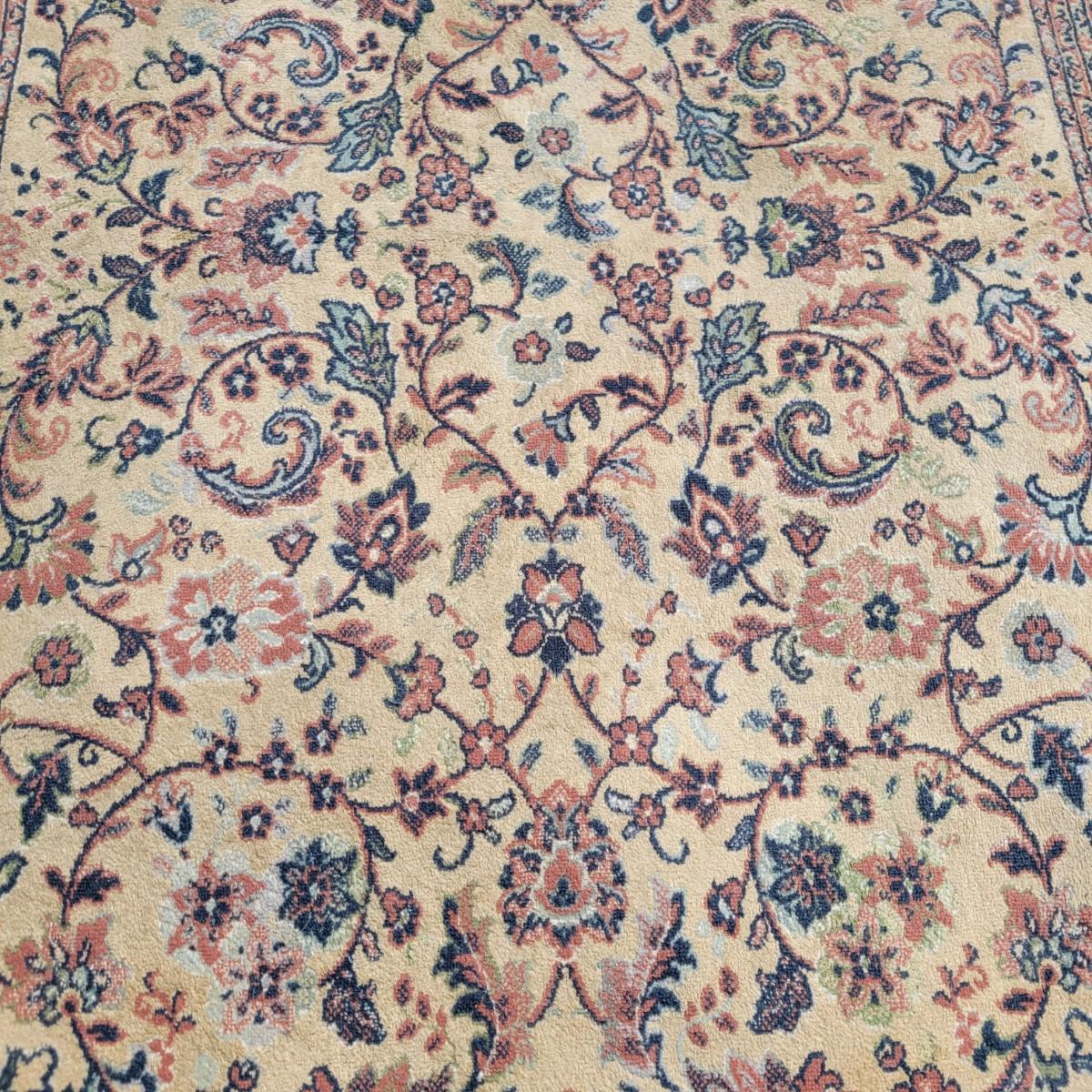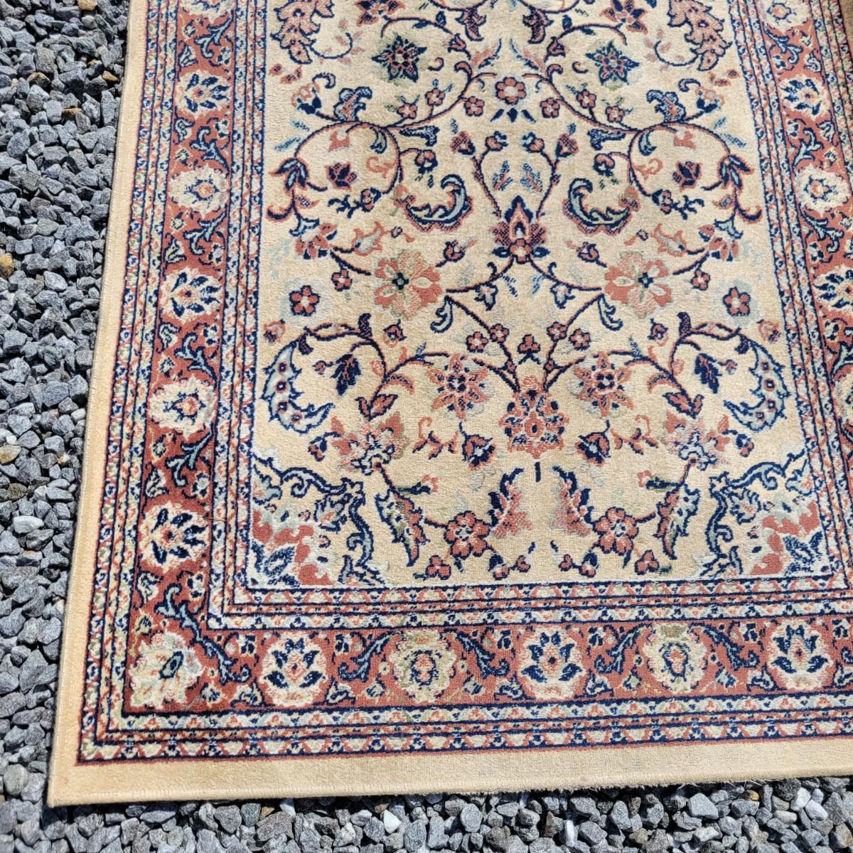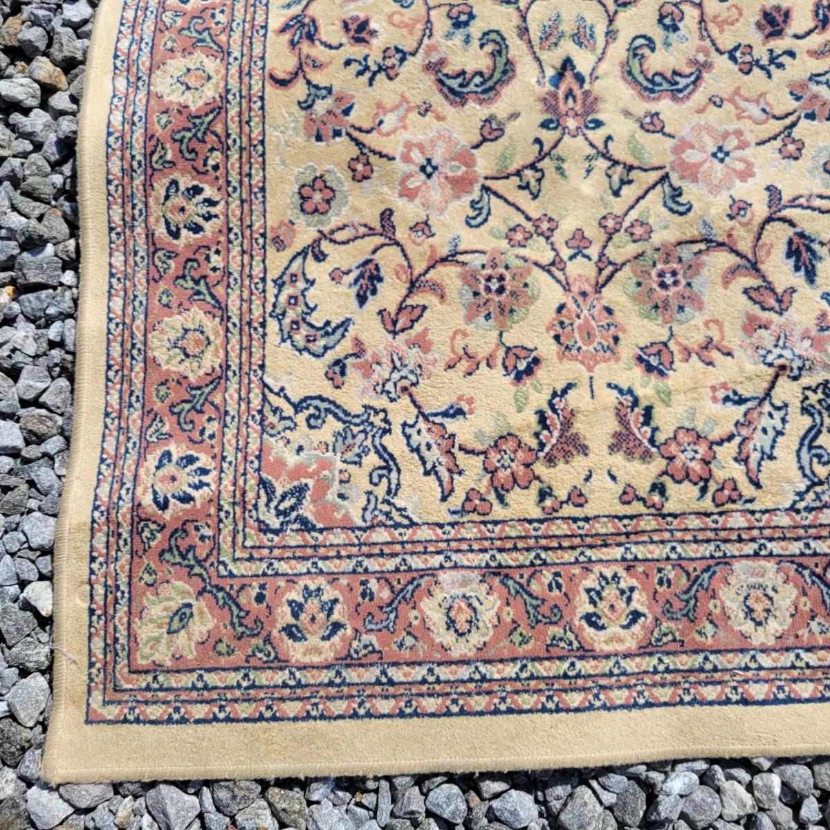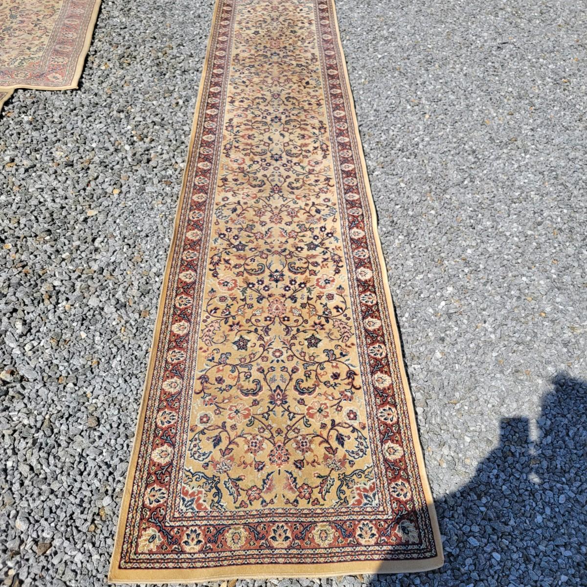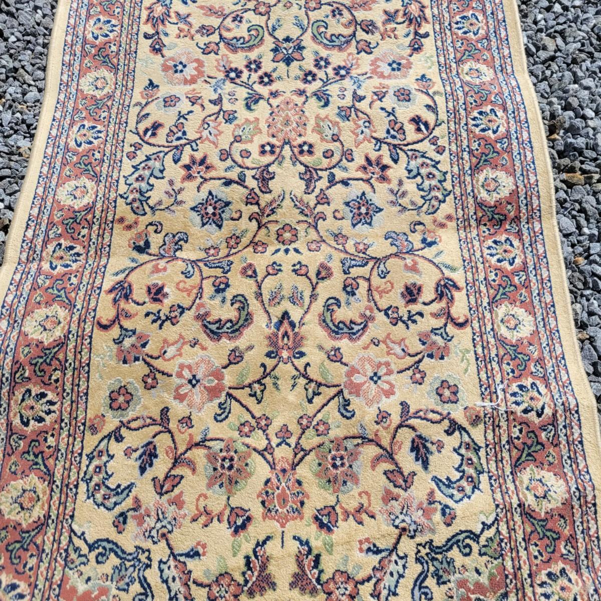 A set of three matching rugs that have a floral pattern on a cream background. Two of the rugs are runners, the largest measuring approximately 2'2" x 10'8". The throw rug measures approximately 3'3" x 4'7". The smaller runner and throw rugs are slightly faded compared to the largest runner. Local pickup only