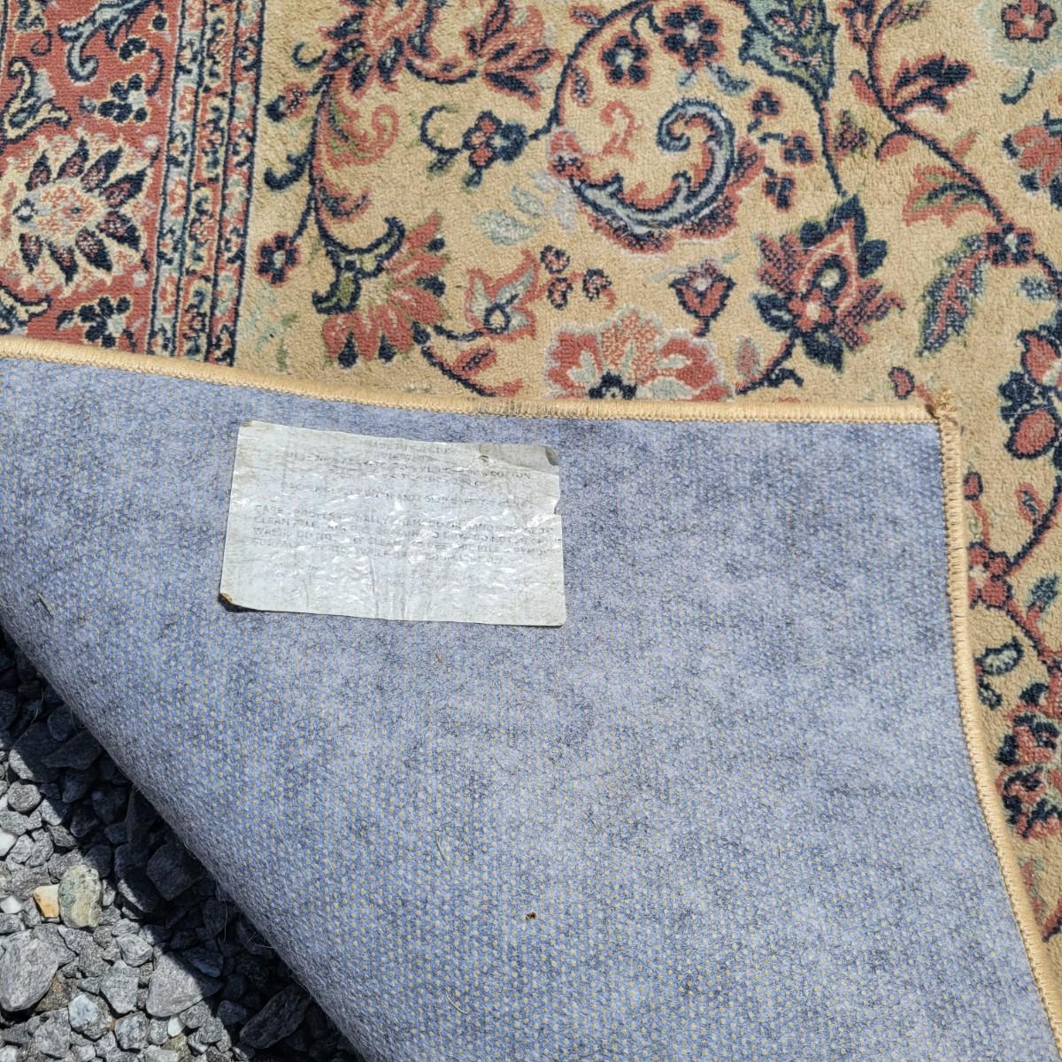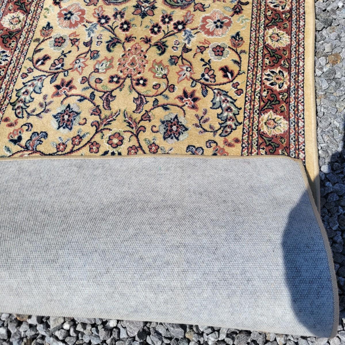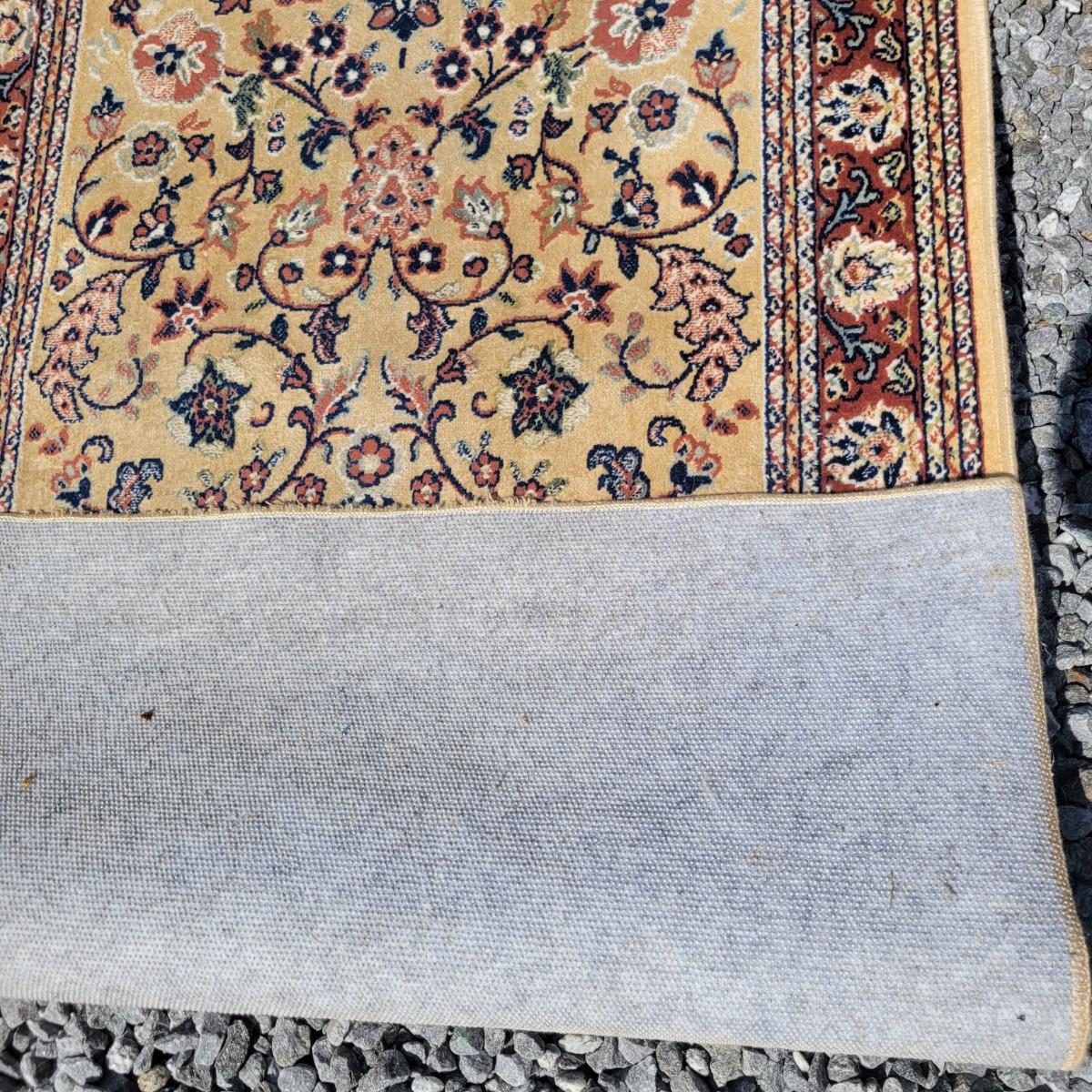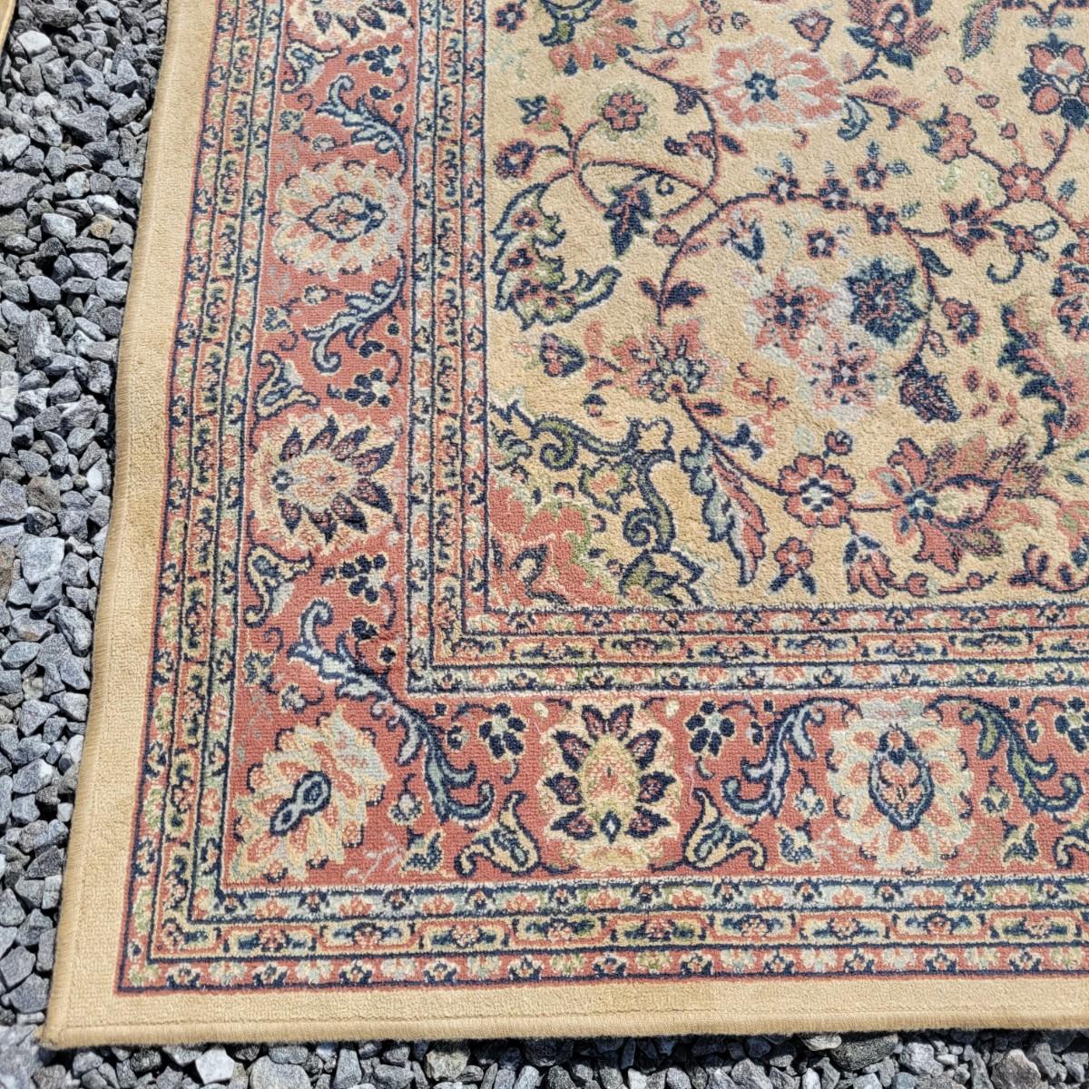 A set of three matching rugs that have a floral pattern on a cream background. Two of the rugs are runners, the largest measuring approximately 2'2" x 10'8". The throw rug measures approximately 3'3" x 4'7". The smaller runner and throw rugs are slightly faded compared to the largest runner. Local pickup only