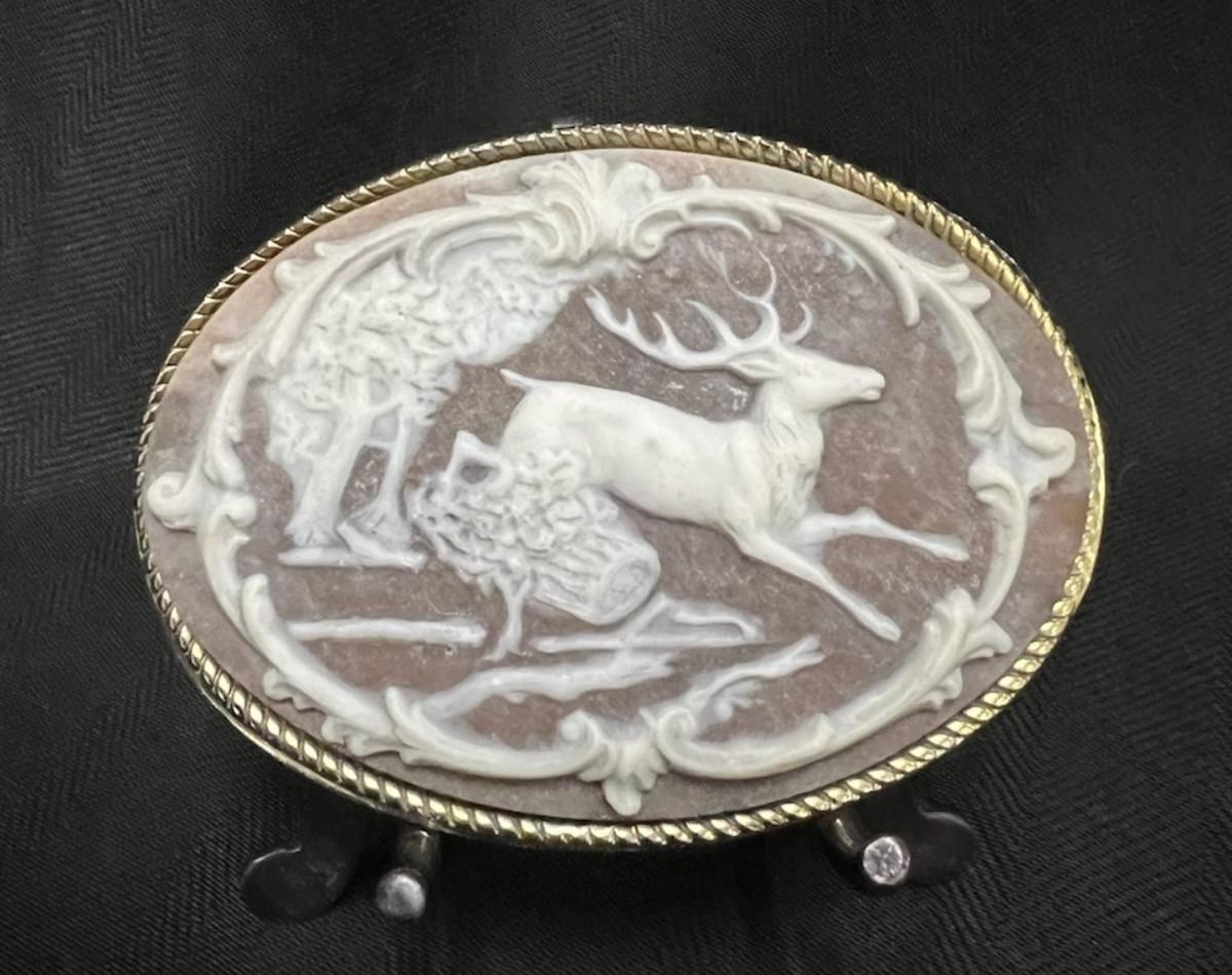 Grayiish brown running stag, good condition. 2.75 inches by 3.75 inches.