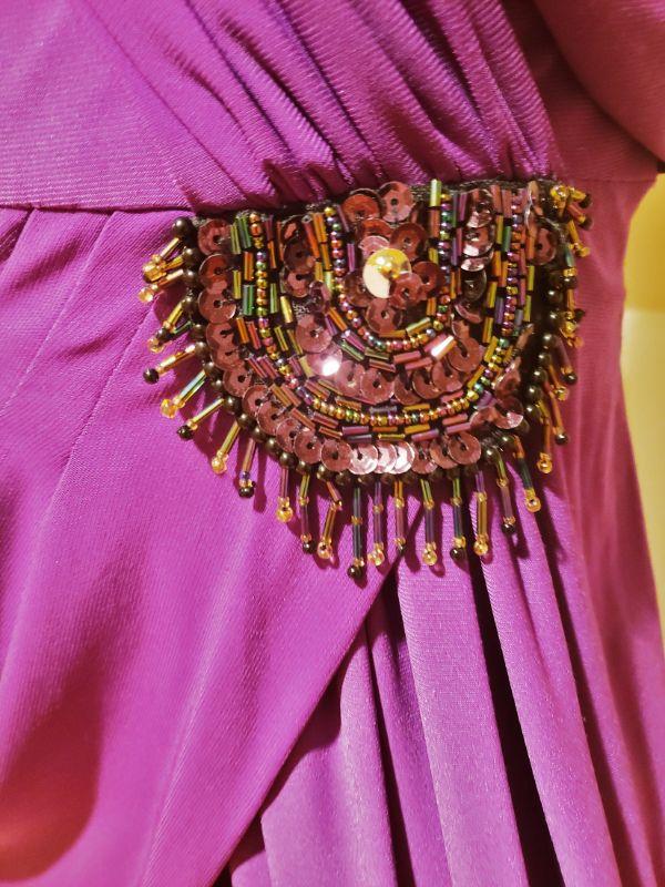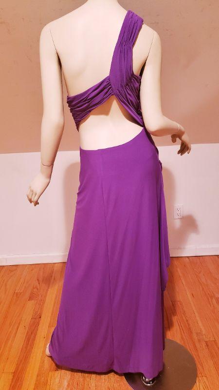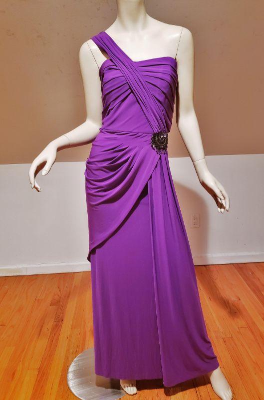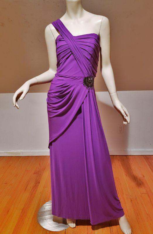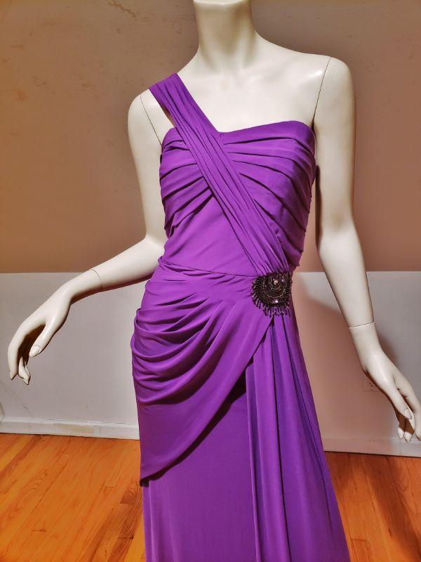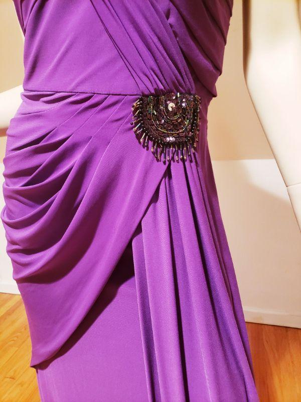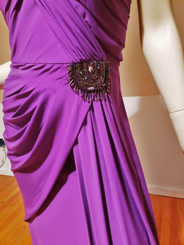 A Stunner , Runway Gown in True Purple with Embellishments to one side drapes.