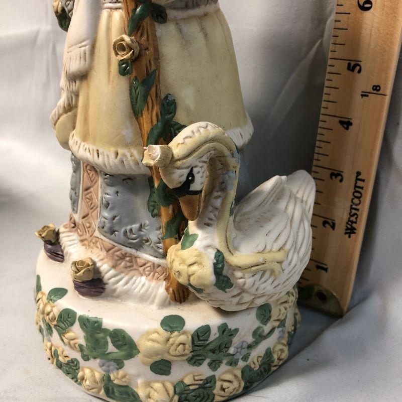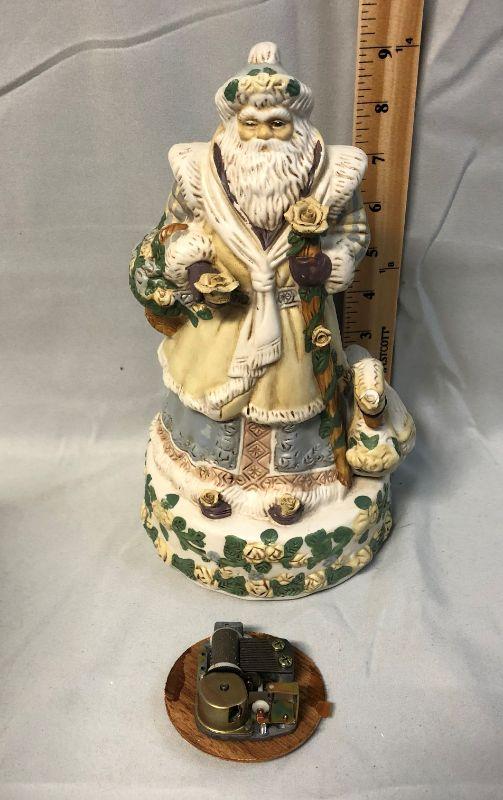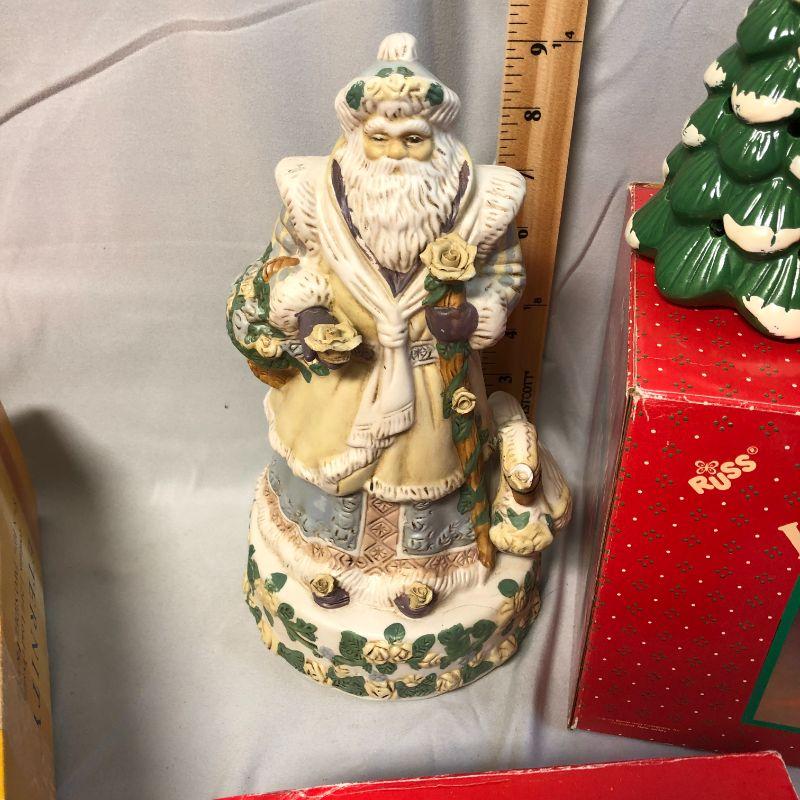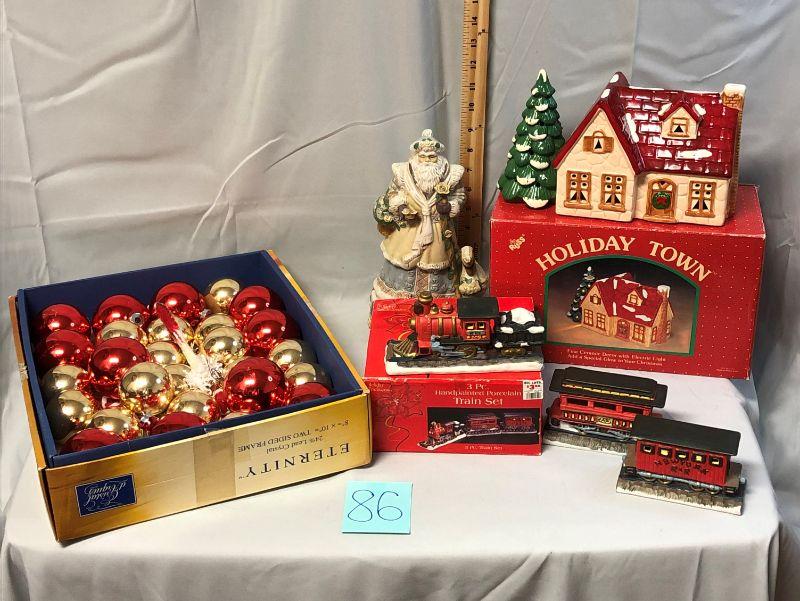 The Russ Holiday Town House is in excellent condition, but does need the light. The Santa musical figurine has a chipped crown on the swan and the music box mechanism works, but is not attached. The glass ornaments are in excellent condition.