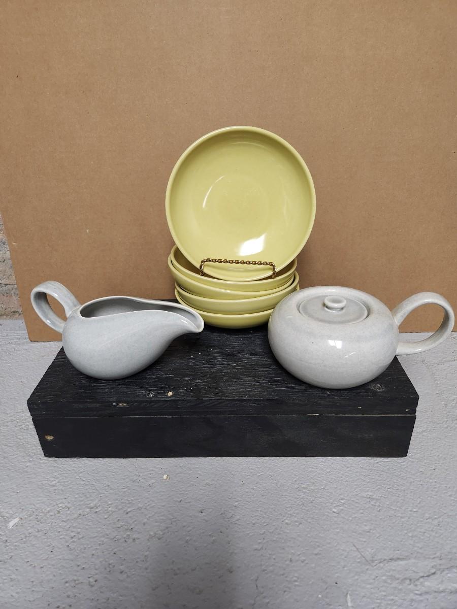 5 Iroquois berry bowls in chartreuse and a cream and sugar set in grey. Neat lot.