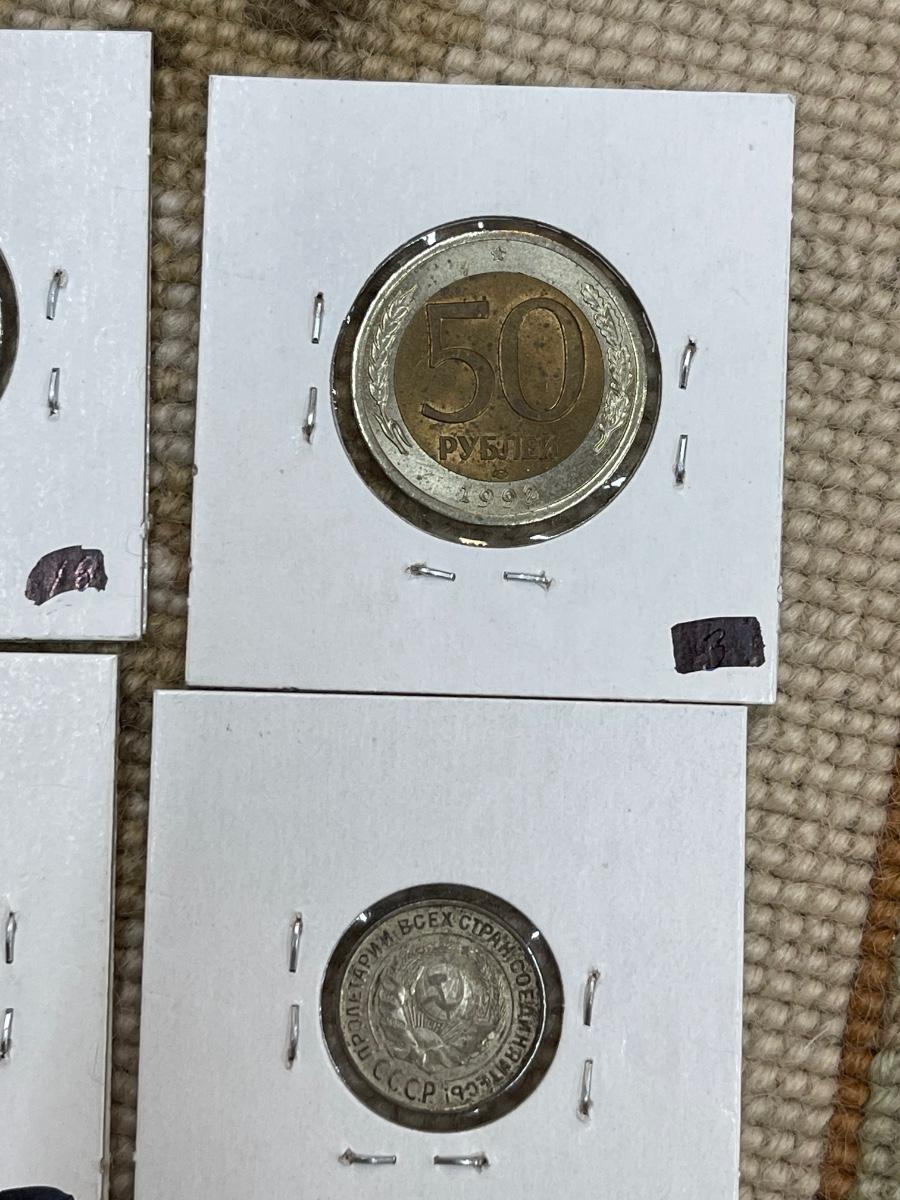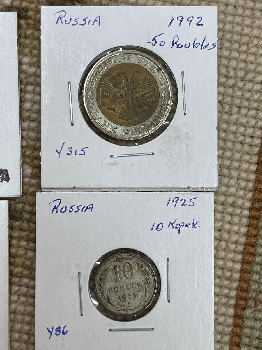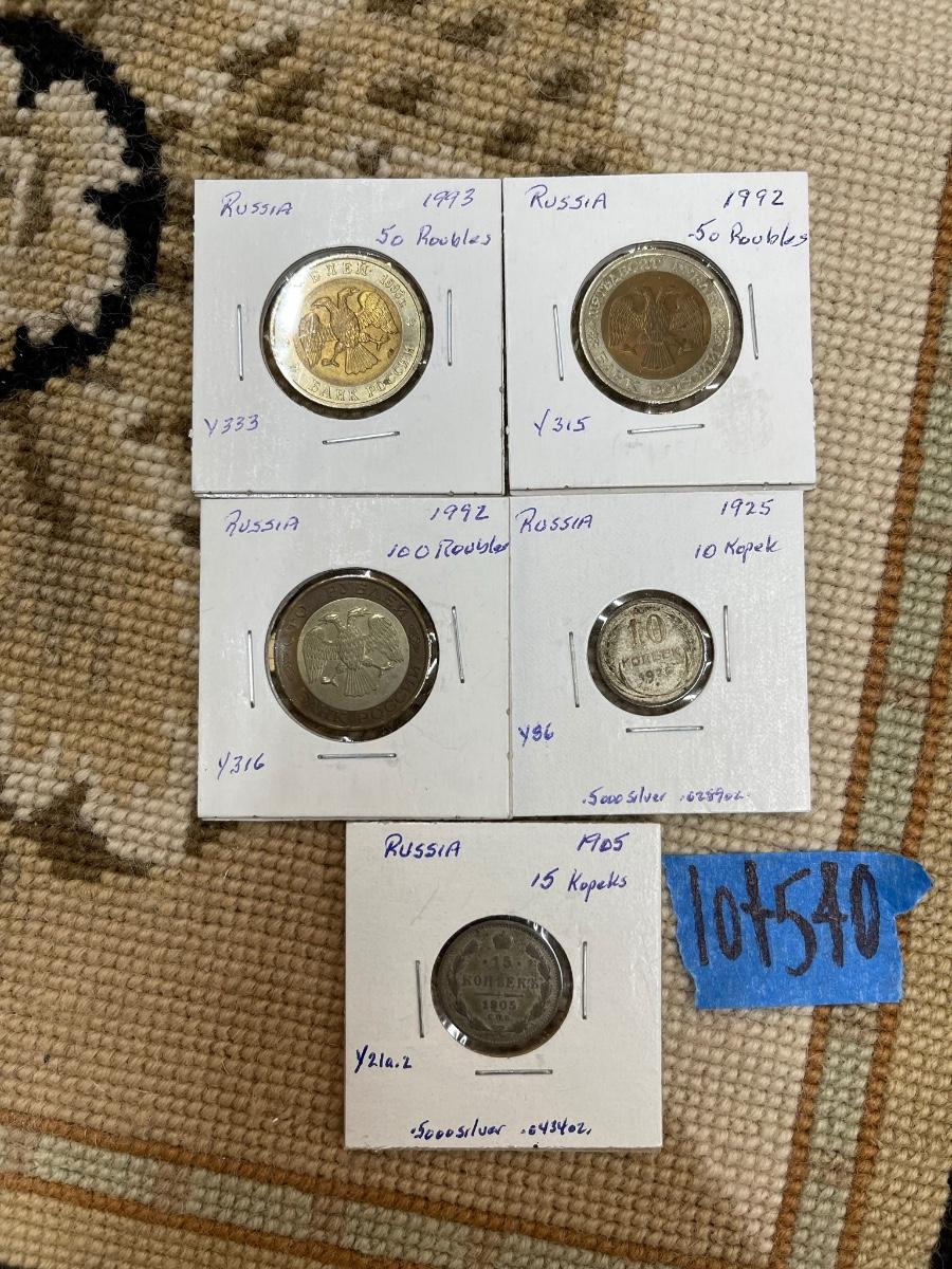 (5) vintage Russian coins - 1993 50 roubles, 1992 50 roubles, 1992 100 roubles, 1925 10 kopek, 1905 15 kopeks.