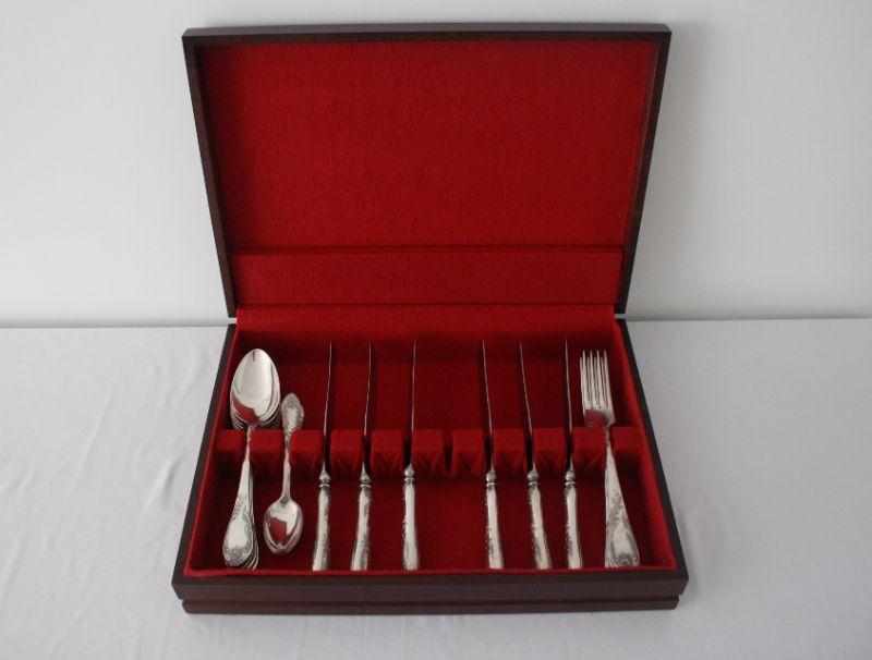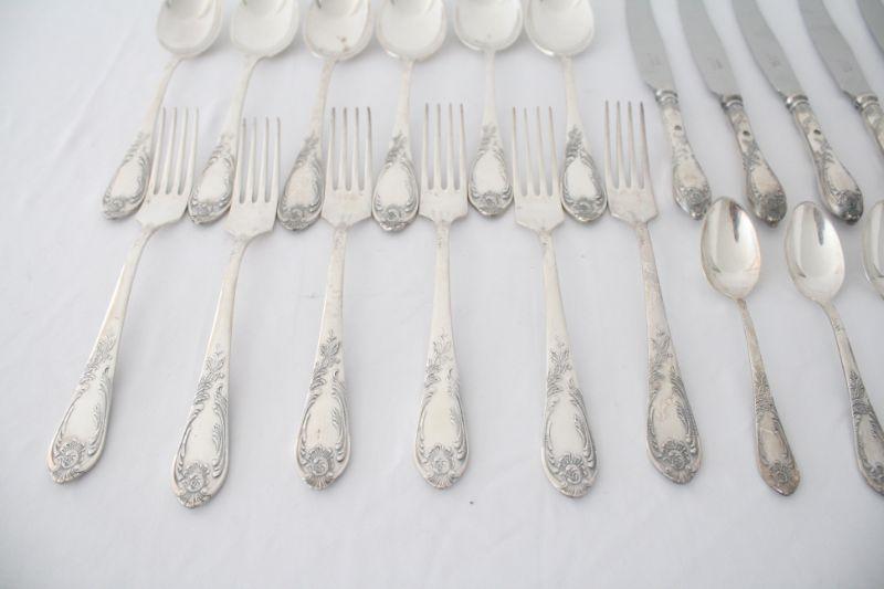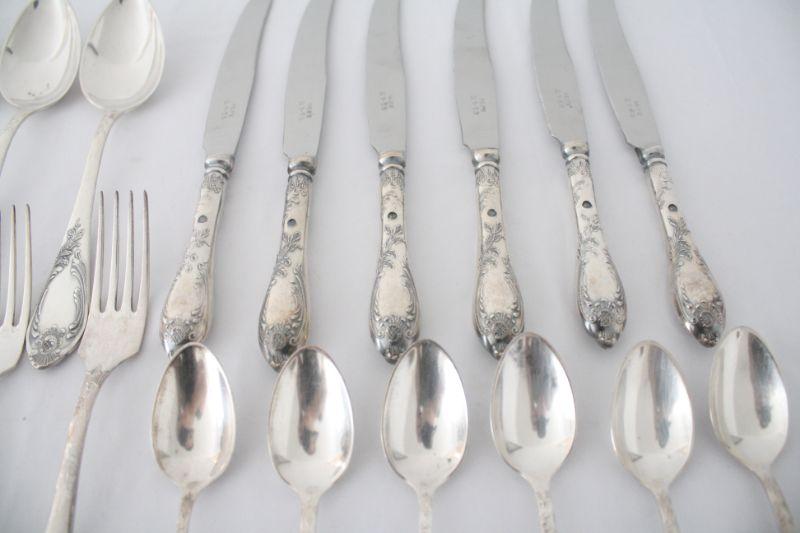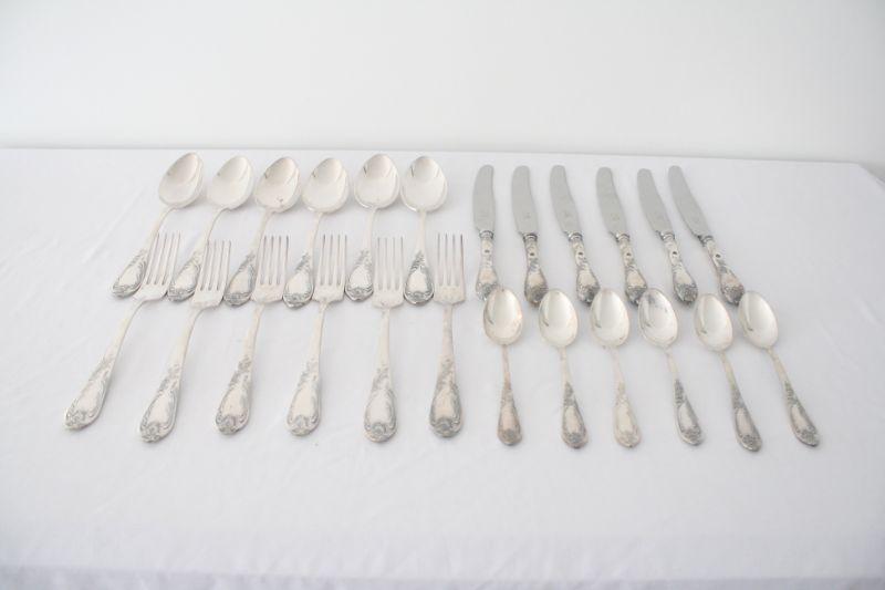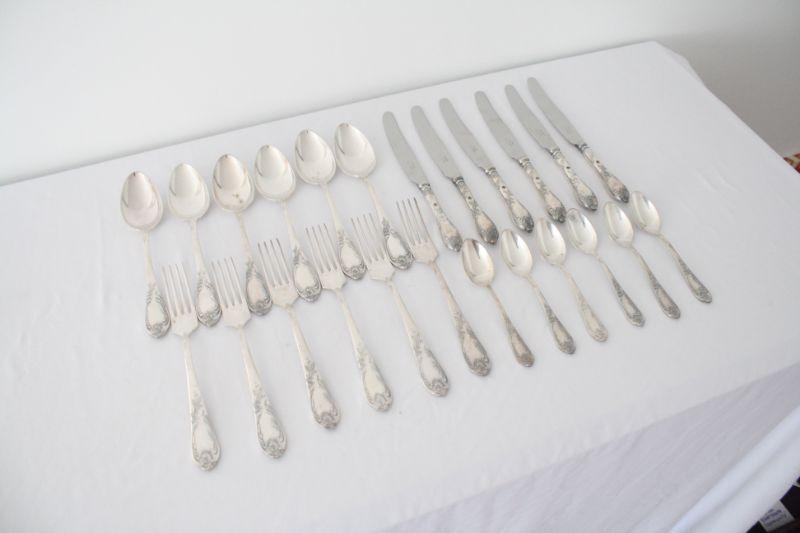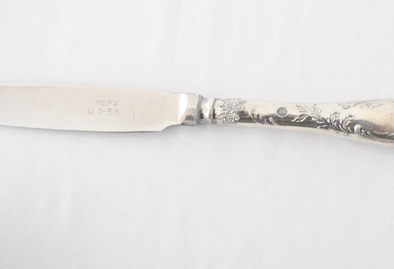 Soviet Russia Flatware - The cutlery is was made in Soviet Russia manufactured in the "Shevchenko Factory" located in Volnyansk, Zaporizhzhya region. Pieces are made of nickel silver and knife blades are stainless steel (marked НЕРЖ). The set includes 6 knives, 6 forks, 6 large spoons, and 6 tea spoons.
