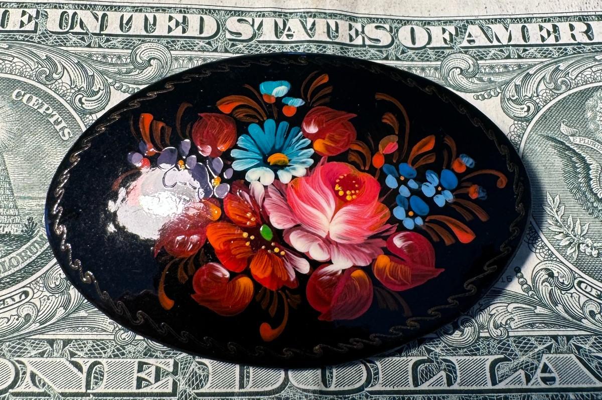 Vintage Russian Hand-Painted Lacquer Brooch, likely made of papier-mâché or wood, and covered with black lacquer featuring a detailed floral design.