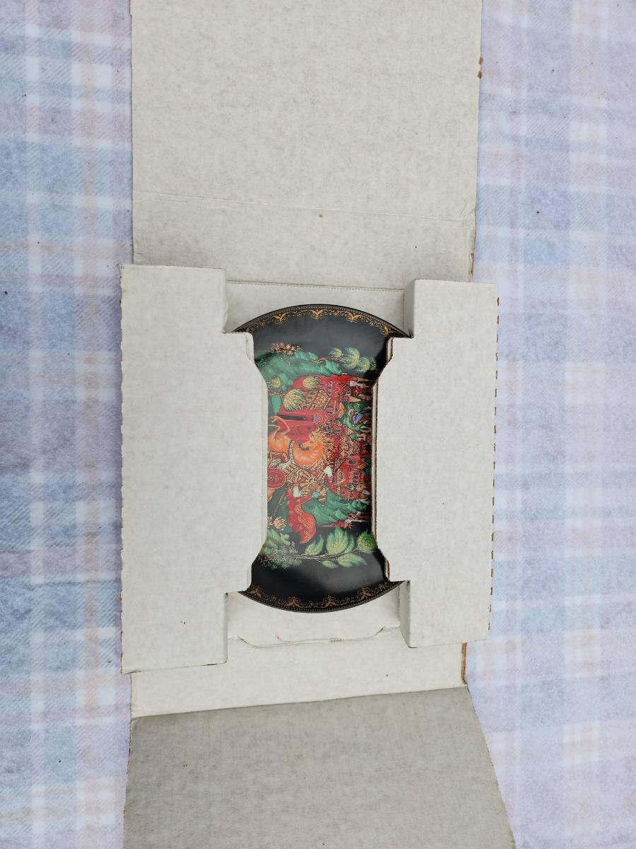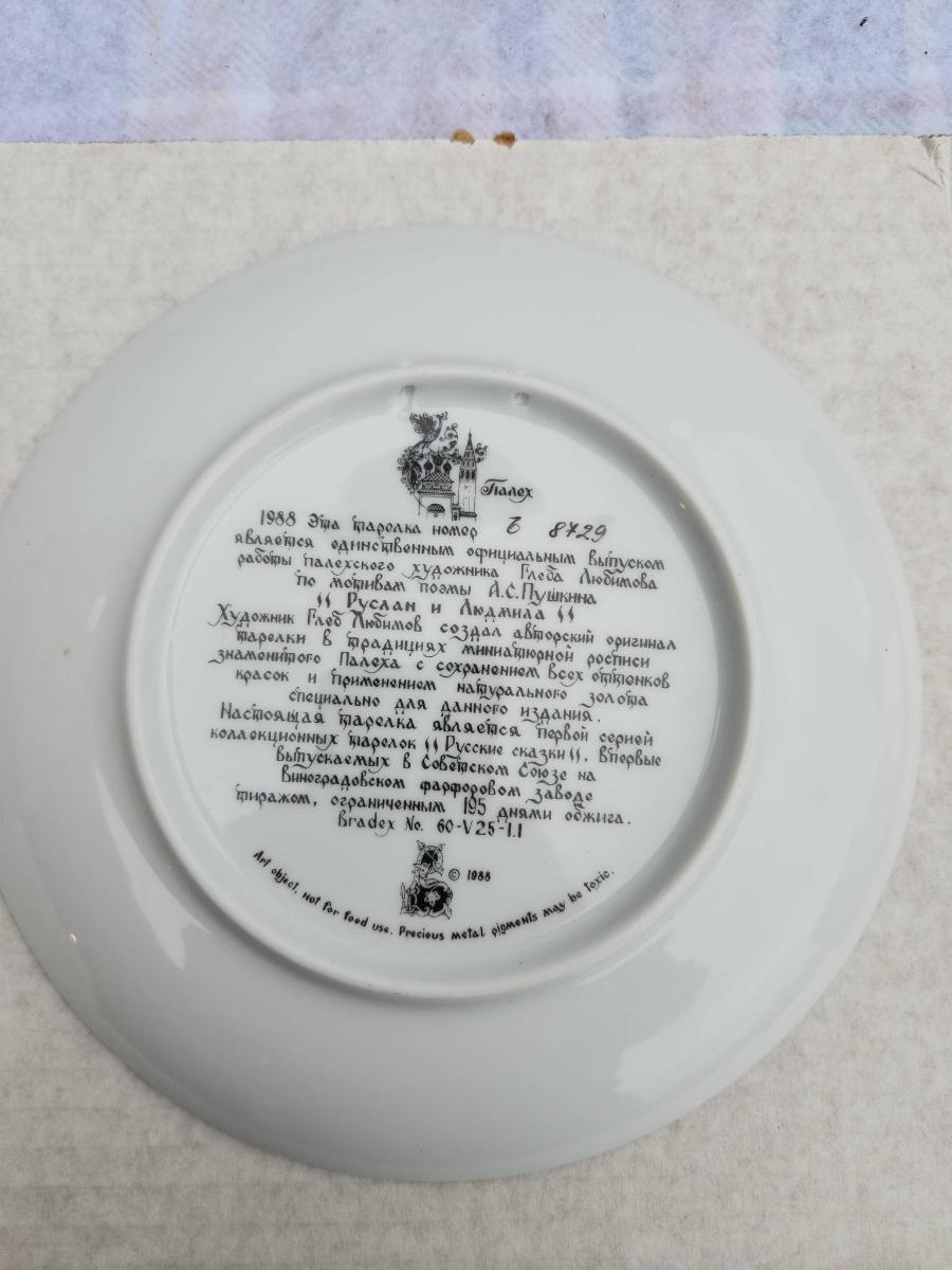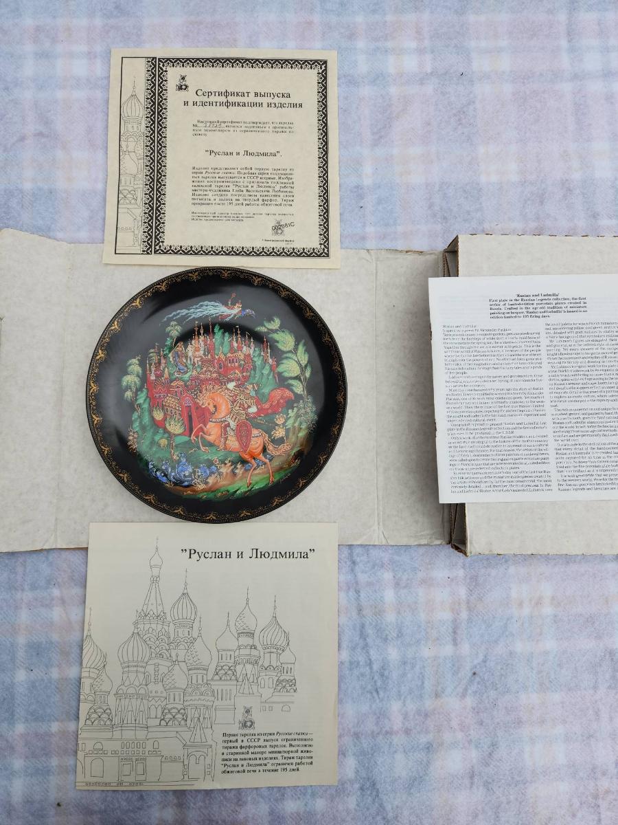 Russian hand-painted lacquerware plate featuring a vibrant fairy tale scene with a horse and castle motif. The reverse side includes inscriptions in Cyrillic detailing the plate's origins and theme. Accompanied by documentation, illustrations, and original packaging. The detailed craftsmanship and intact condition suggest careful preservation, with no visible damage or wear.