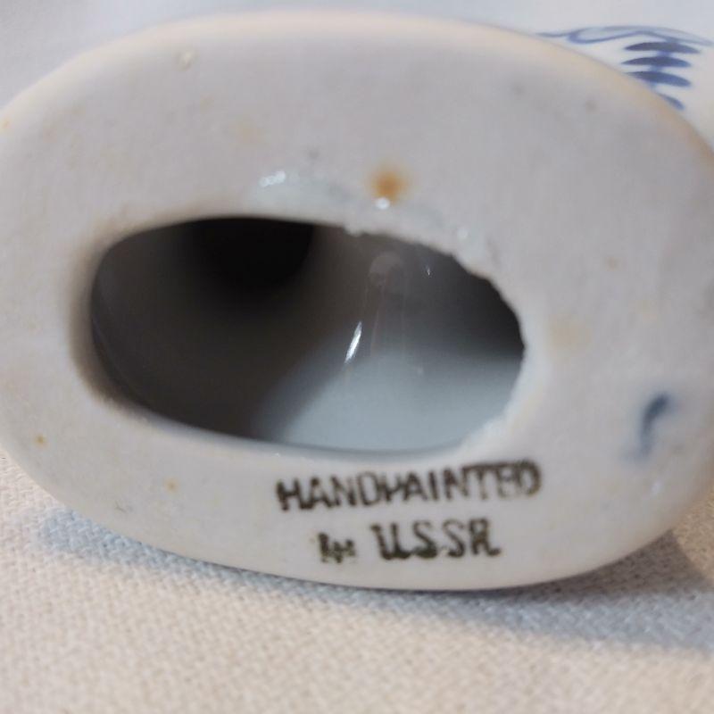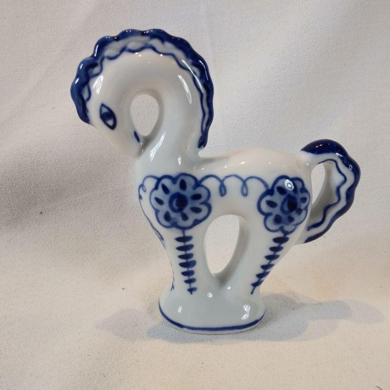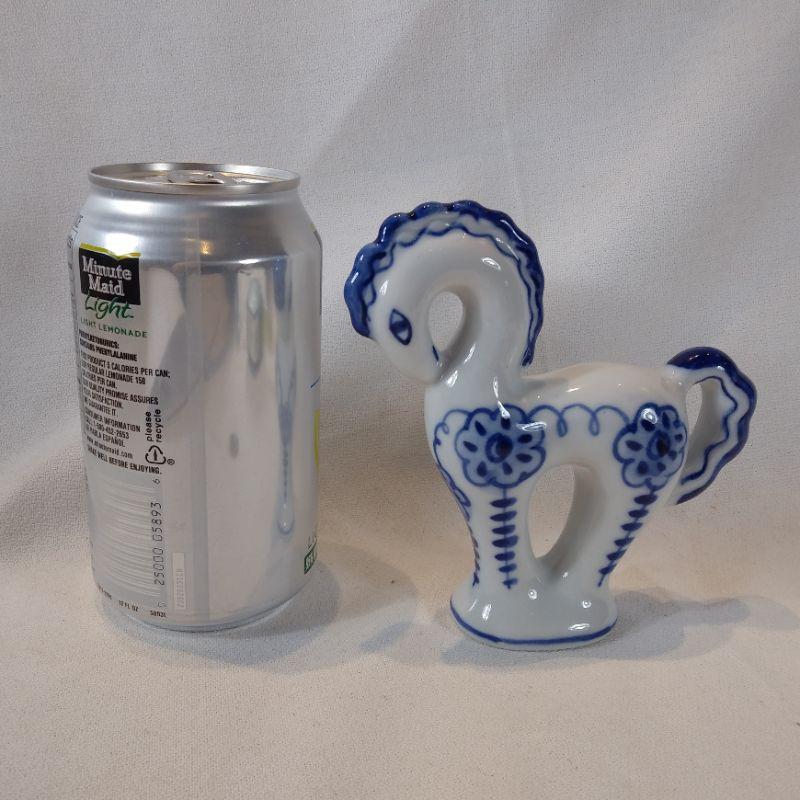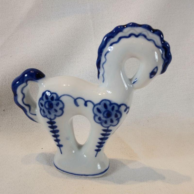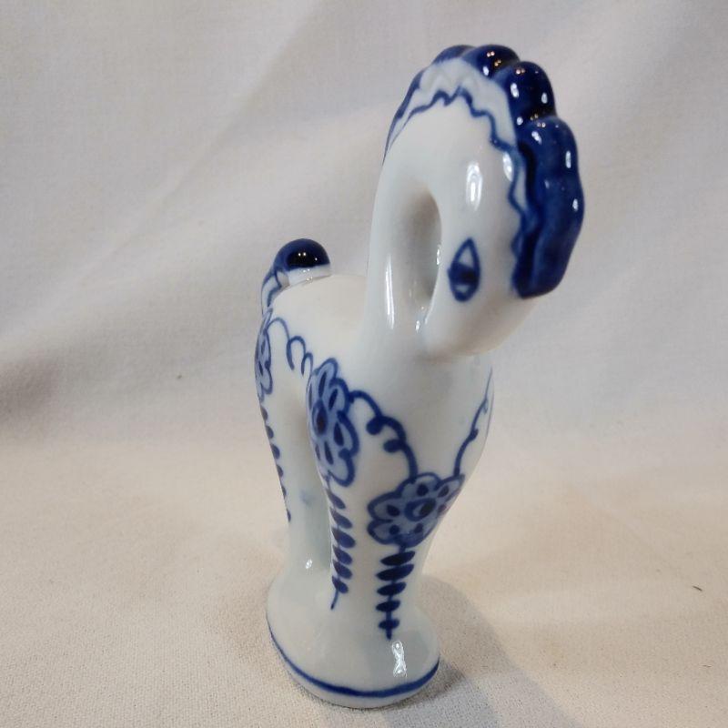 This pretty little filly is a hand-painted, stylized horse made in USSR. It is blue and white china and stands 4 3/4-inches tall X 5-inches long. She makes us smile, In very good condition - no chips or cracks.