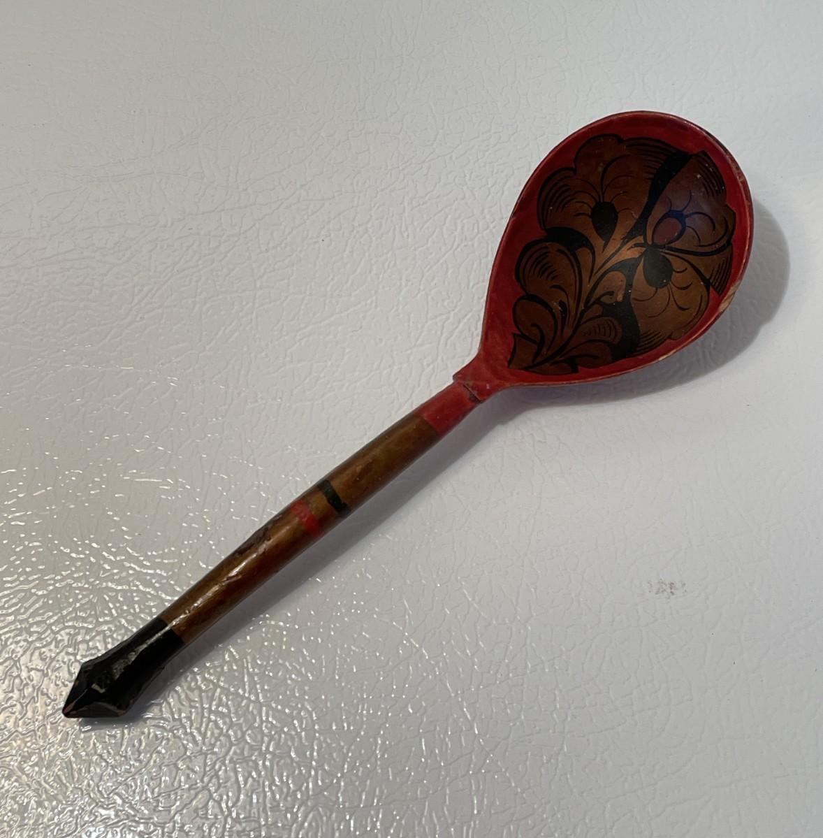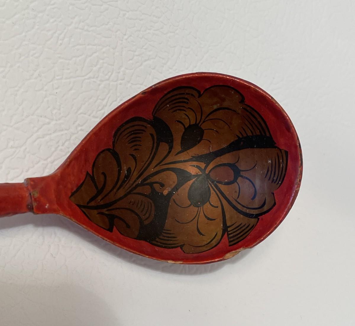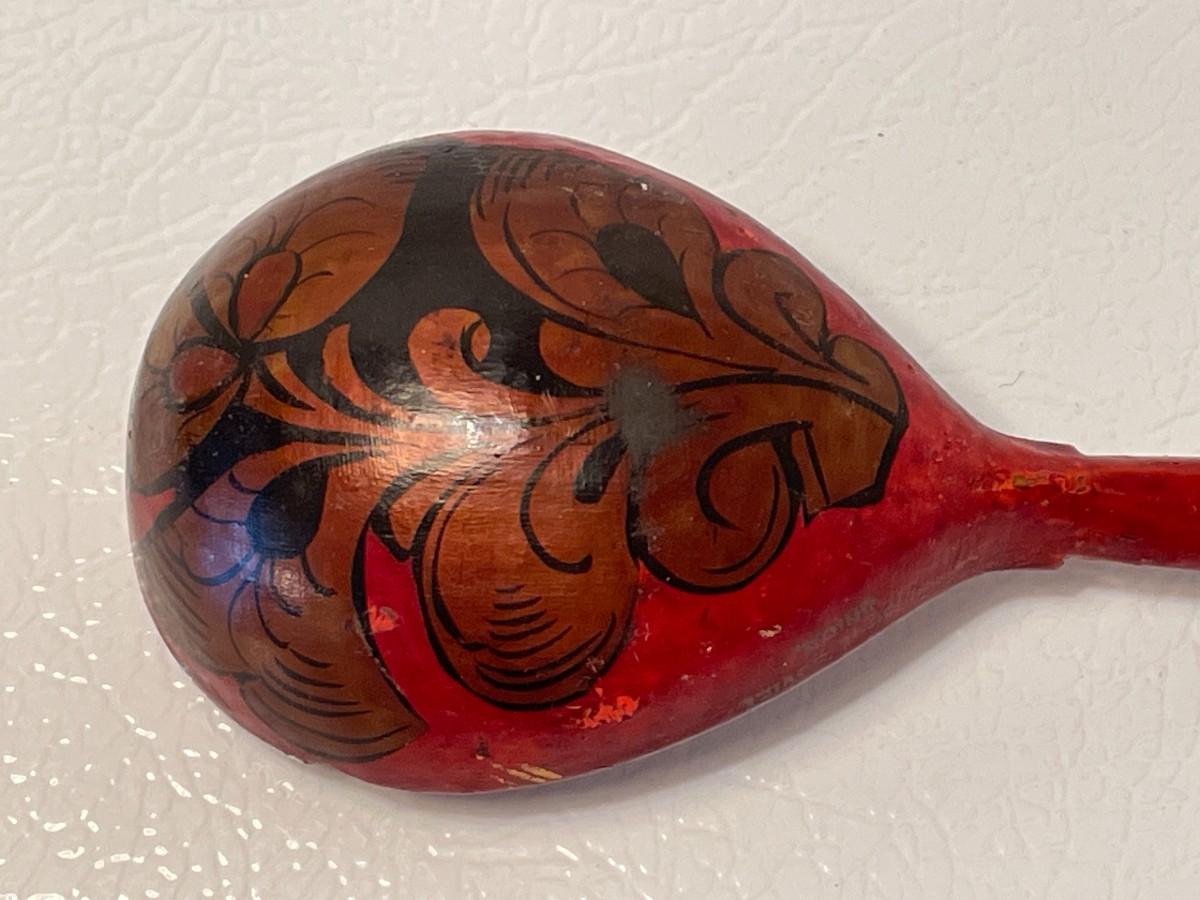 This spoon is about 7.75 inches in length and has been hand painted. There is a small chip on one edge of the spoon, otherwise it is in great vintage condition.