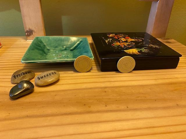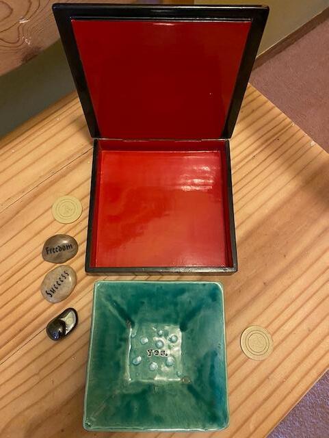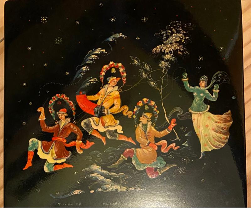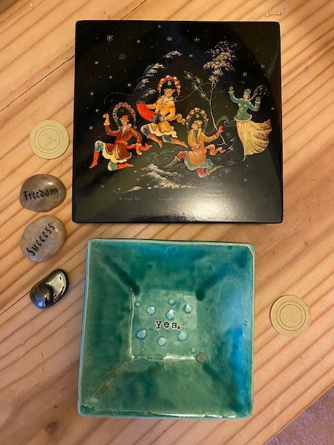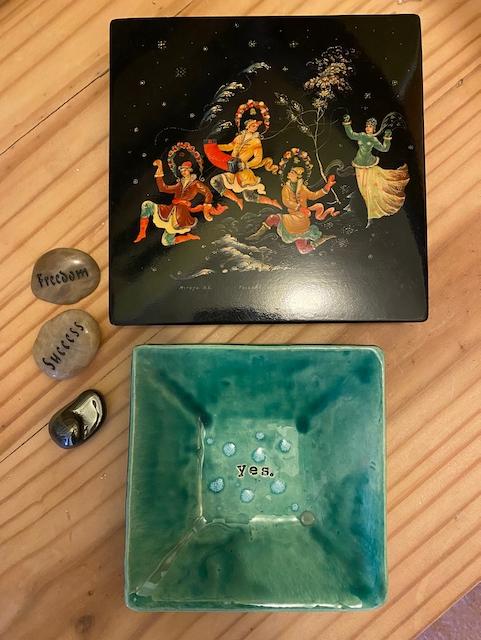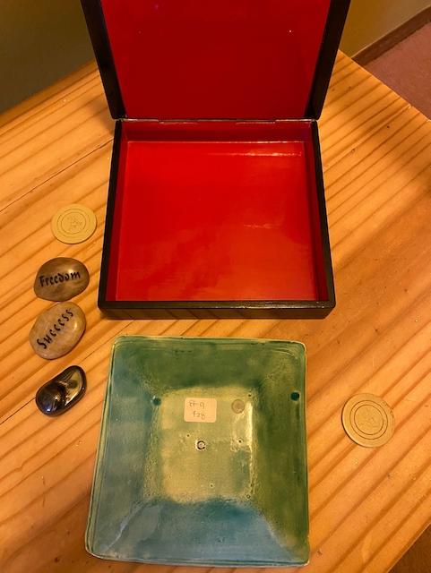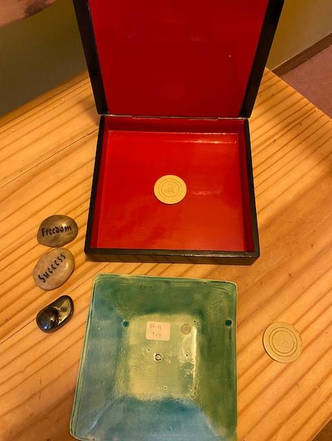 Russian lacquer box, pottery dish and stones - box is Mctepa - poker chips are shown for size reference, not included