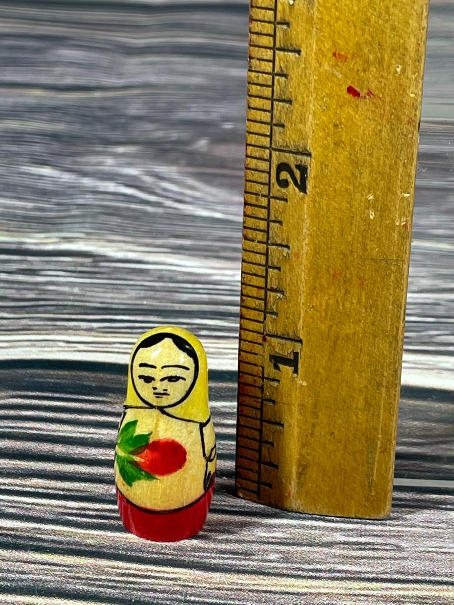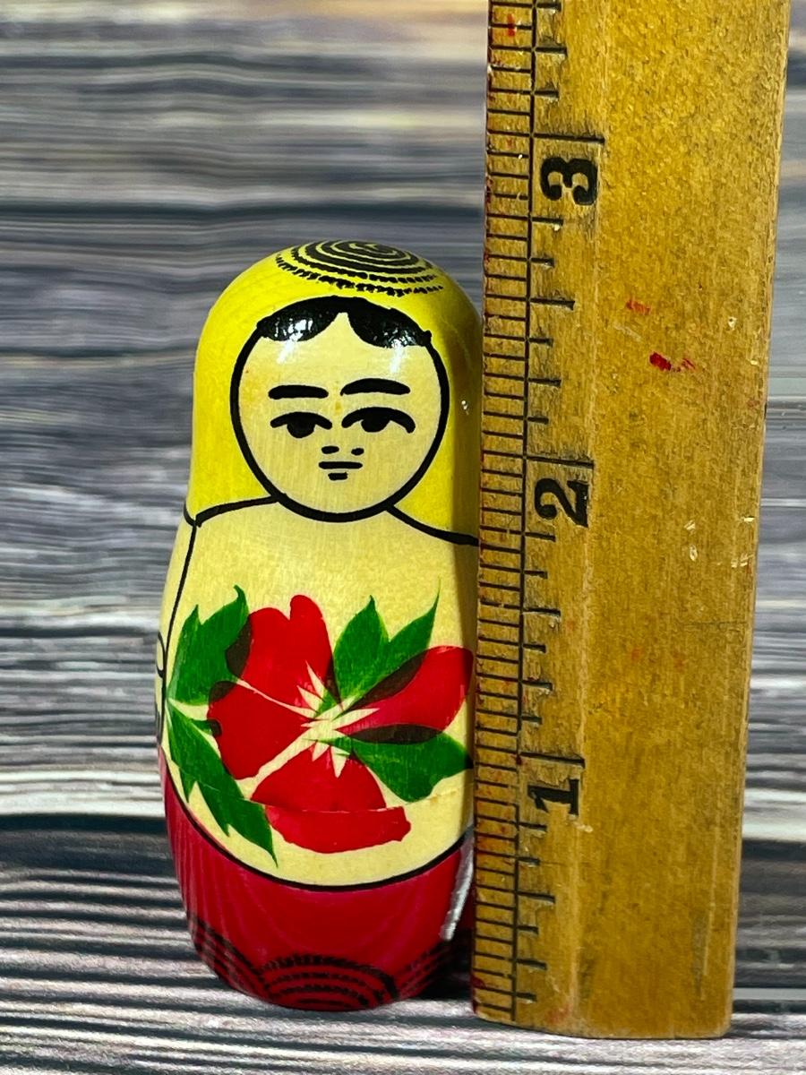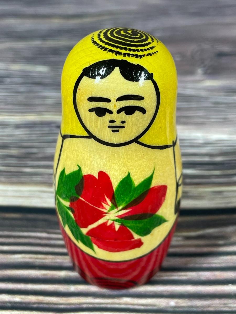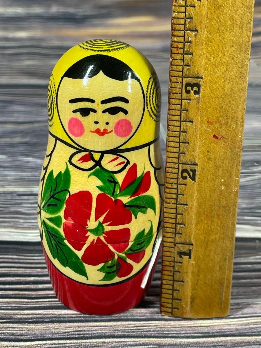 Nesting dolls are in great construction. The biggest doll is about 5” tall and the smallest is 1” tall. This is a set of five vintage nesting Russian dolls.