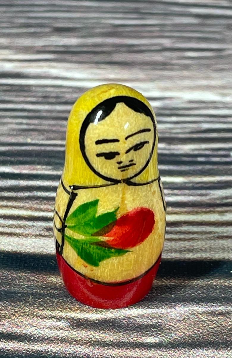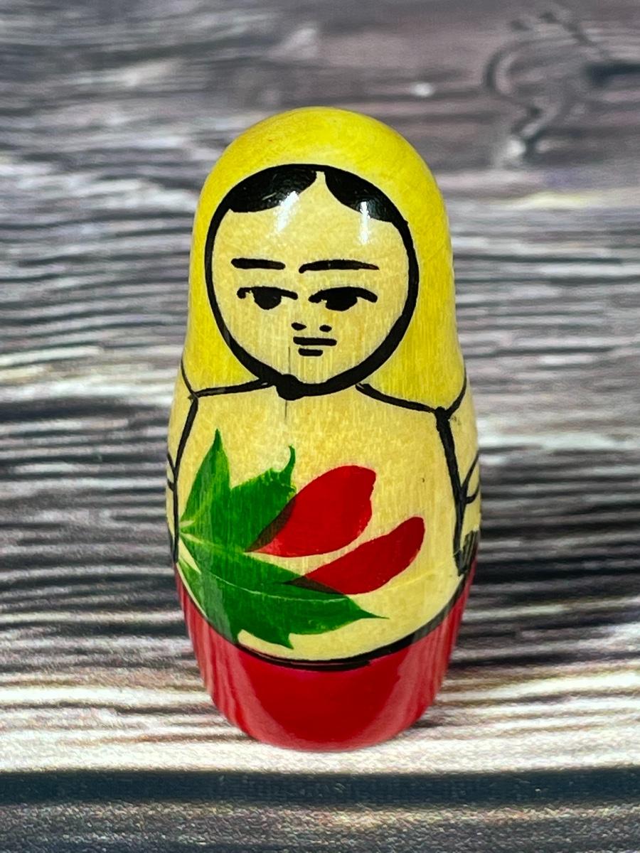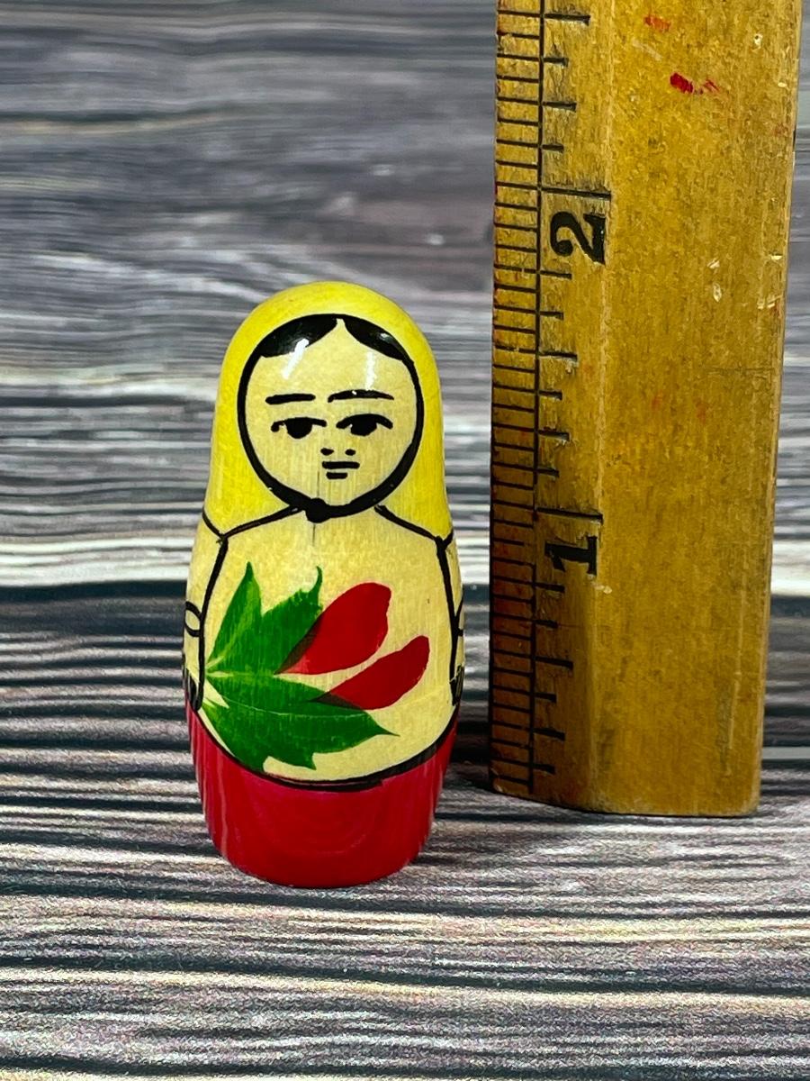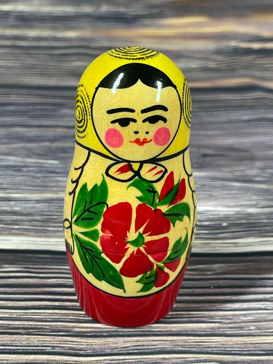 Nesting dolls are in great construction. The biggest doll is about 5” tall and the smallest is 1” tall. This is a set of five vintage nesting Russian dolls.