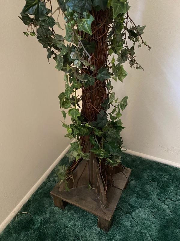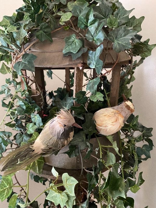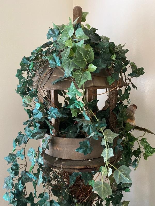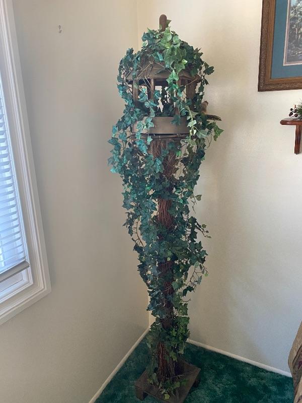 Cute rustic wood bird house. Wrapped with ivy and a couple of fake birds. Stands over 5.5' tall. Has been inside but may be dusty from display.