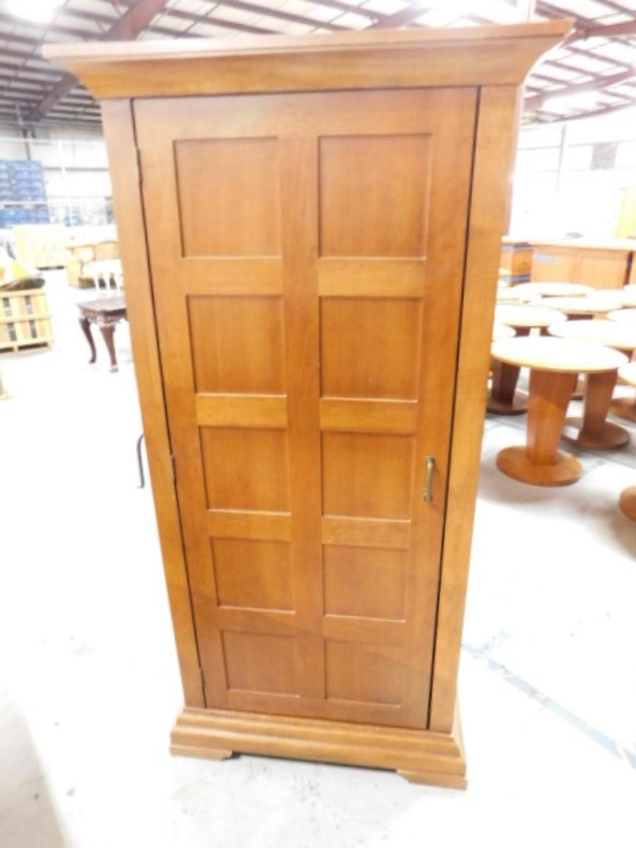 Rustic Arts and Crafts Design Single Door Armoire Cabinet may have a removable safe box on shelf. Bidder is buying one unit. Expect some wear or scratches to the finish. Shipping option available via freight or local mover at Buyer's expense. Buyer must have all shipping scheduled within the stated dates and times of pickup. Recommended local mover is Beaty Bros. Moving 828-201-2982