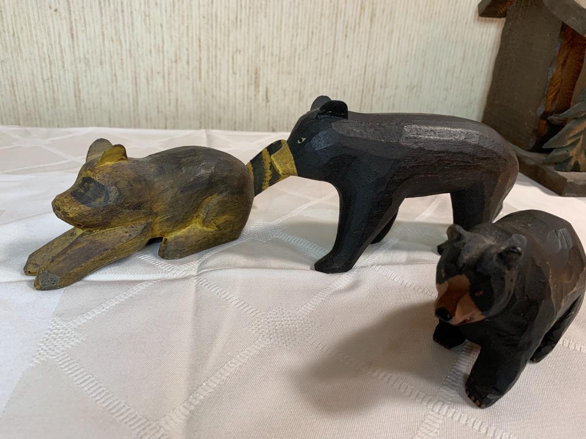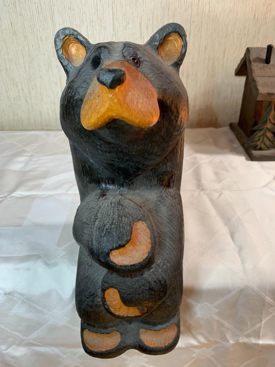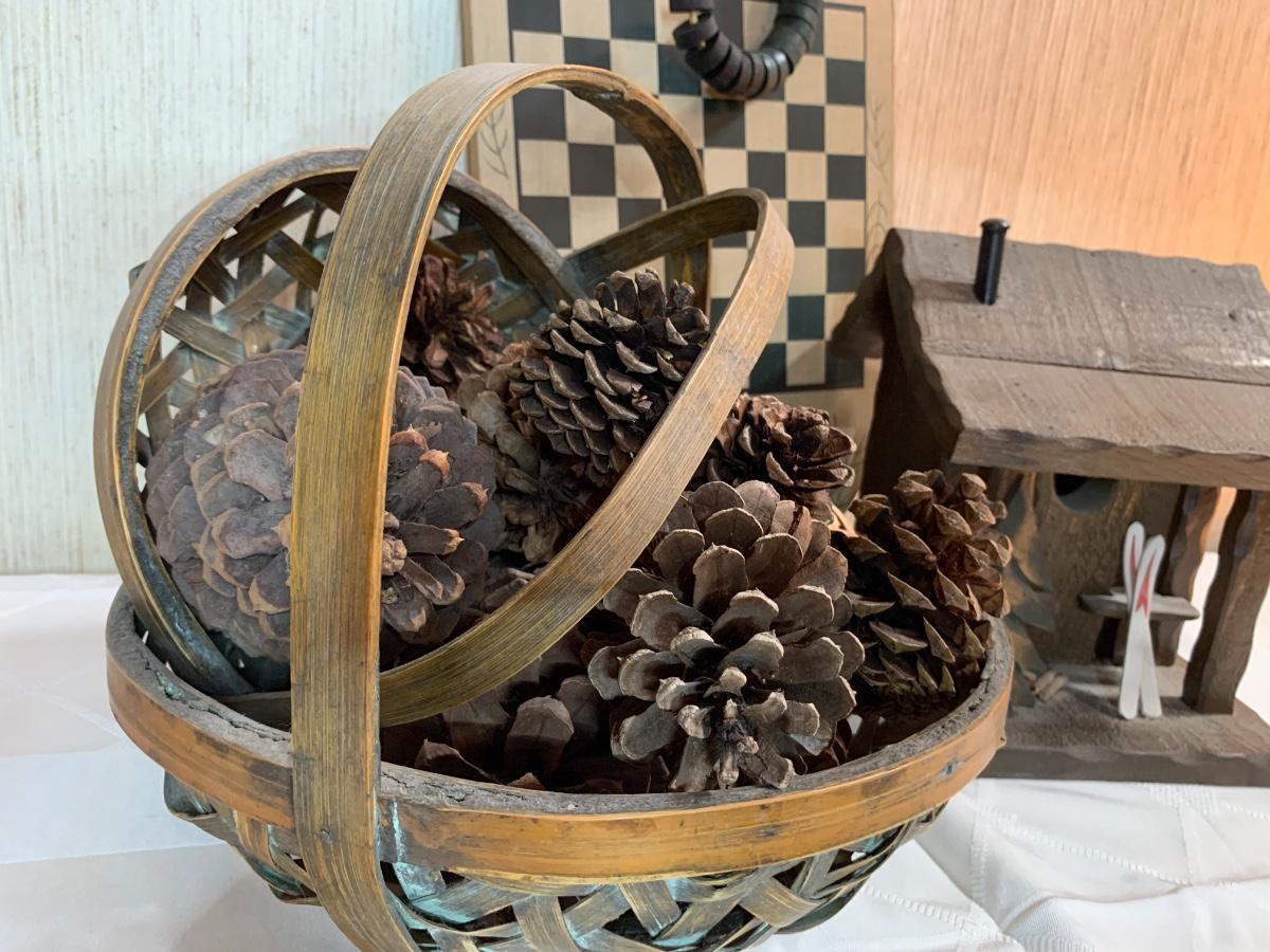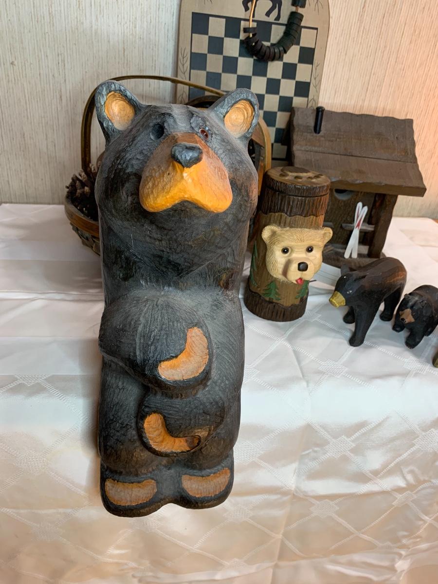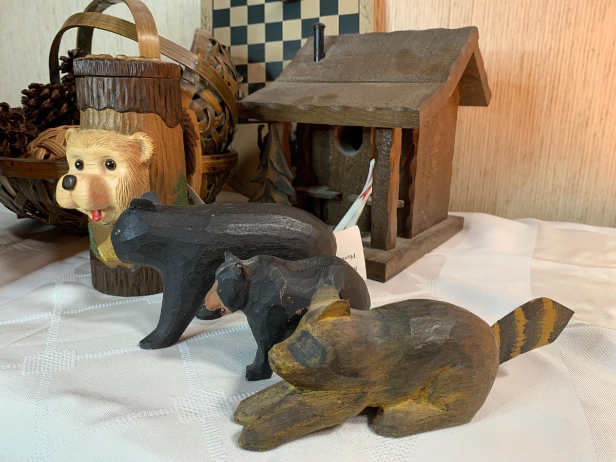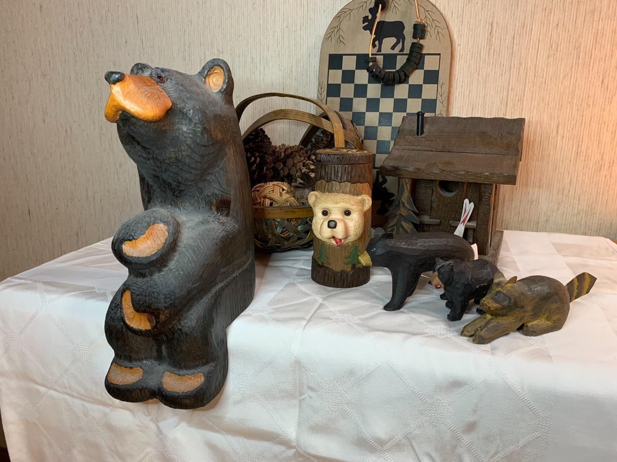 Lot containing bears made from all different materials. A Rustic Ski Cabin. A Moose Checkerboard. A decorative basket full of pinecones. The large bear that sits on a ledge is missing one eye and is about 2 ft tall. Otherwise all other items in great condition.