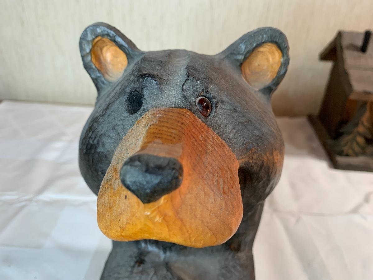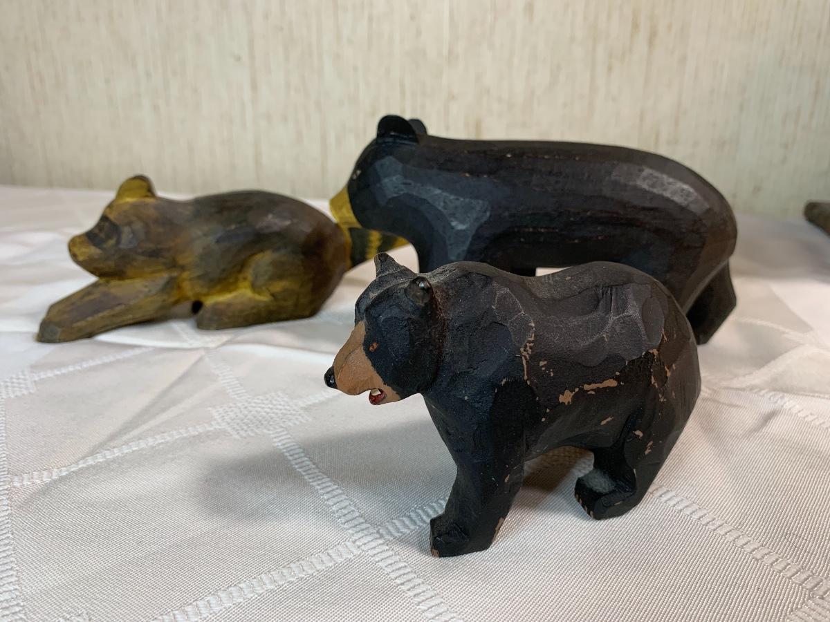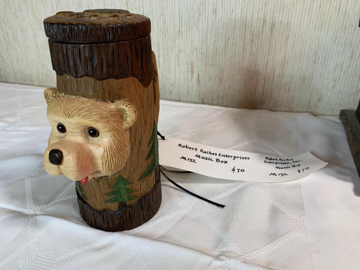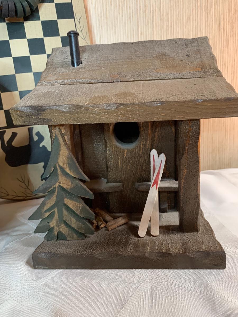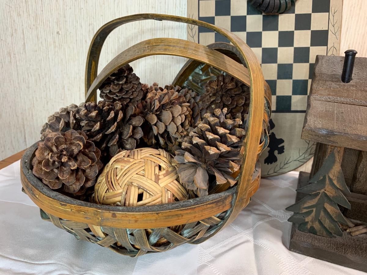 Lot containing bears made from all different materials. A Rustic Ski Cabin. A Moose Checkerboard. A decorative basket full of pinecones. The large bear that sits on a ledge is missing one eye and is about 2 ft tall. Otherwise all other items in great condition.