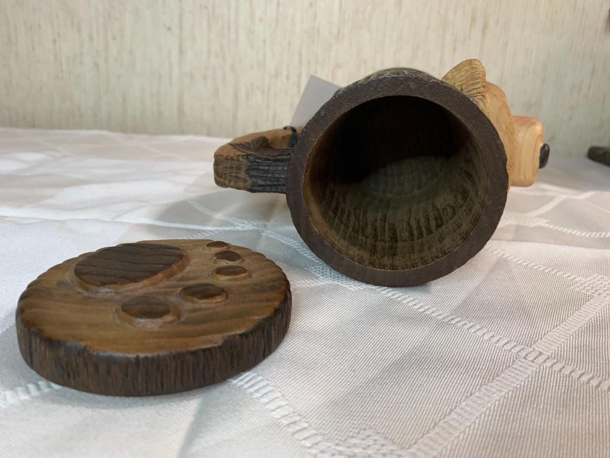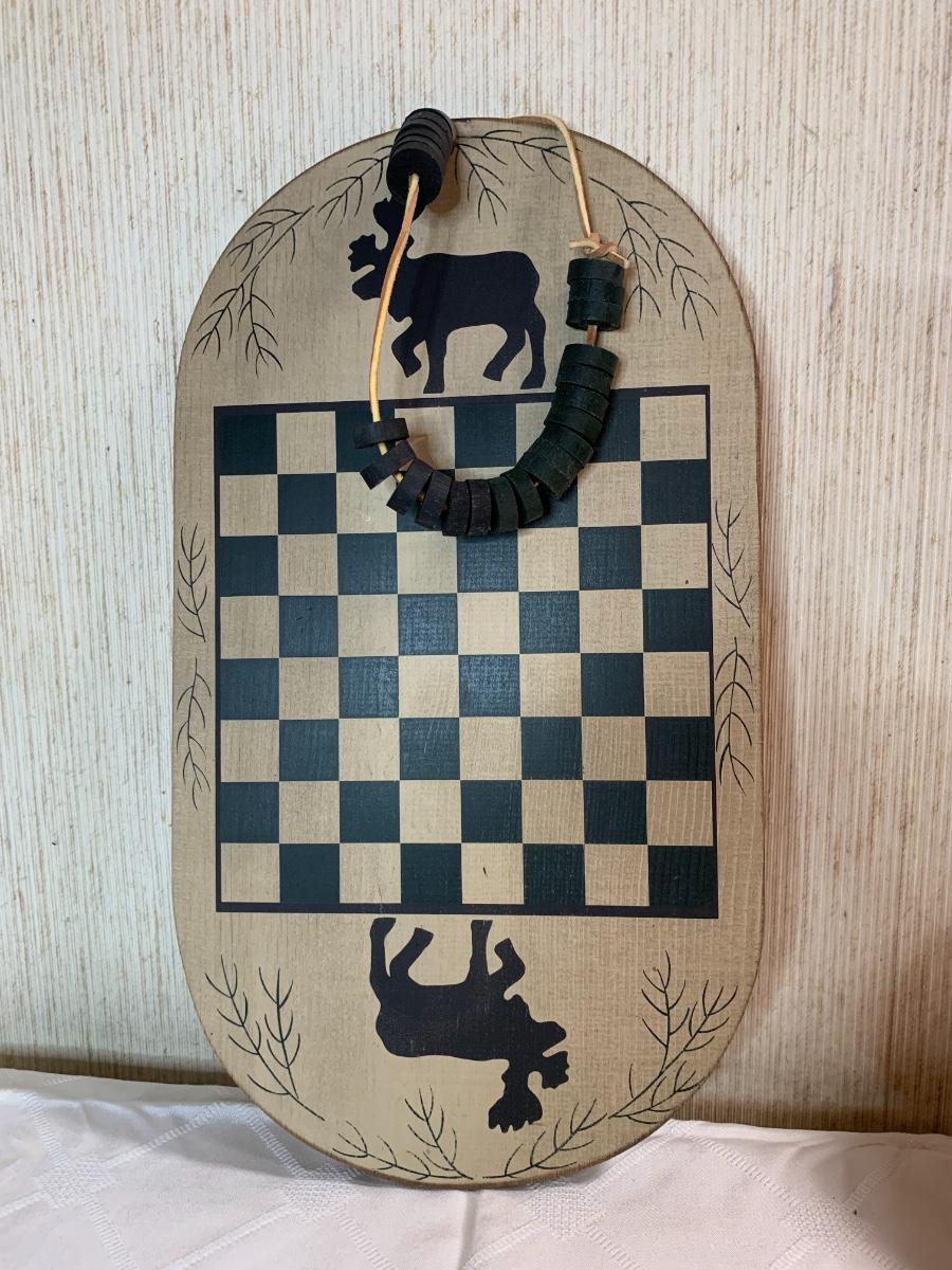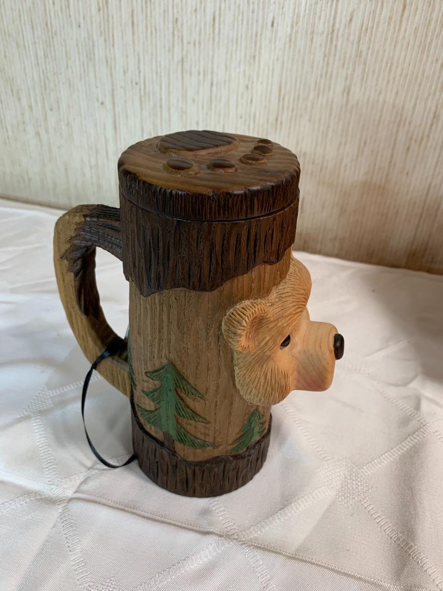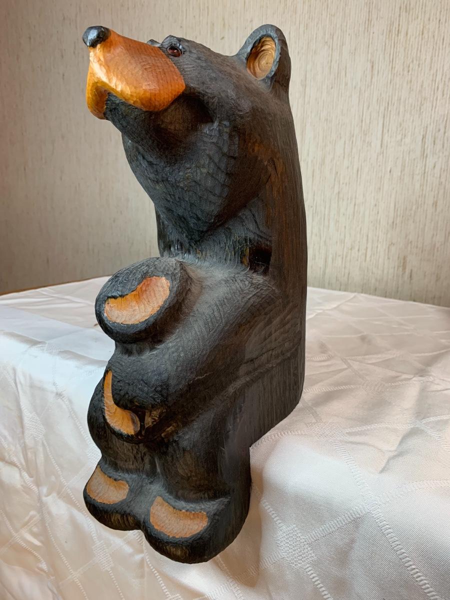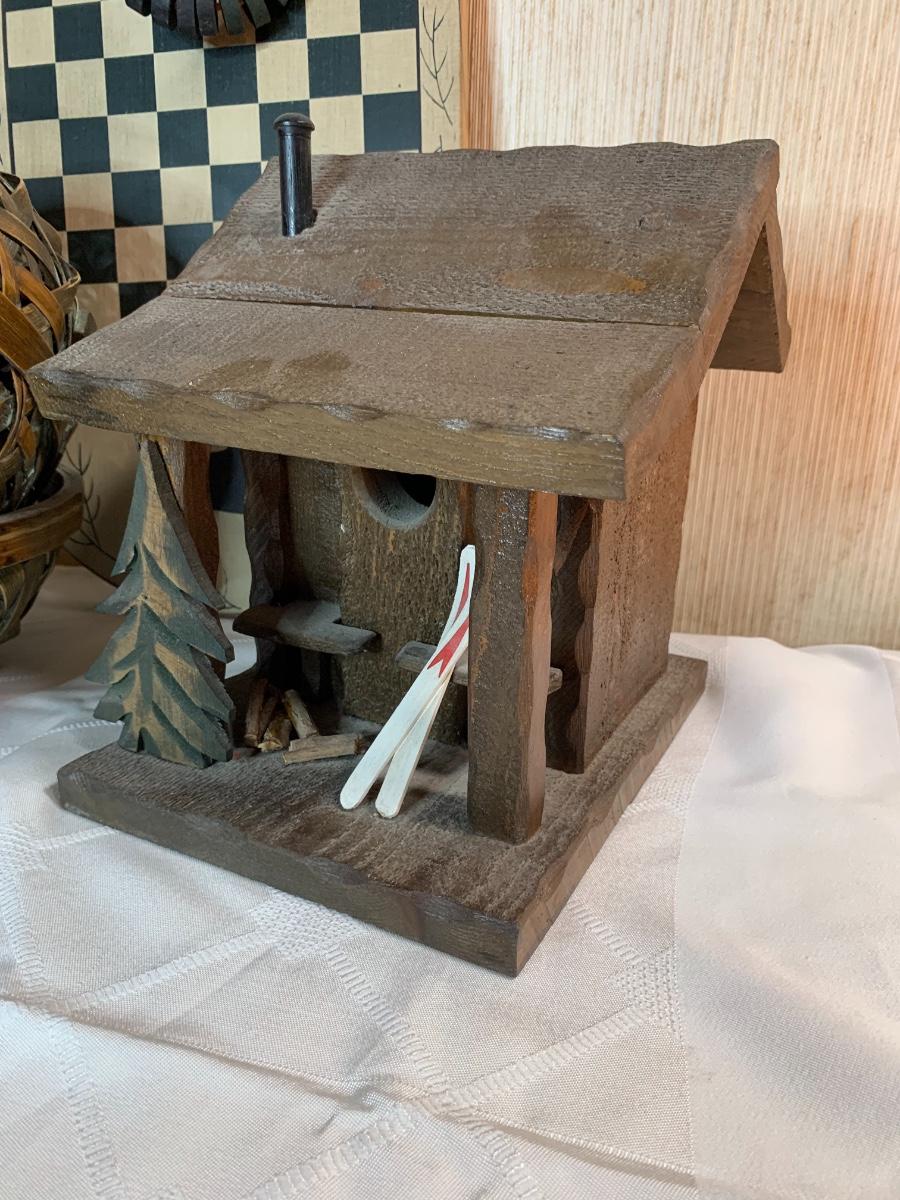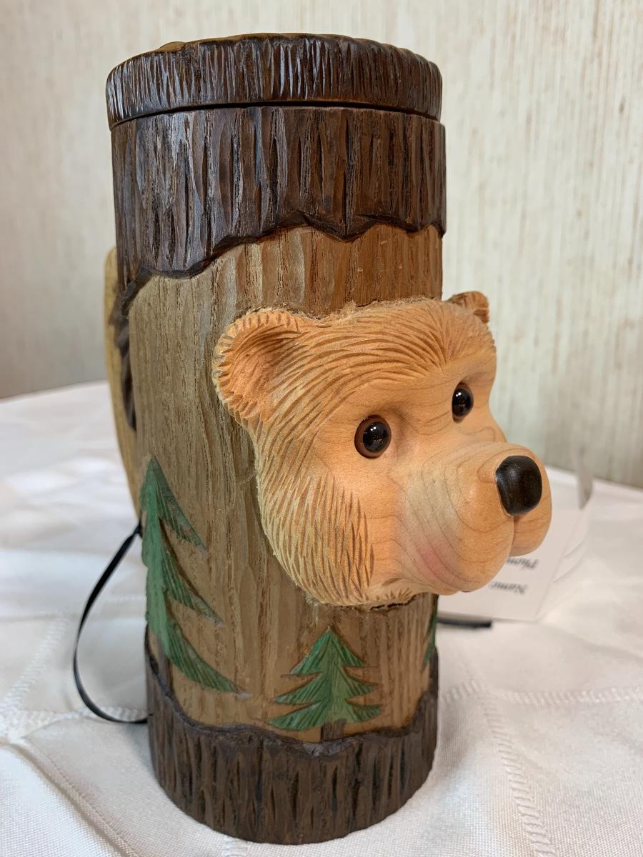 Lot containing bears made from all different materials. A Rustic Ski Cabin. A Moose Checkerboard. A decorative basket full of pinecones. The large bear that sits on a ledge is missing one eye and is about 2 ft tall. Otherwise all other items in great condition.