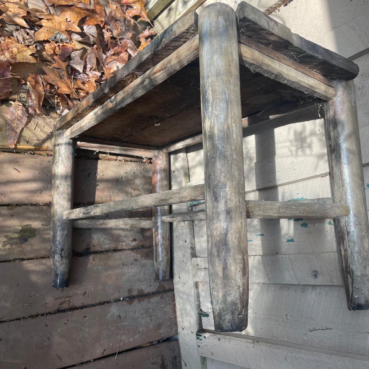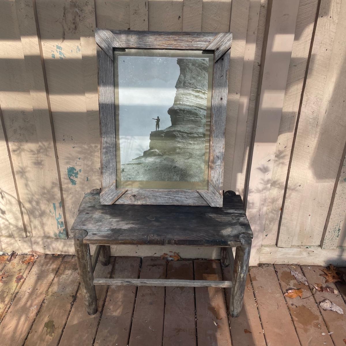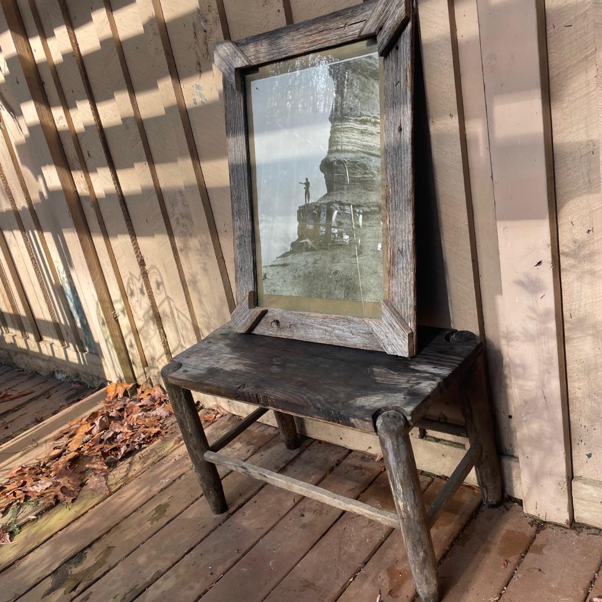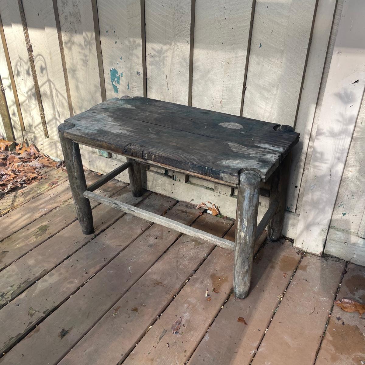 This rustic bench measures 29” x 15.5 x 17.5” and is in good condition (it was partially wet when photographed, hence the darker areas). We paired it with a rustic framed black and white photo; frame measures 21.5” x 29“.