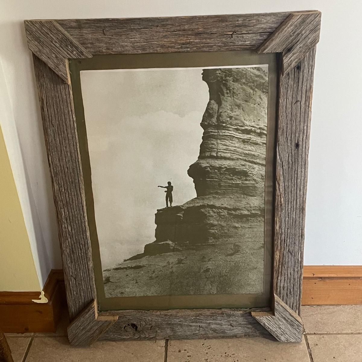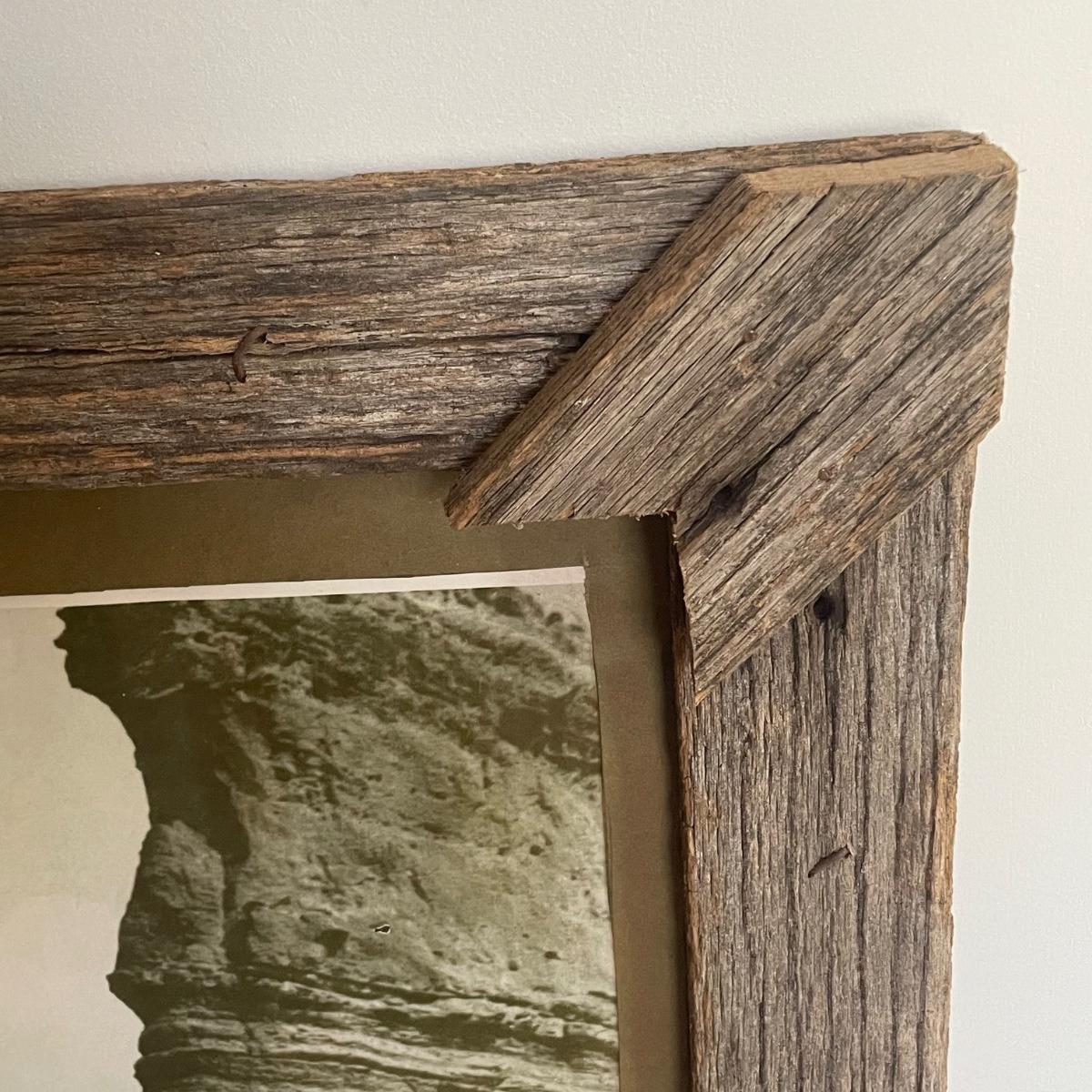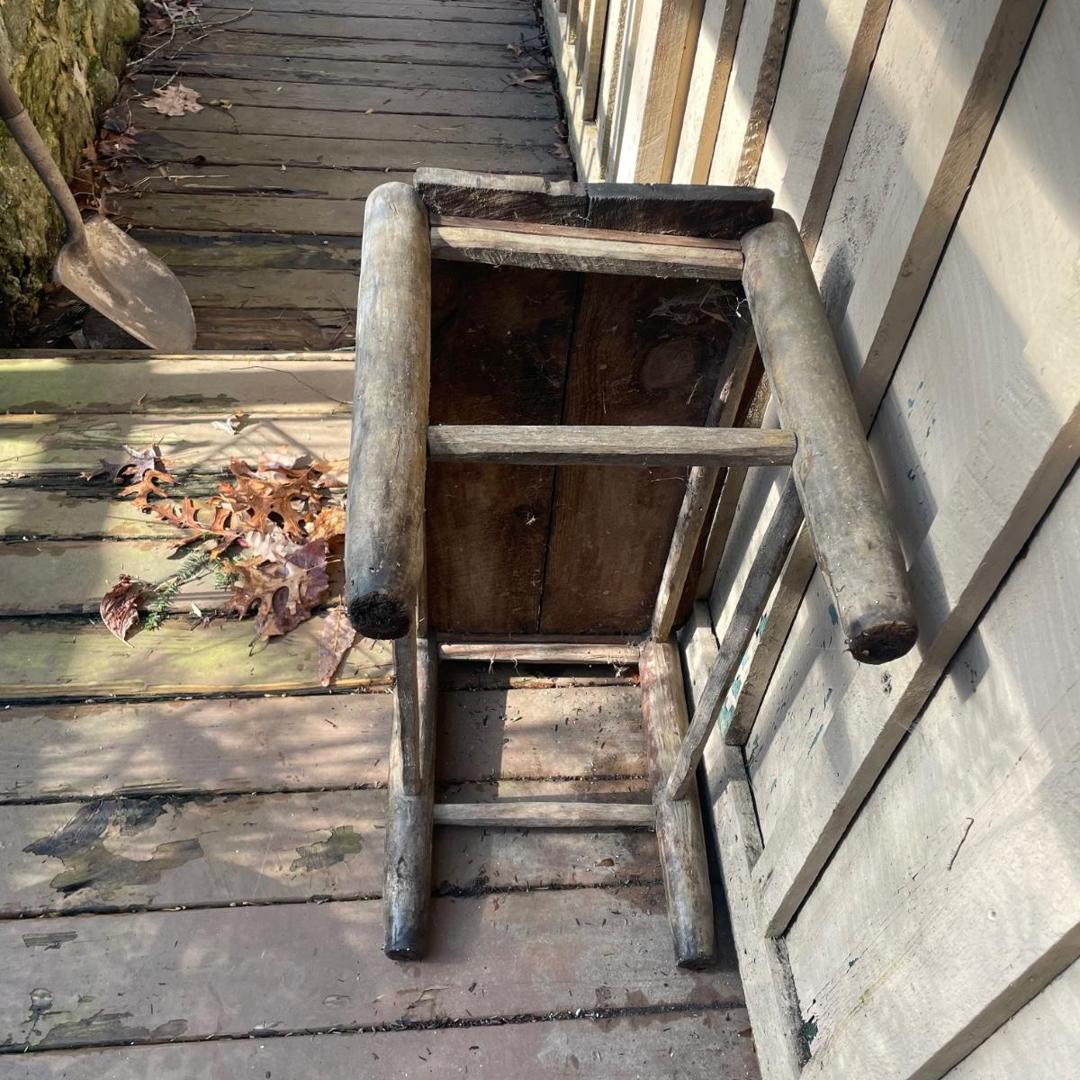 This rustic bench measures 29” x 15.5 x 17.5” and is in good condition (it was partially wet when photographed, hence the darker areas). We paired it with a rustic framed black and white photo; frame measures 21.5” x 29“.