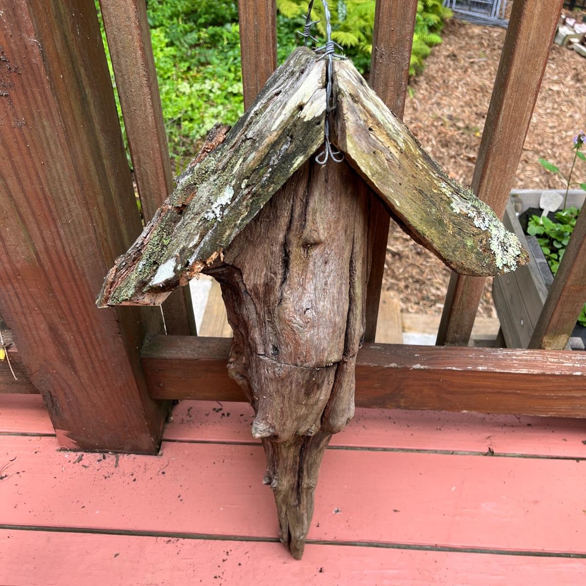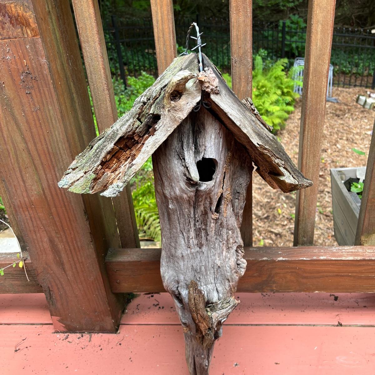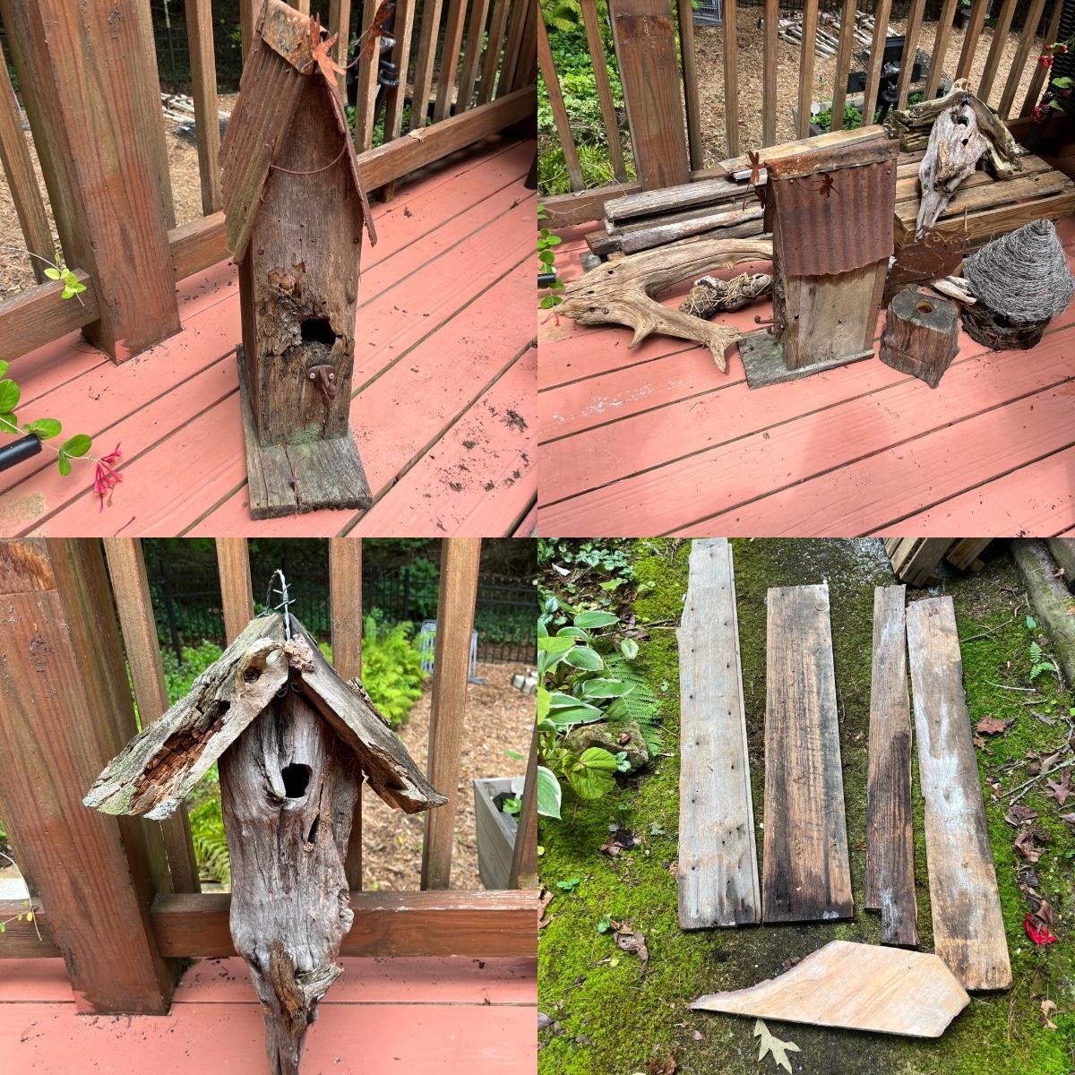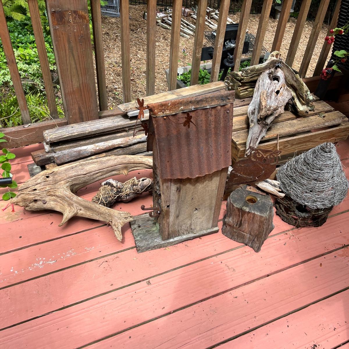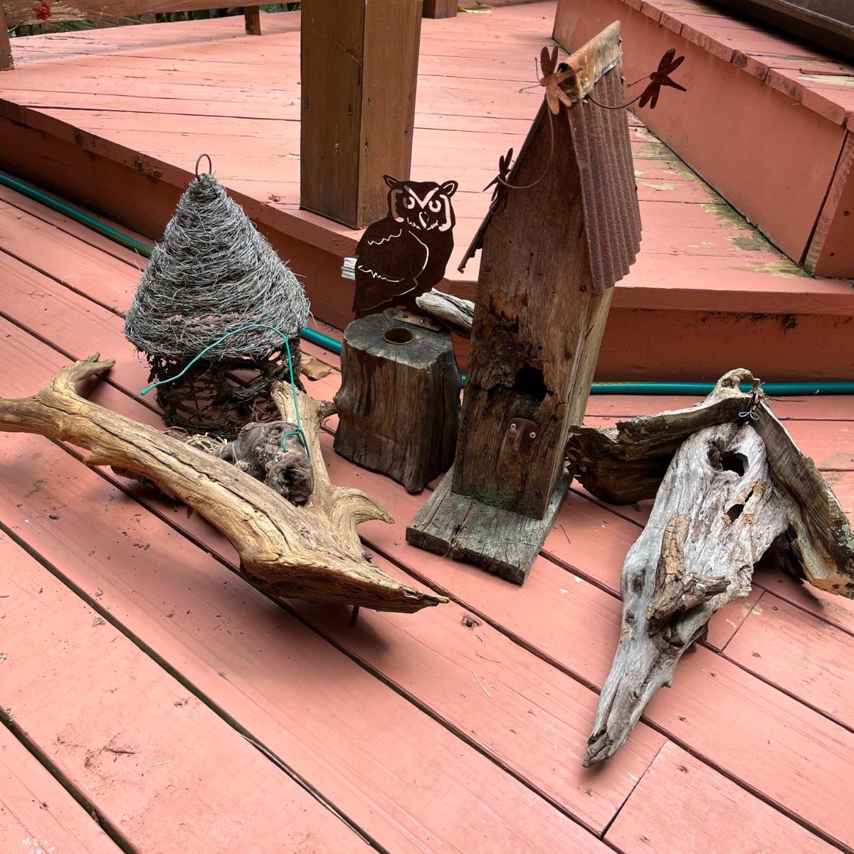 Lot includes driftwood birdhouse, barn wood birdhouse, owl perch, barn wood, driftwood and more. Largest birdhouse 6” x 13” x 24”H and longest piece of barn wood measures 55” x .75” x 7”H.