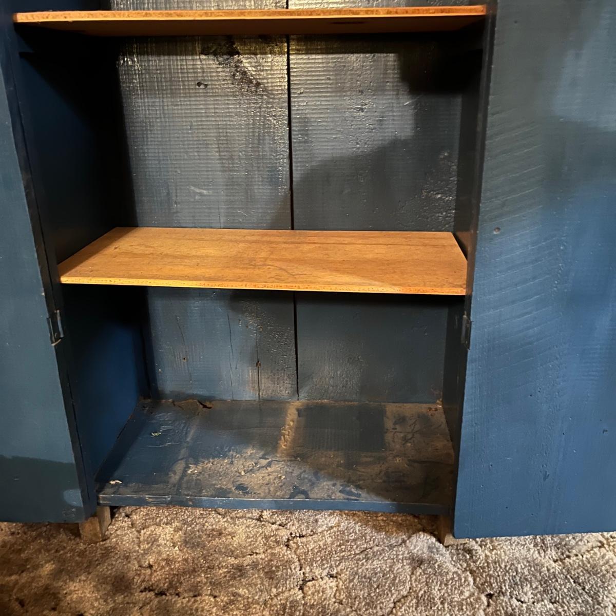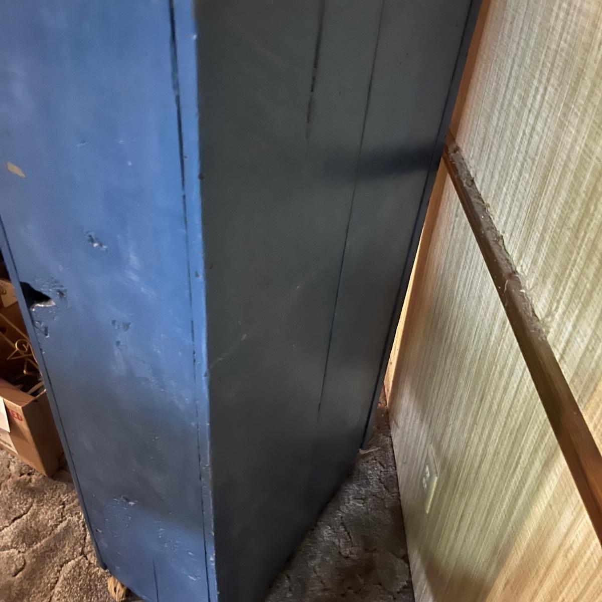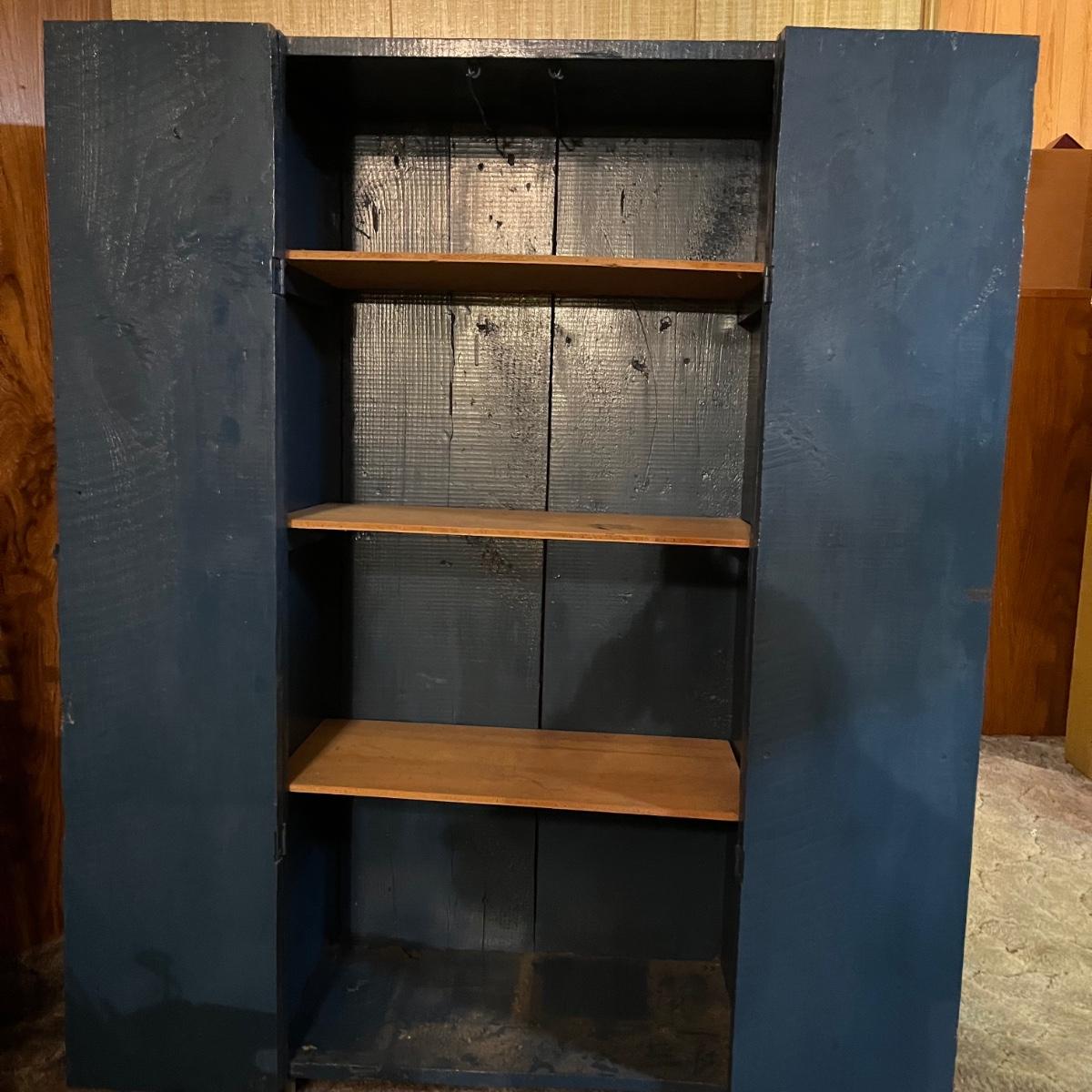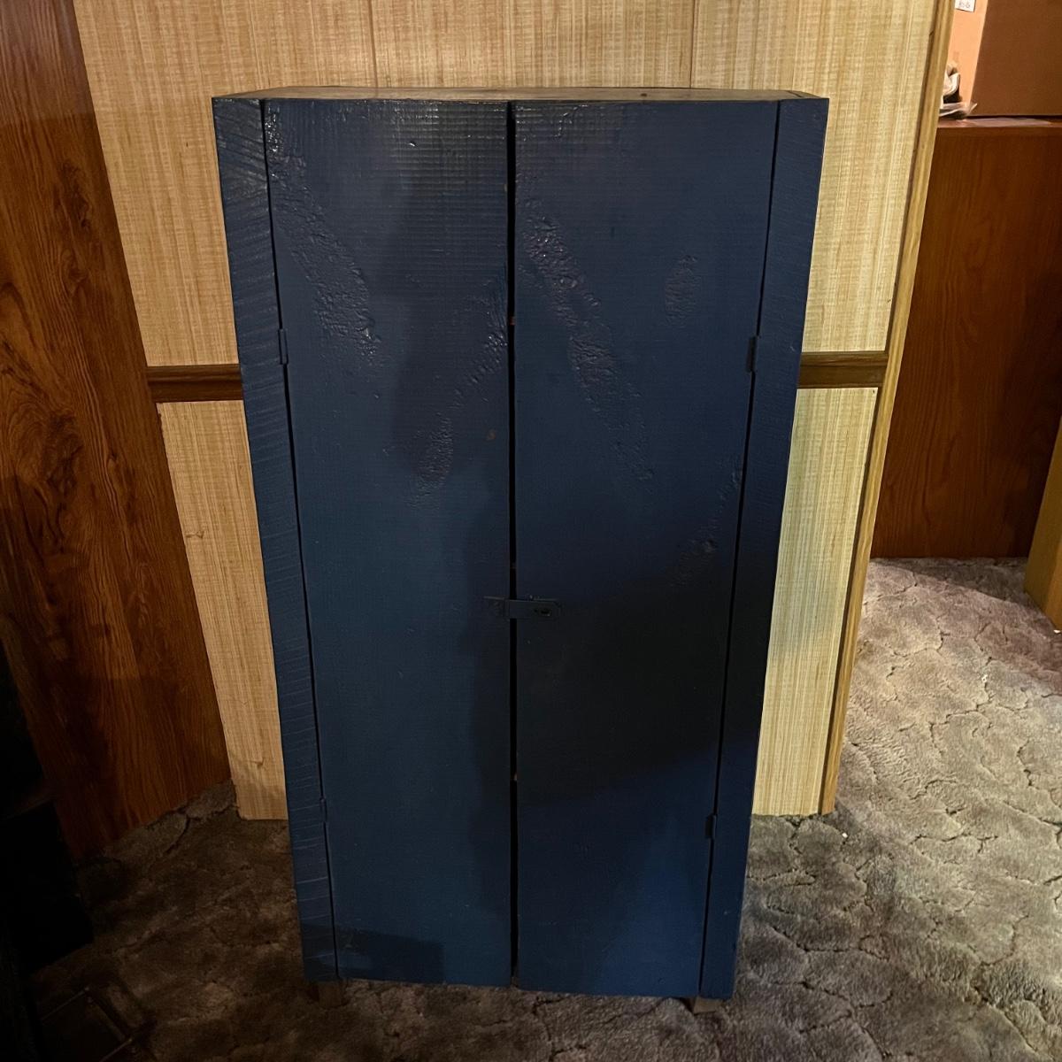 Lot includes a rustic blue painted wood cabinet with hasp on front and three shelves inside. Cabinet measures 13” x 24.5” x 50”.