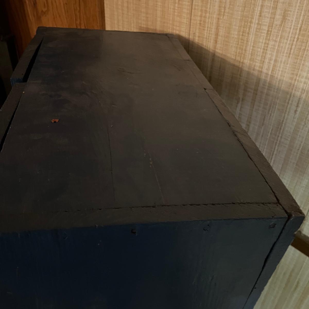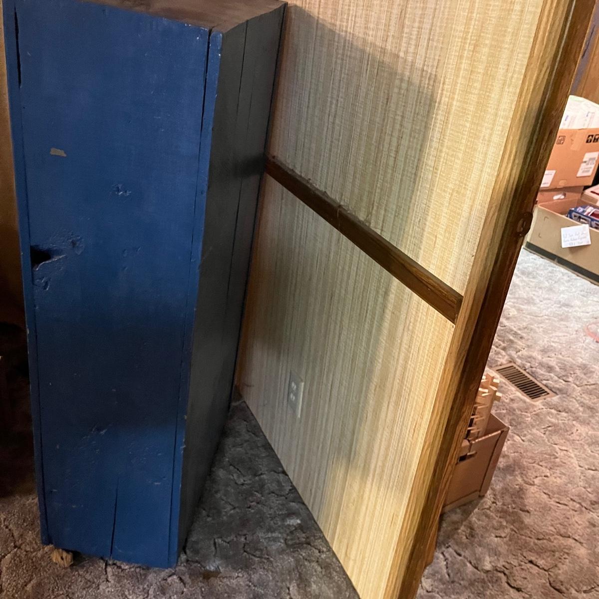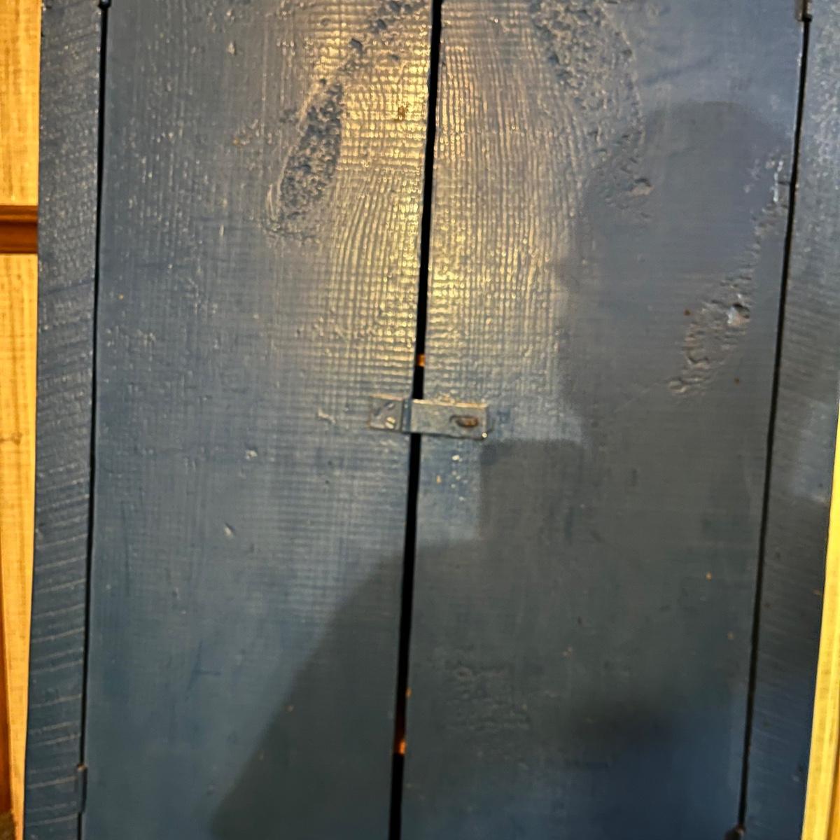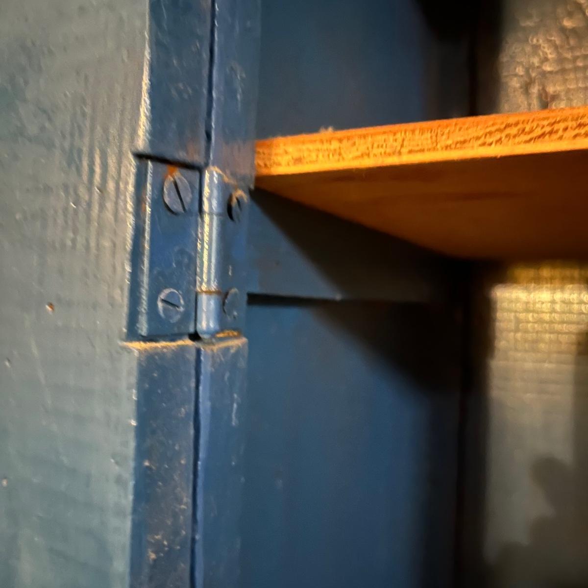 Lot includes a rustic blue painted wood cabinet with hasp on front and three shelves inside. Cabinet measures 13” x 24.5” x 50”.