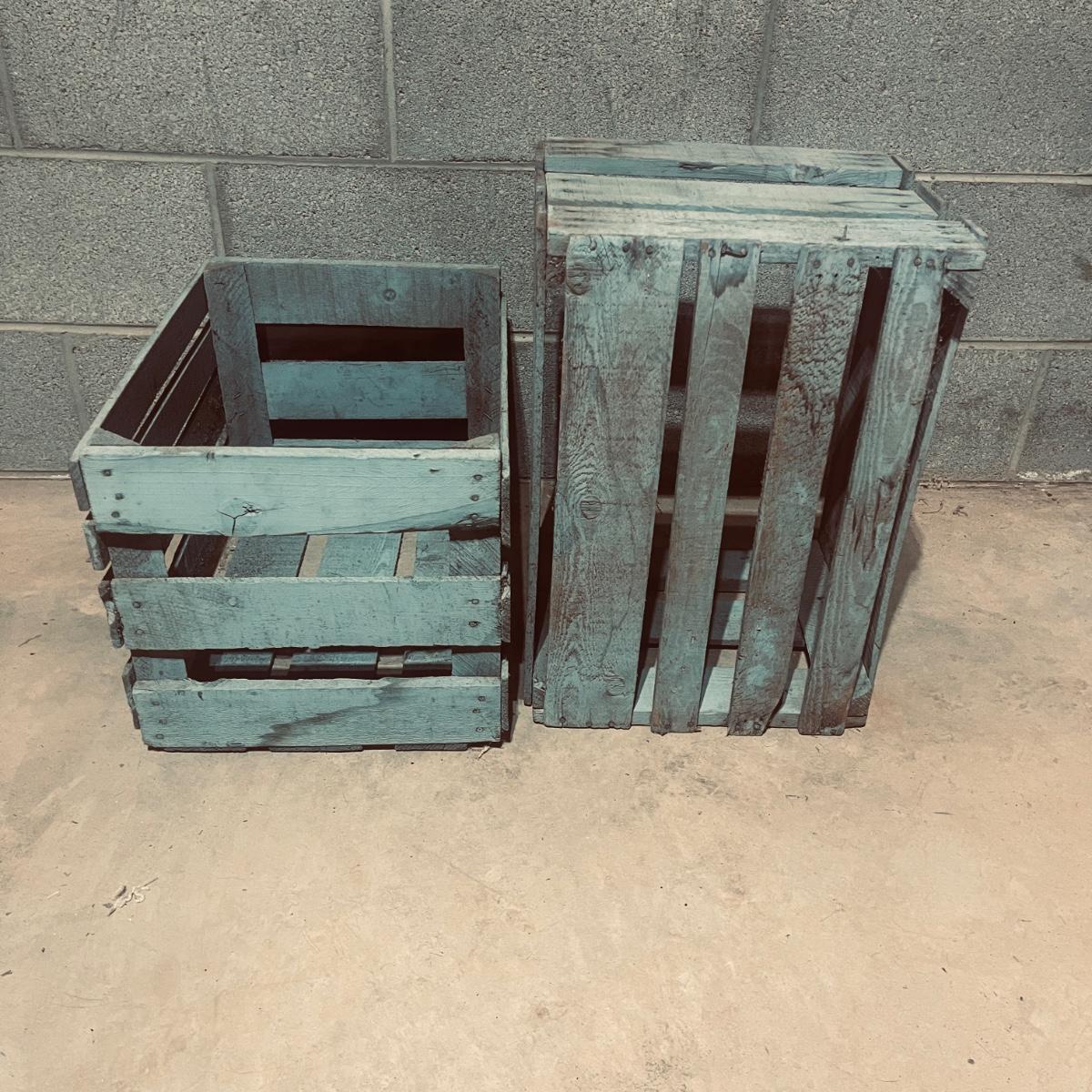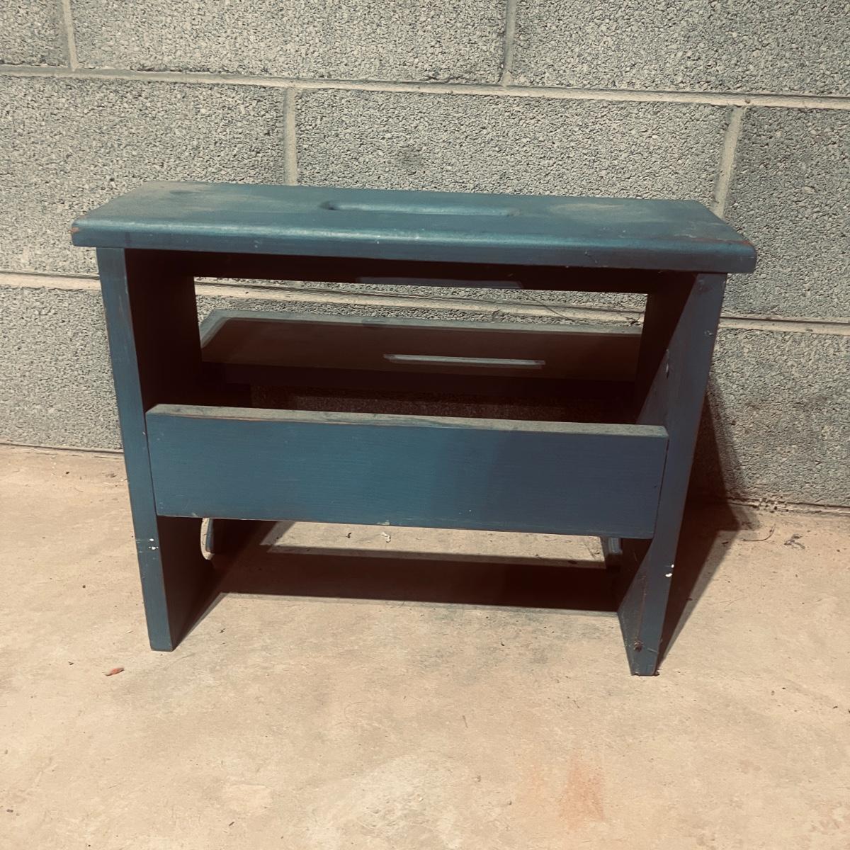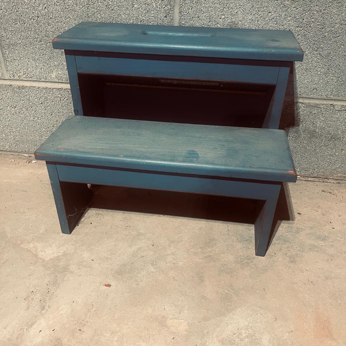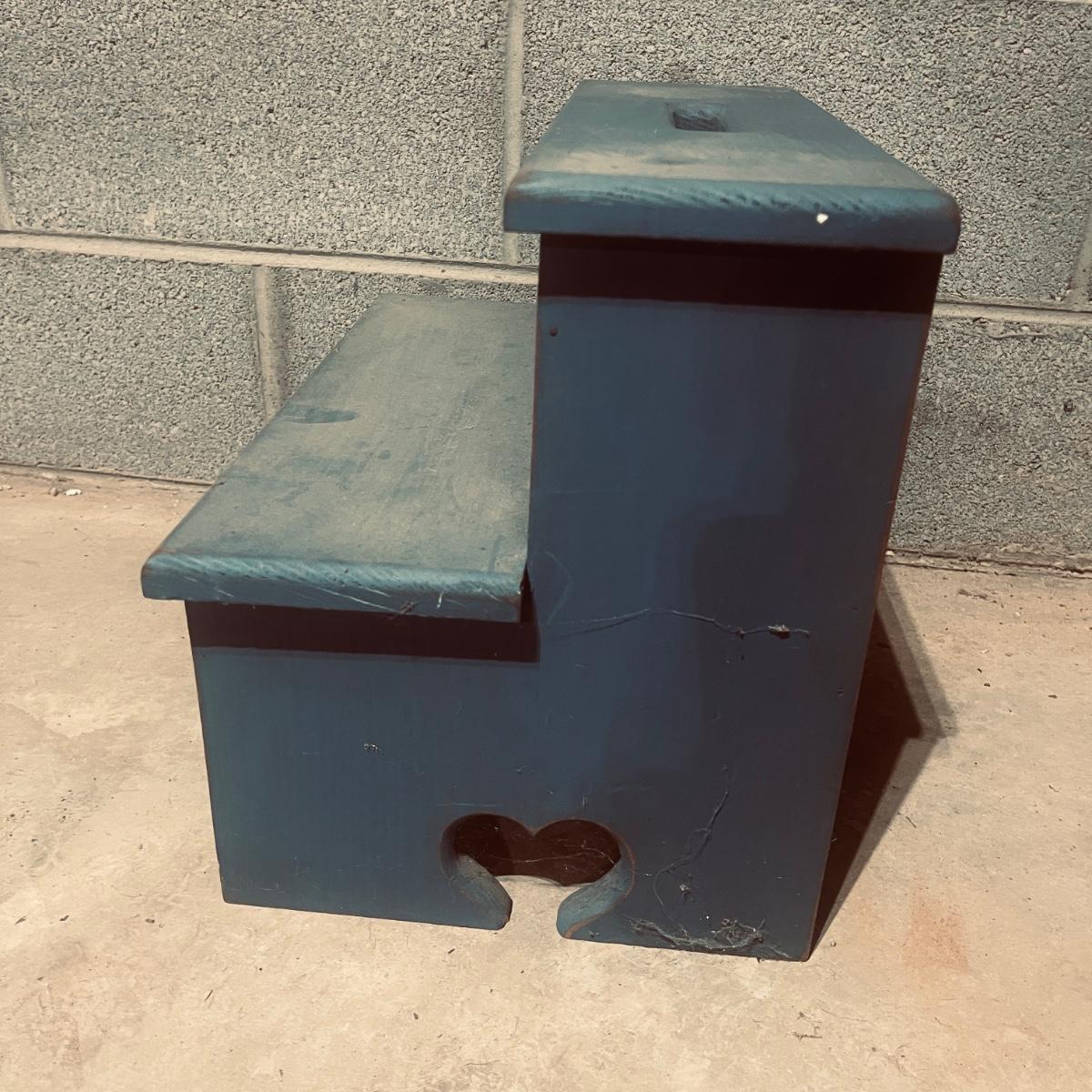 Lot includes two wooden crates, wooden step stool, wooden open/closed sign and doll sized wooden bench. Crates measure 13.5” x 19” x 12”H.