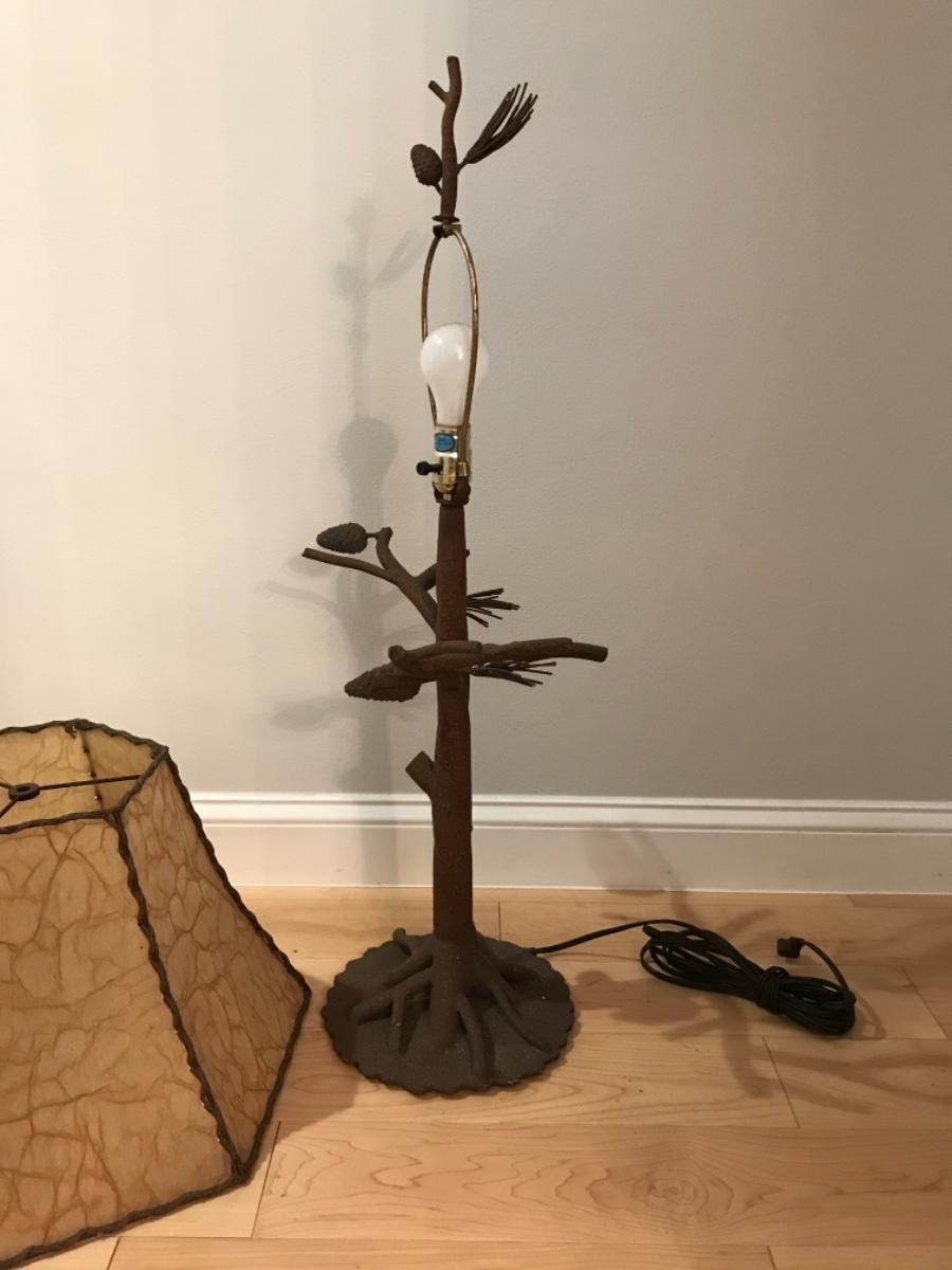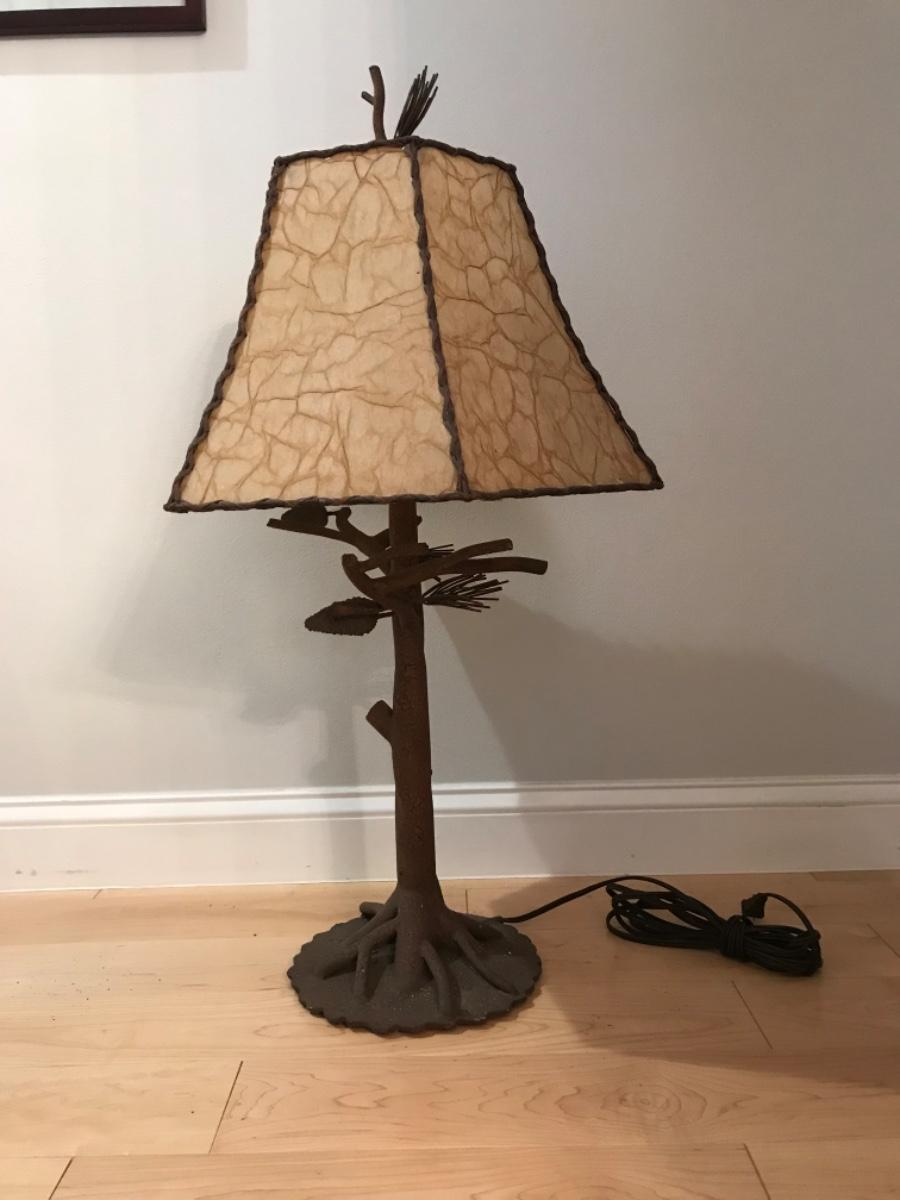 A realistic cast fiber branch base with the look and feel of real bark provides the base for this rustic table lamp. It features a laced faux cow leather shade.