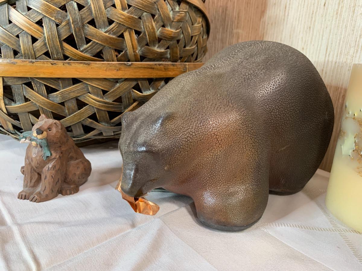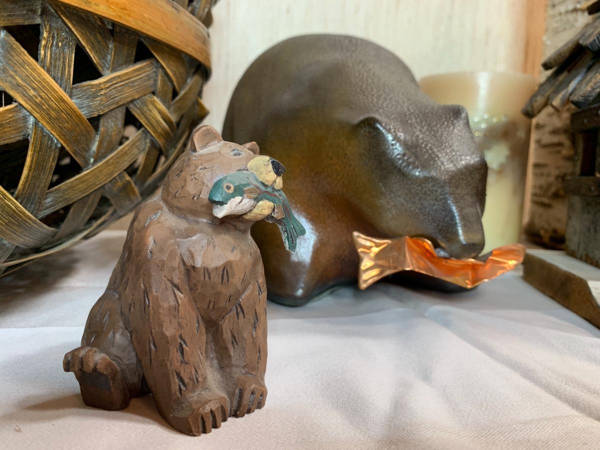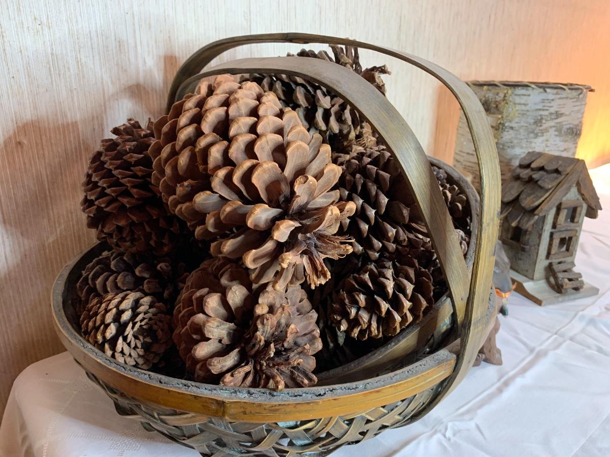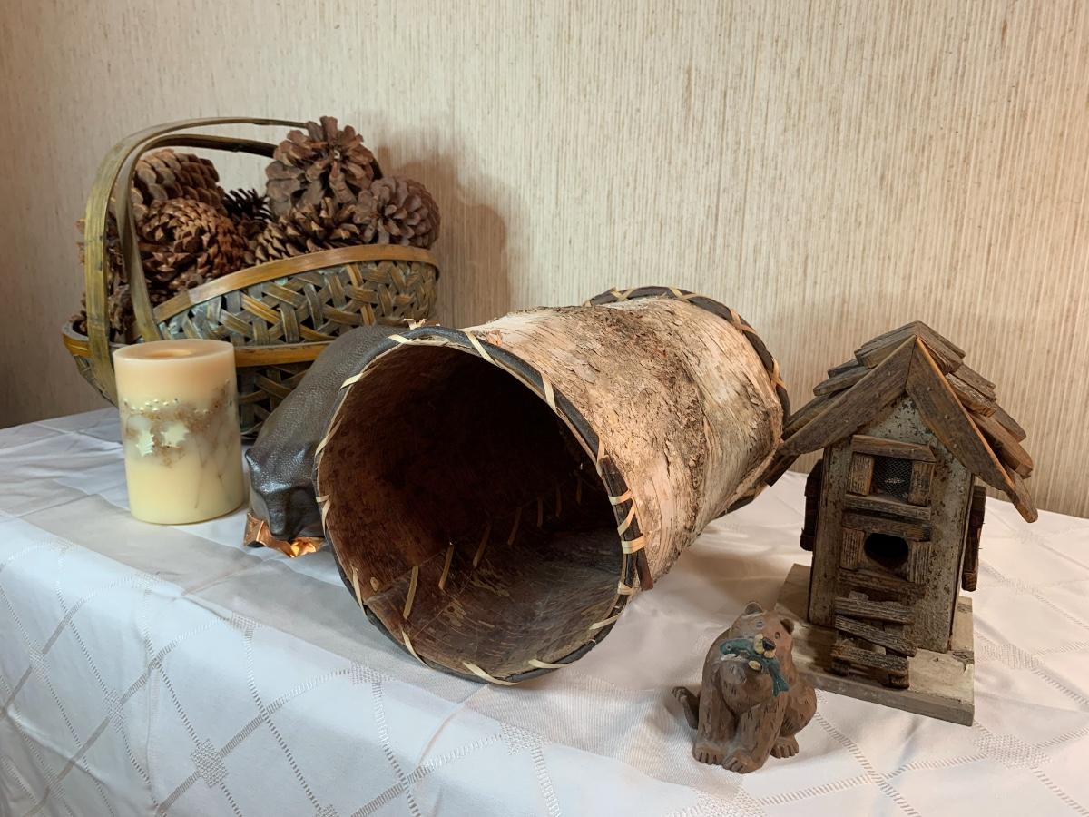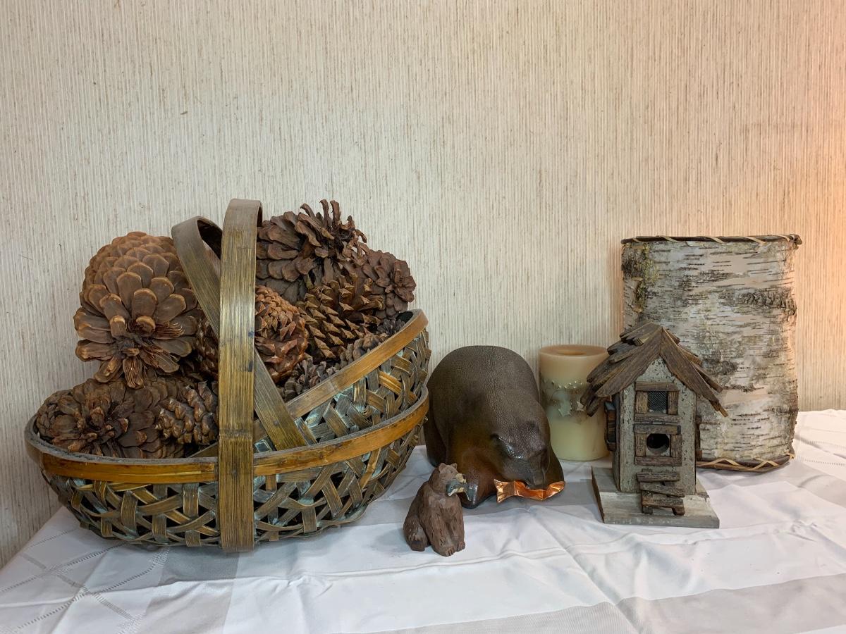 Two Nestled Baskets with pine cones, two bears (one large and one small made of different materials), A Tree Bark Trash Can about 1ft tall, a rustic candle, and a decorative cabin made from a tree.