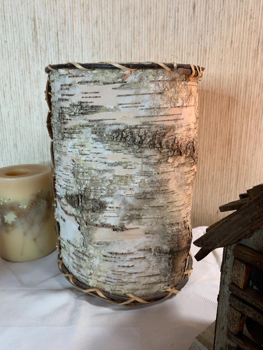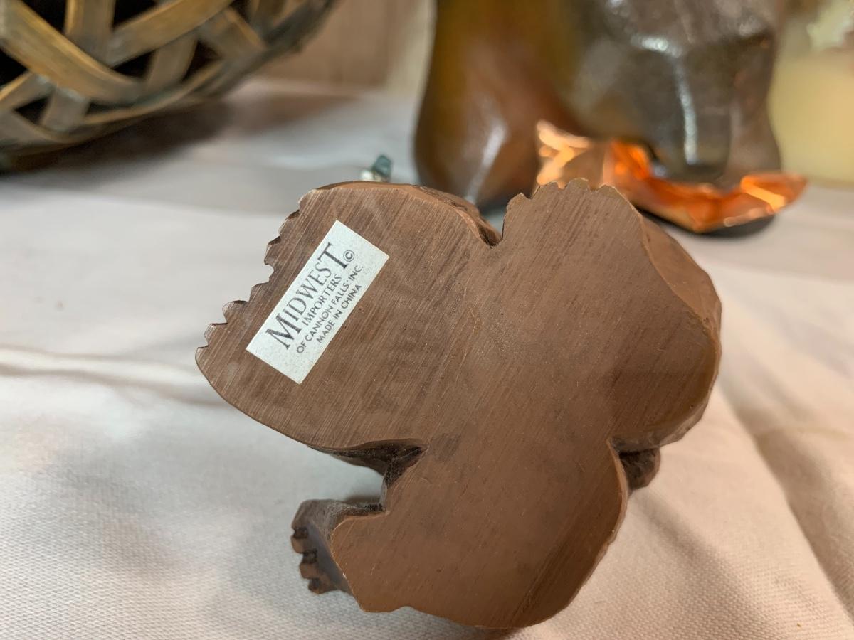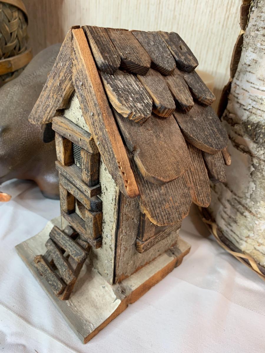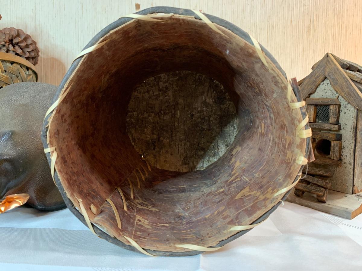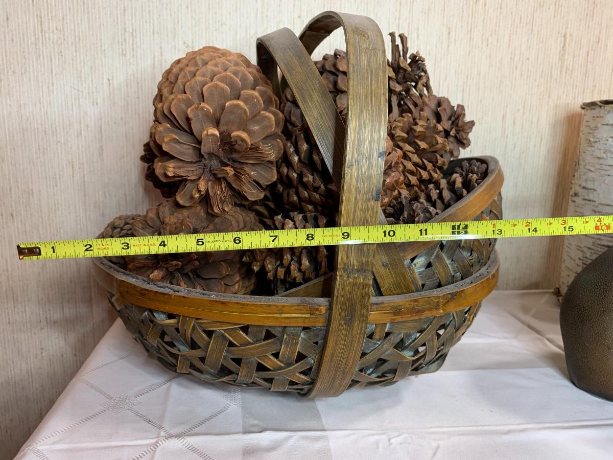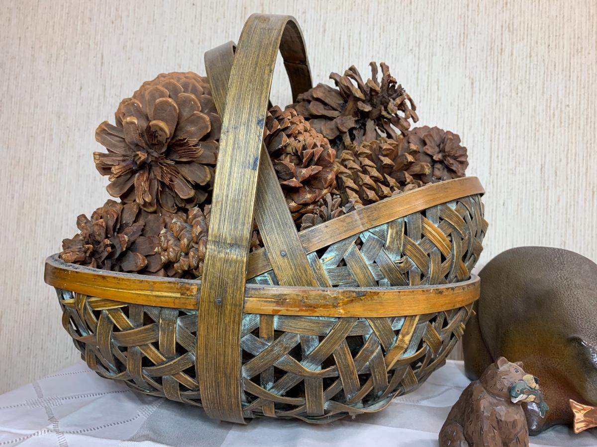 Two Nestled Baskets with pine cones, two bears (one large and one small made of different materials), A Tree Bark Trash Can about 1ft tall, a rustic candle, and a decorative cabin made from a tree.