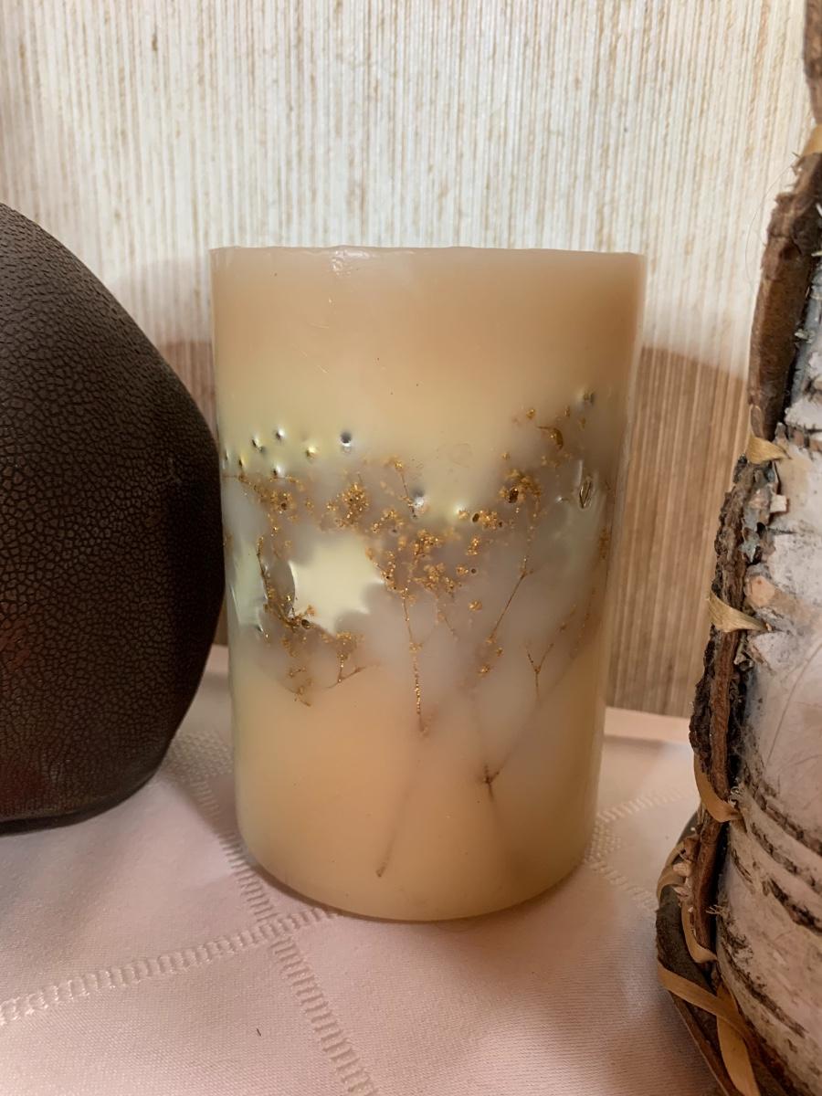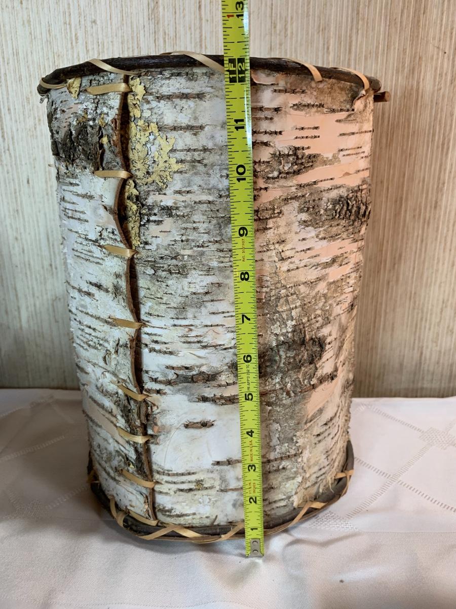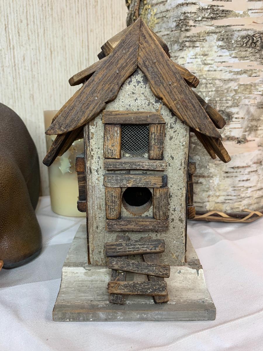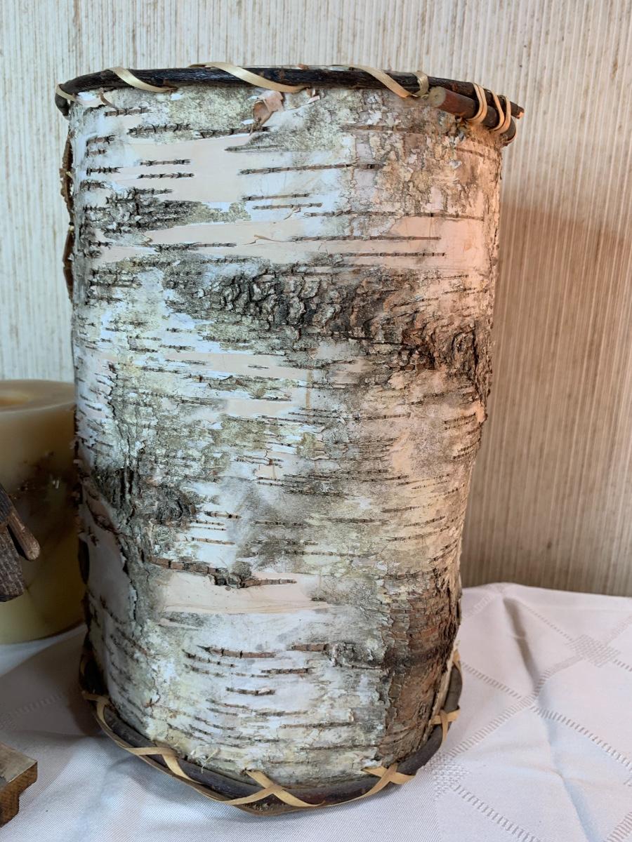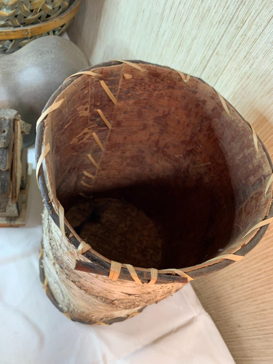 Two Nestled Baskets with pine cones, two bears (one large and one small made of different materials), A Tree Bark Trash Can about 1ft tall, a rustic candle, and a decorative cabin made from a tree.