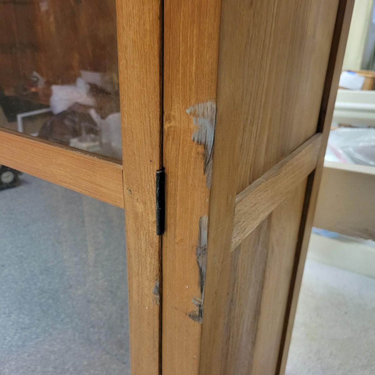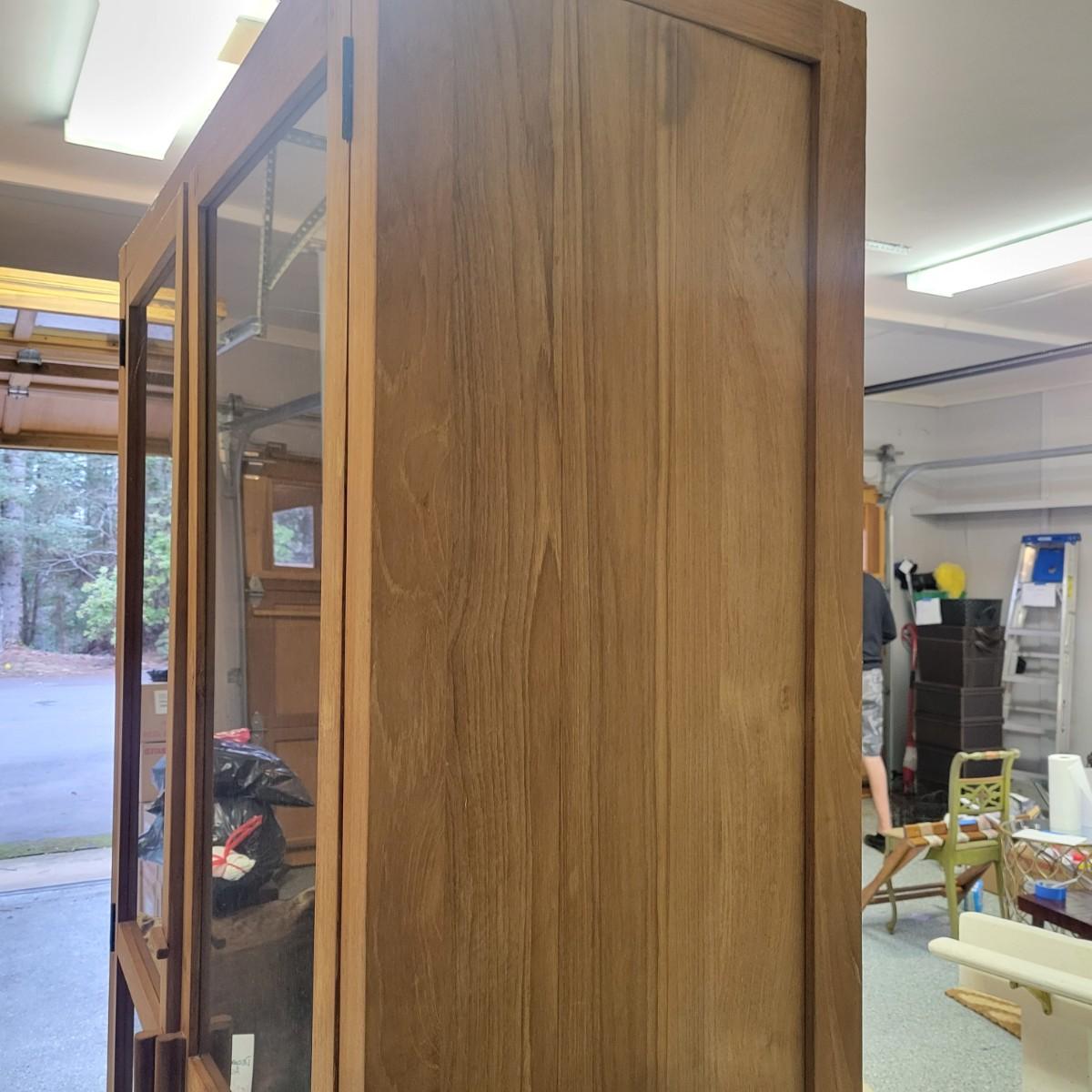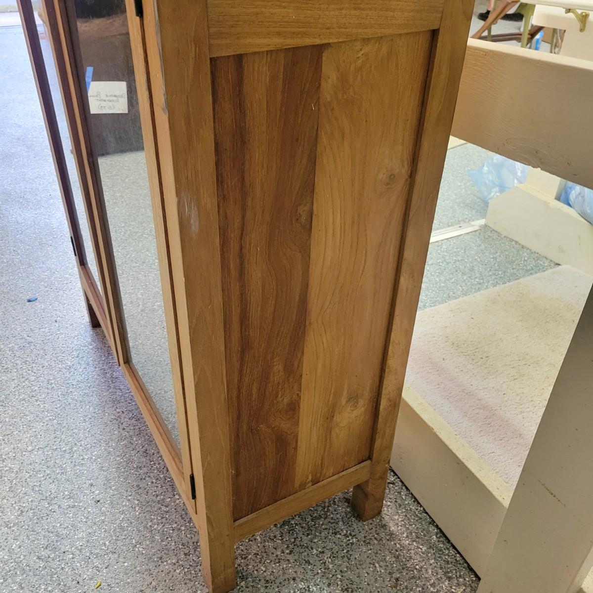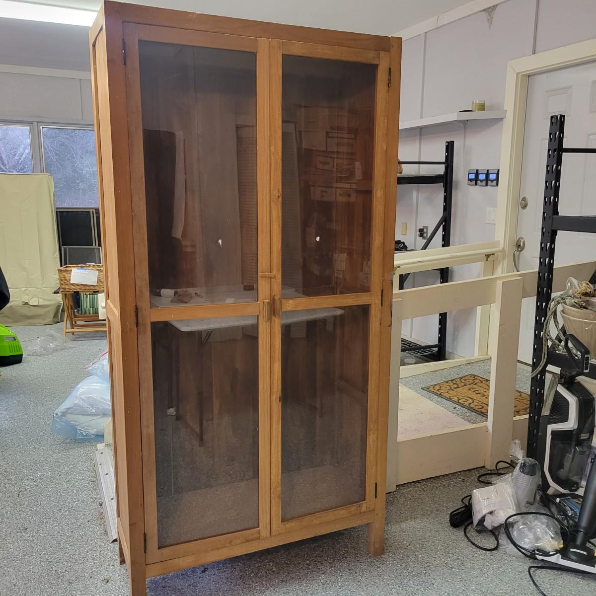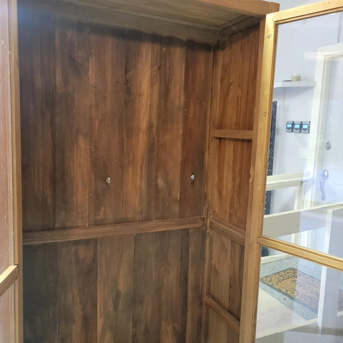 A rustic, solid wood cabinet with glass doors, that has some scratches and blemishes, and is missing its shelves. This cabinet measures approximately 40" x 16" x 79"H. Local pickup only. Winning bidder must bring assistance to help move and load this item due to its weight and/or size.