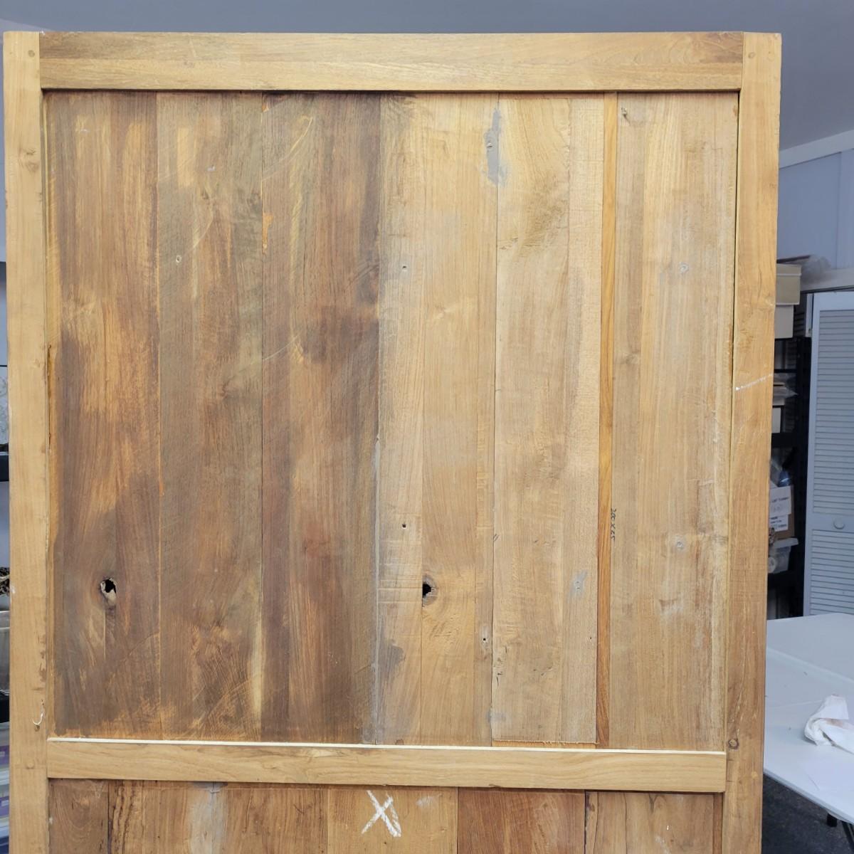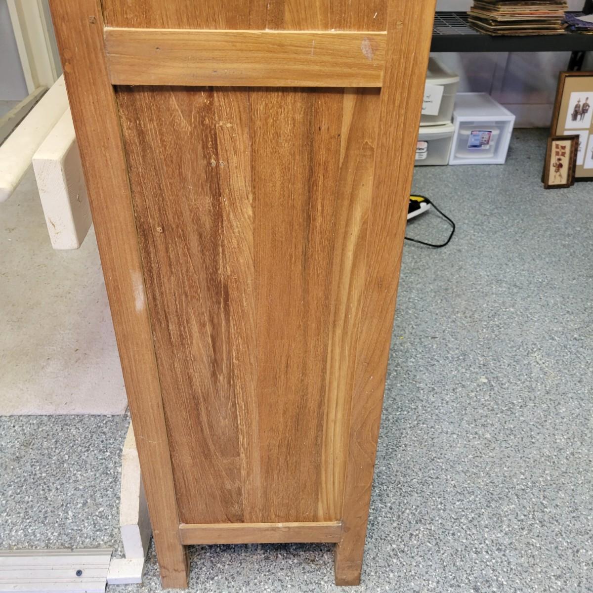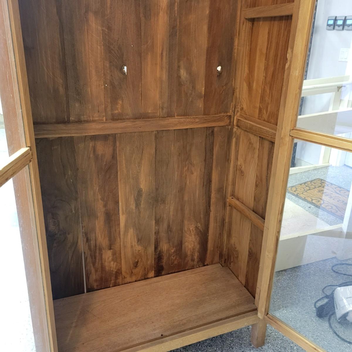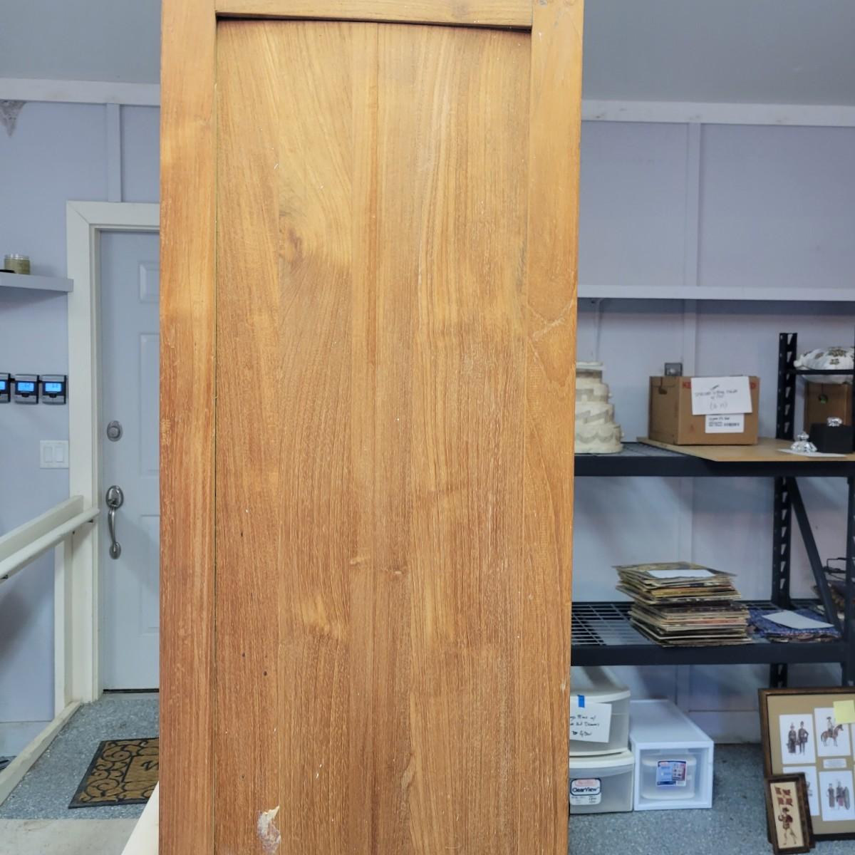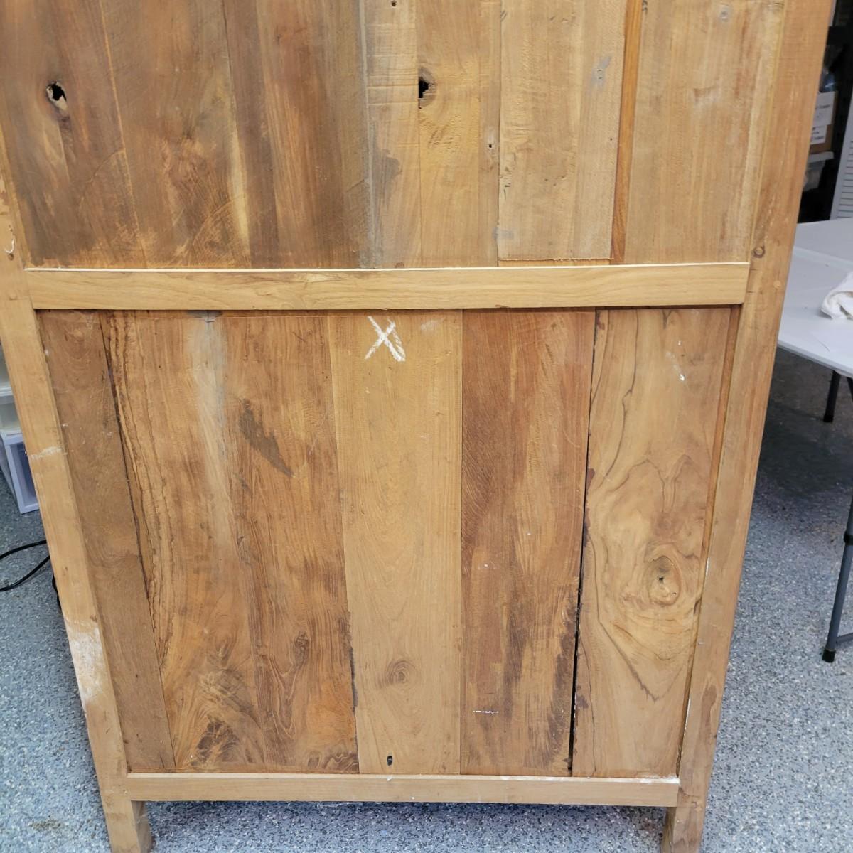 A rustic, solid wood cabinet with glass doors, that has some scratches and blemishes, and is missing its shelves. This cabinet measures approximately 40" x 16" x 79"H. Local pickup only. Winning bidder must bring assistance to help move and load this item due to its weight and/or size.