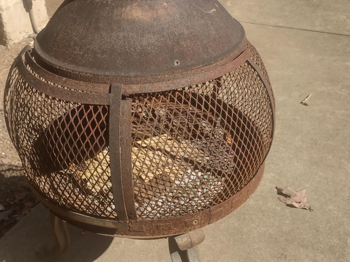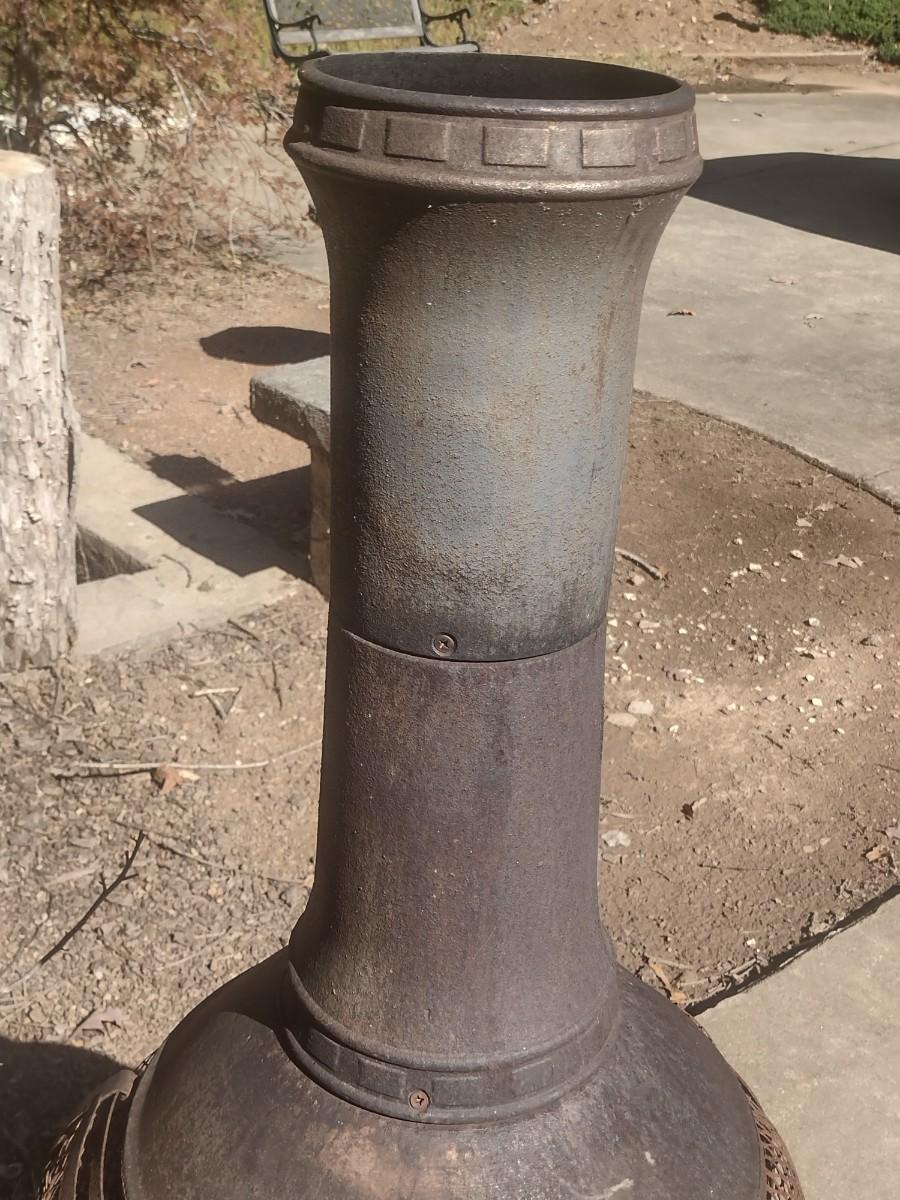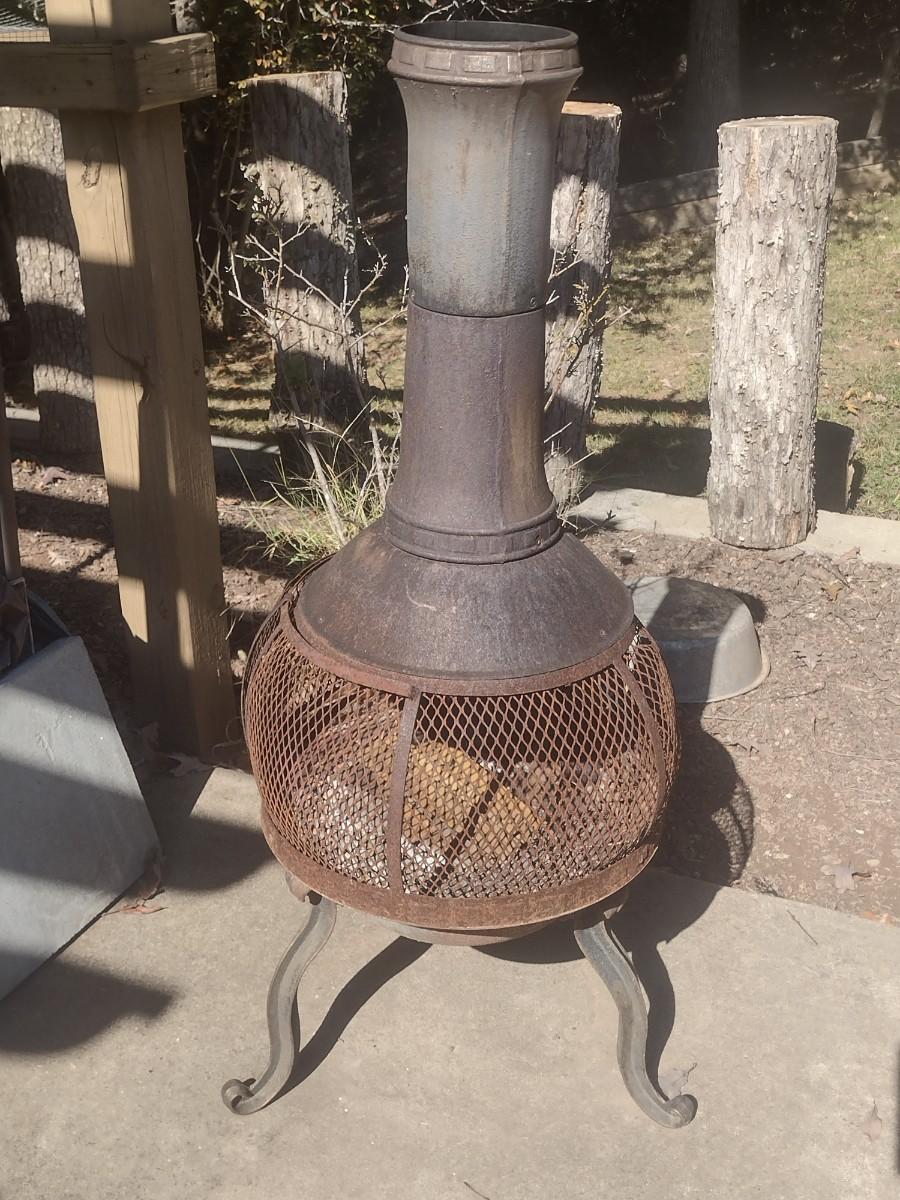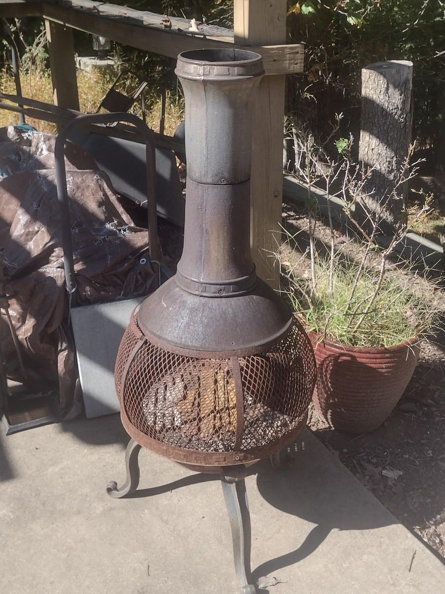 Rustic Cast Metal Wood Chimenea Fire Pit with Smokestack. Pit will need to be cleaned