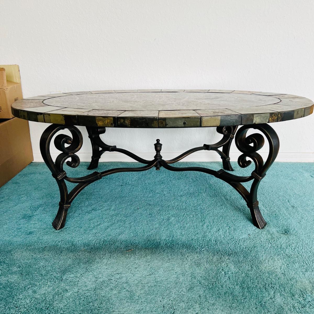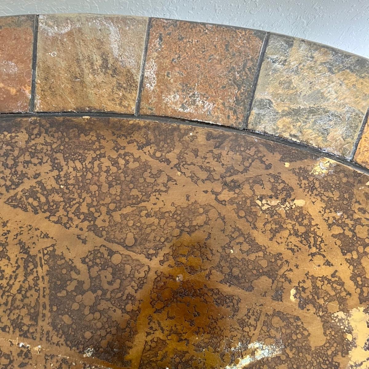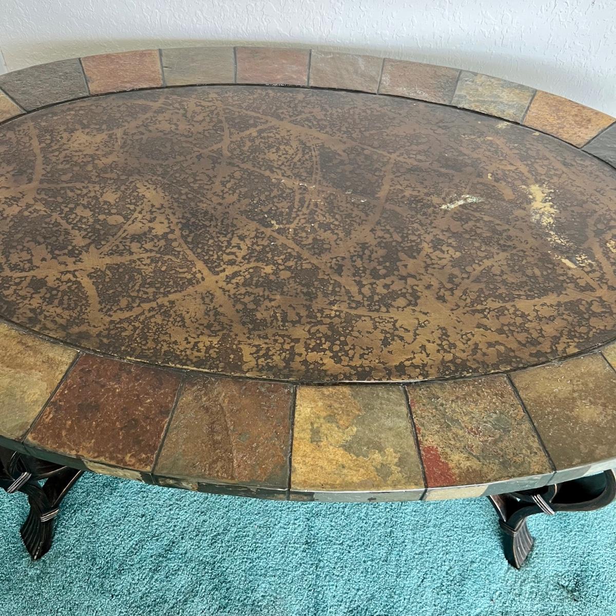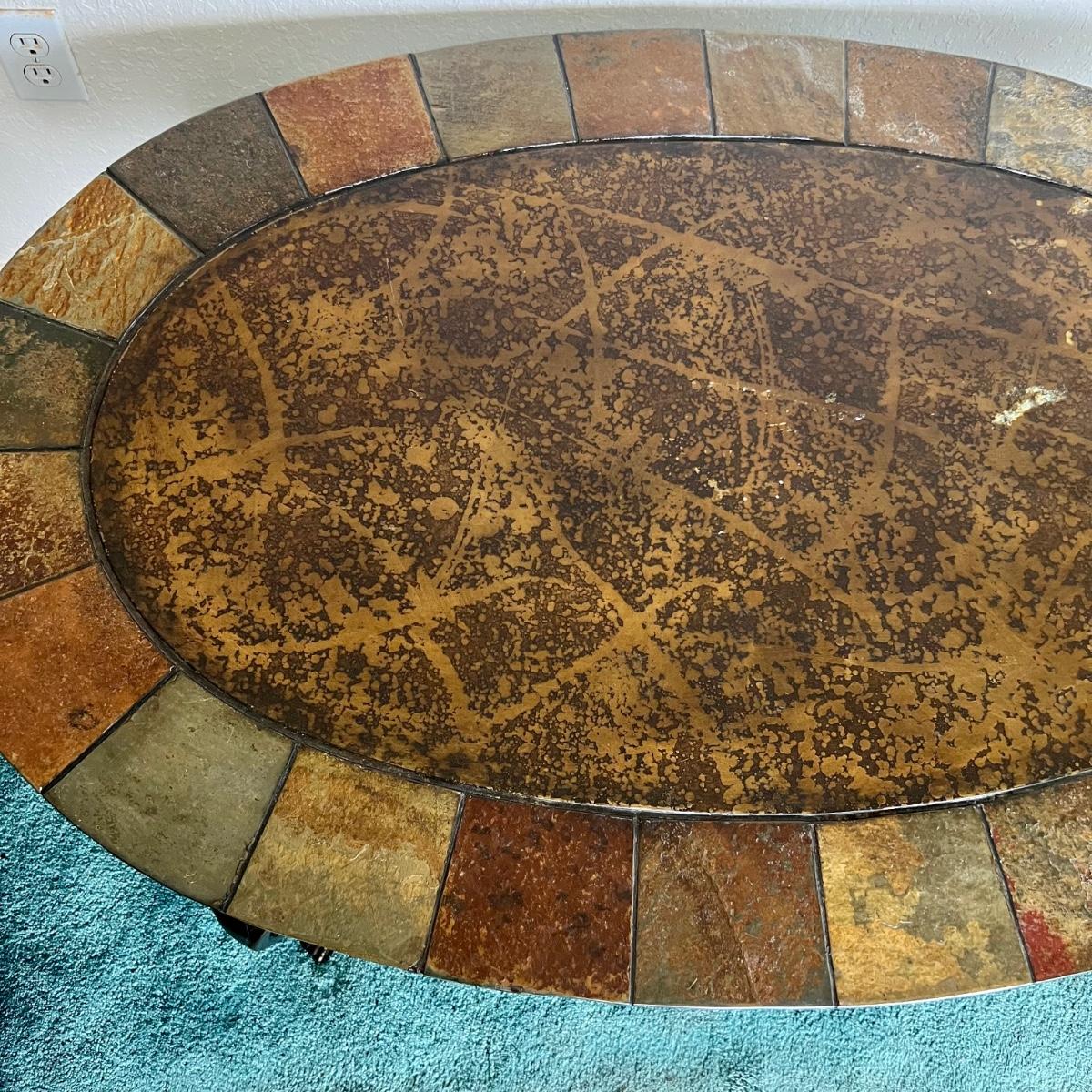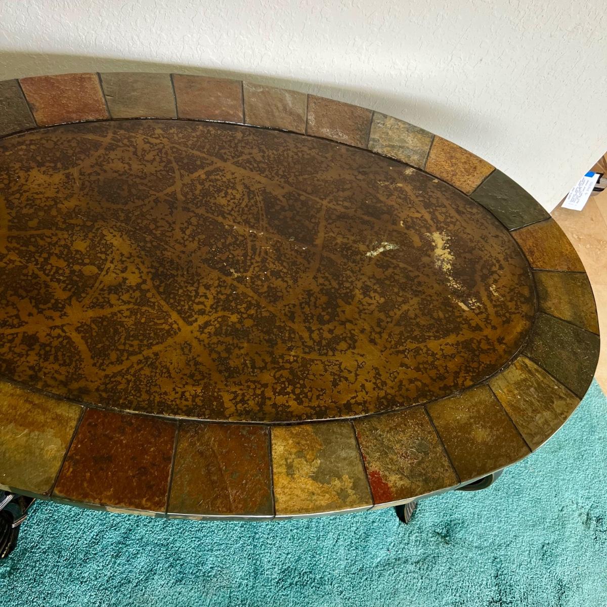 Rustic oval table with tile border. Dark brown with some green and rust coloring. Table is heavy and base looks like metal but believed to be made of resin. Some scuffing on top.