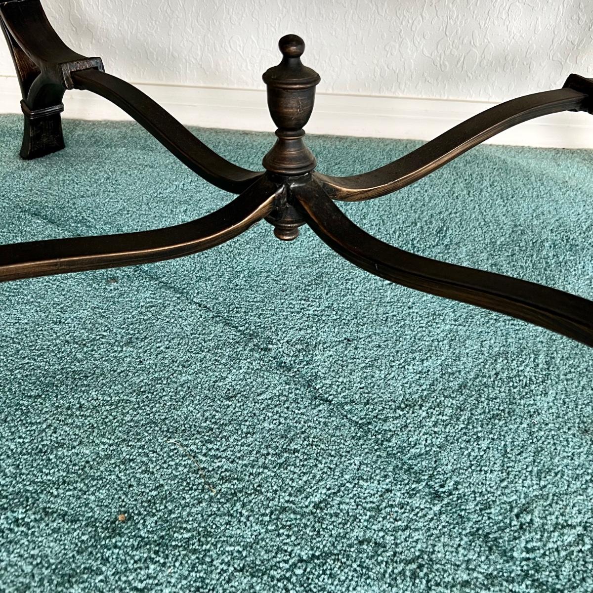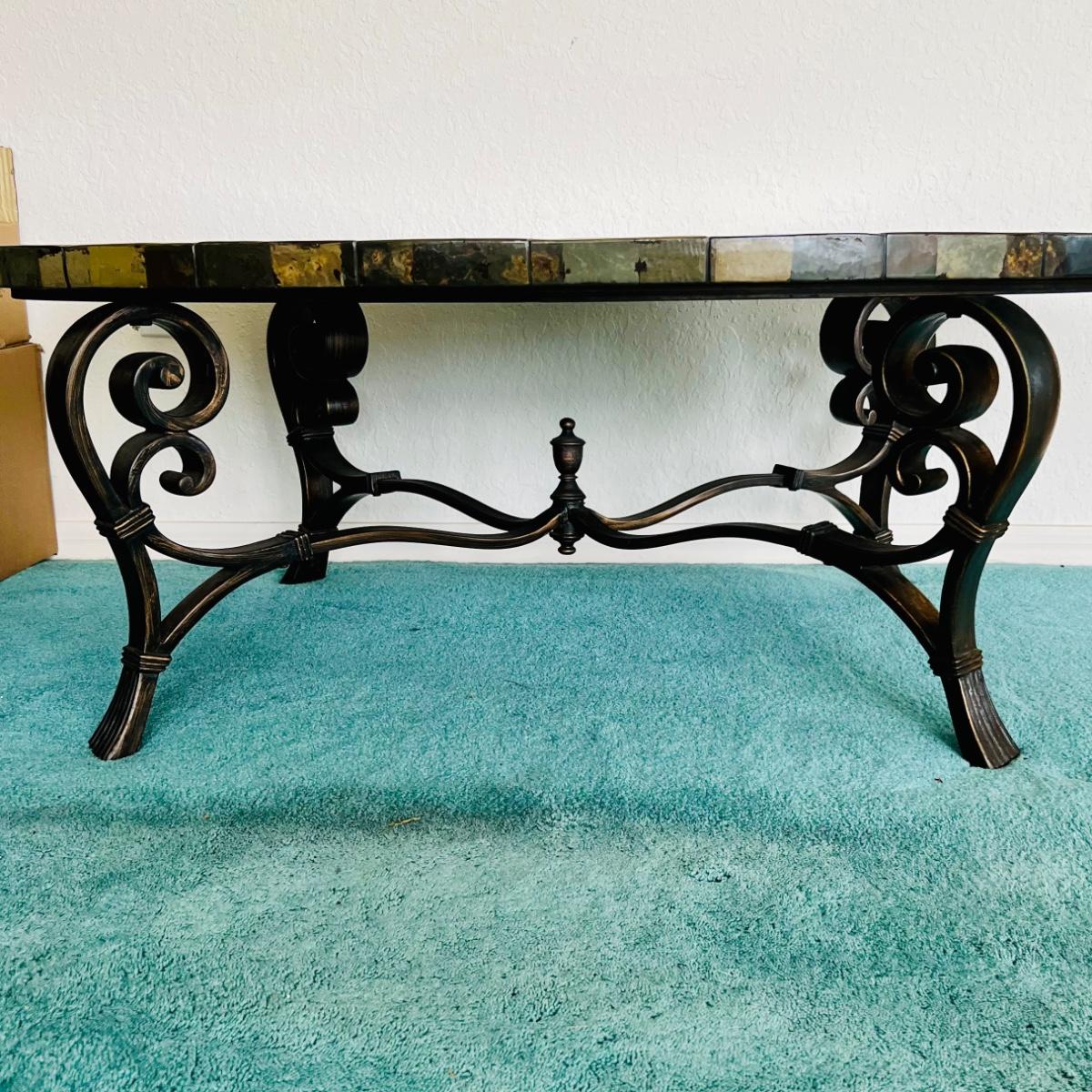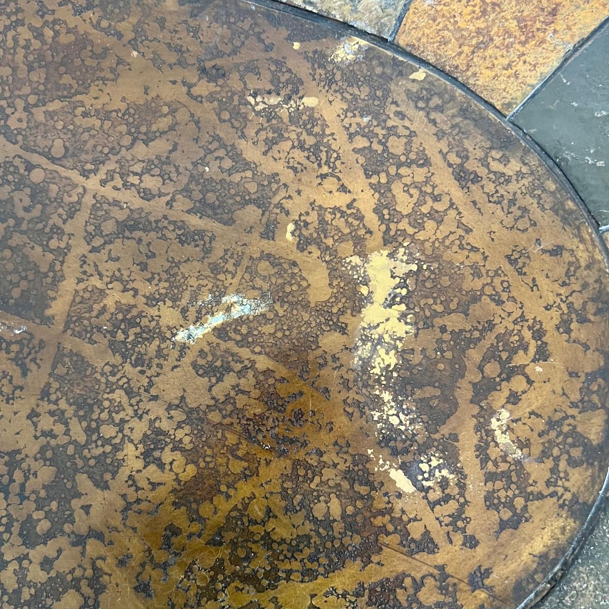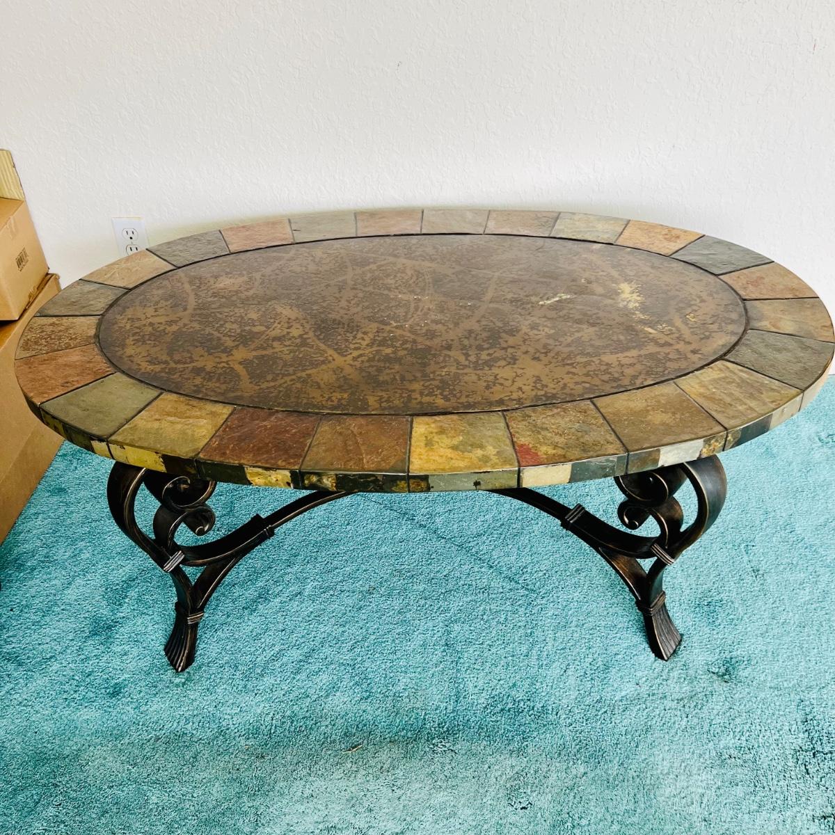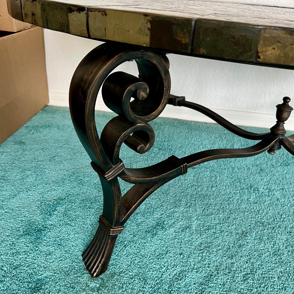 Rustic oval table with tile border. Dark brown with some green and rust coloring. Table is heavy and base looks like metal but believed to be made of resin. Some scuffing on top.