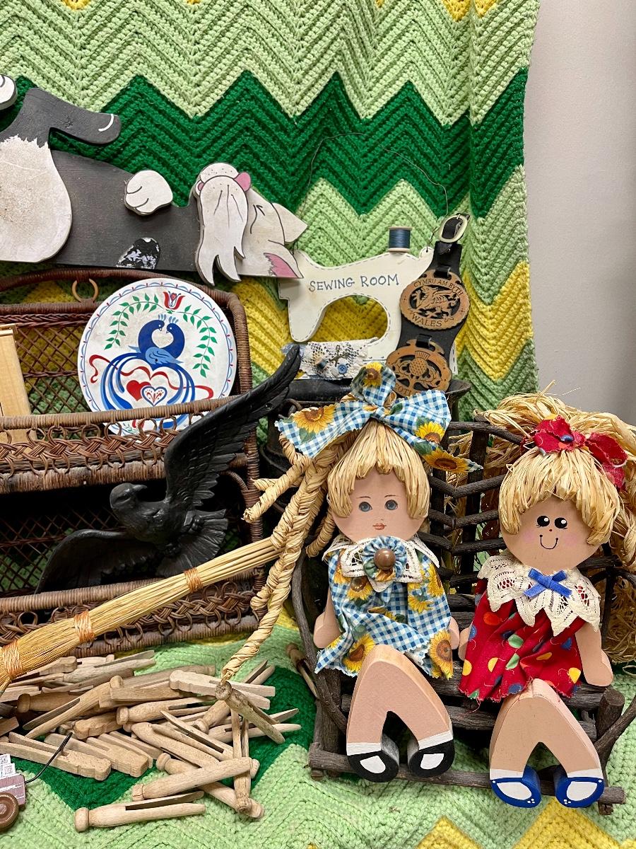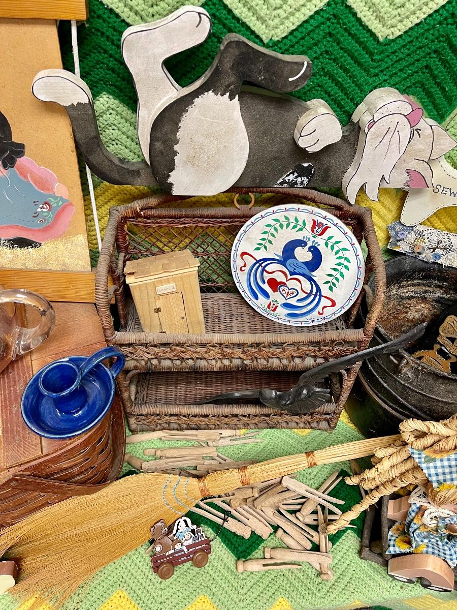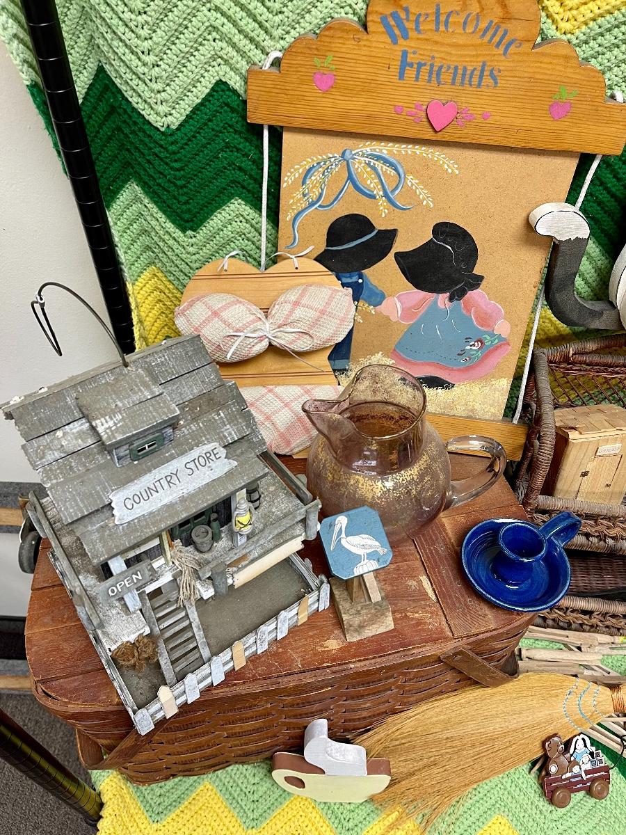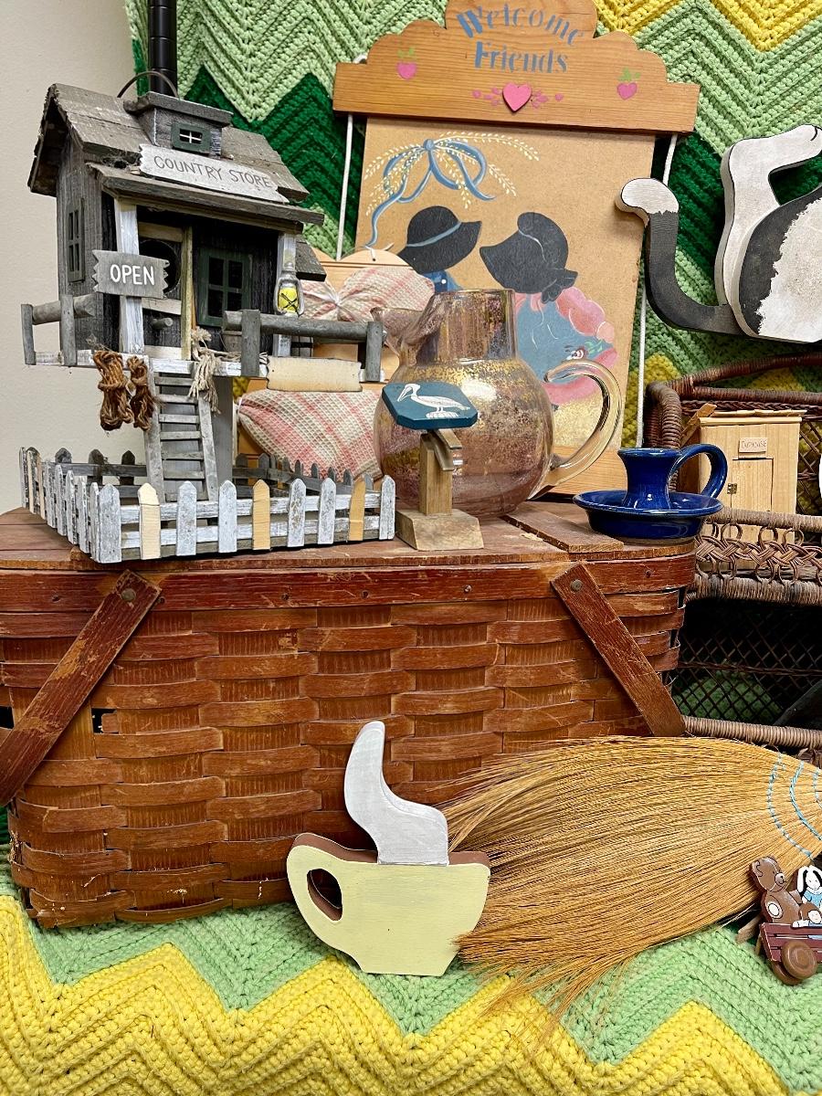 Rustic country decor lot Includes picnic basket, afghan, wicker display shelf, Two with drawls with wood bench, small outhouse, wood plaque, plastic eagle emblem, two cast iron pot’s stuck together, glass pitcher, blue ceramic candle holder, wood cat figurine, vintage wooden clothespins, etc